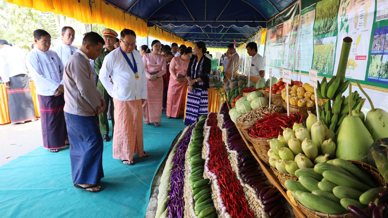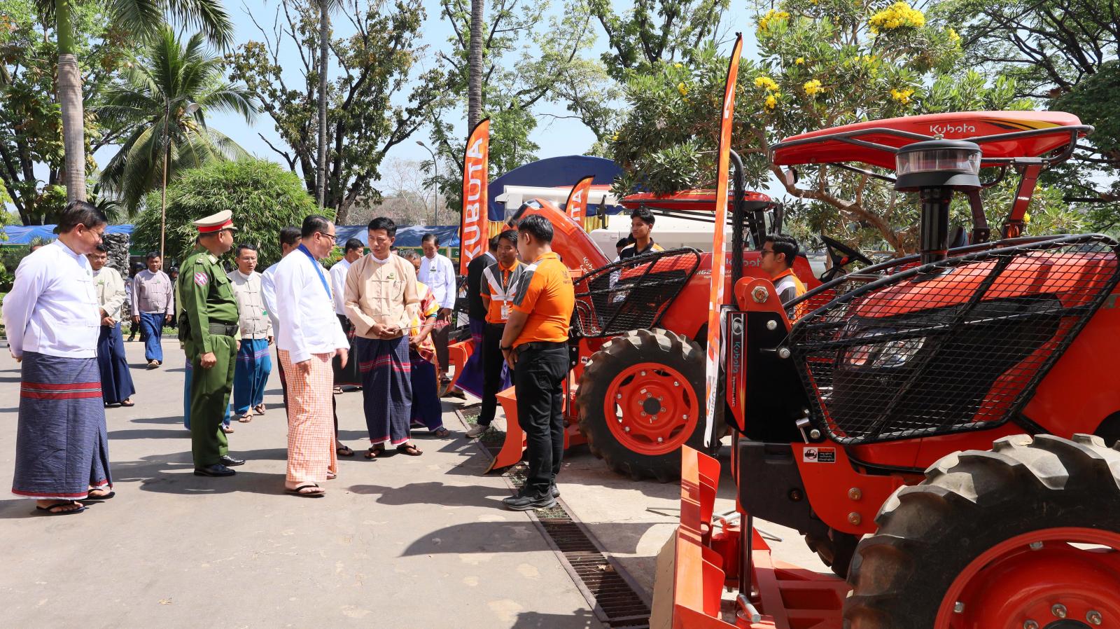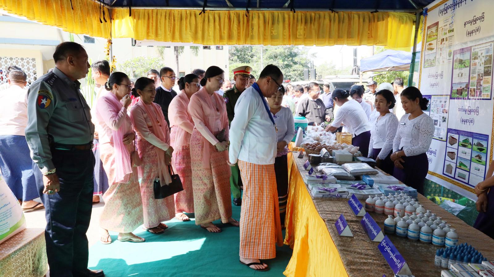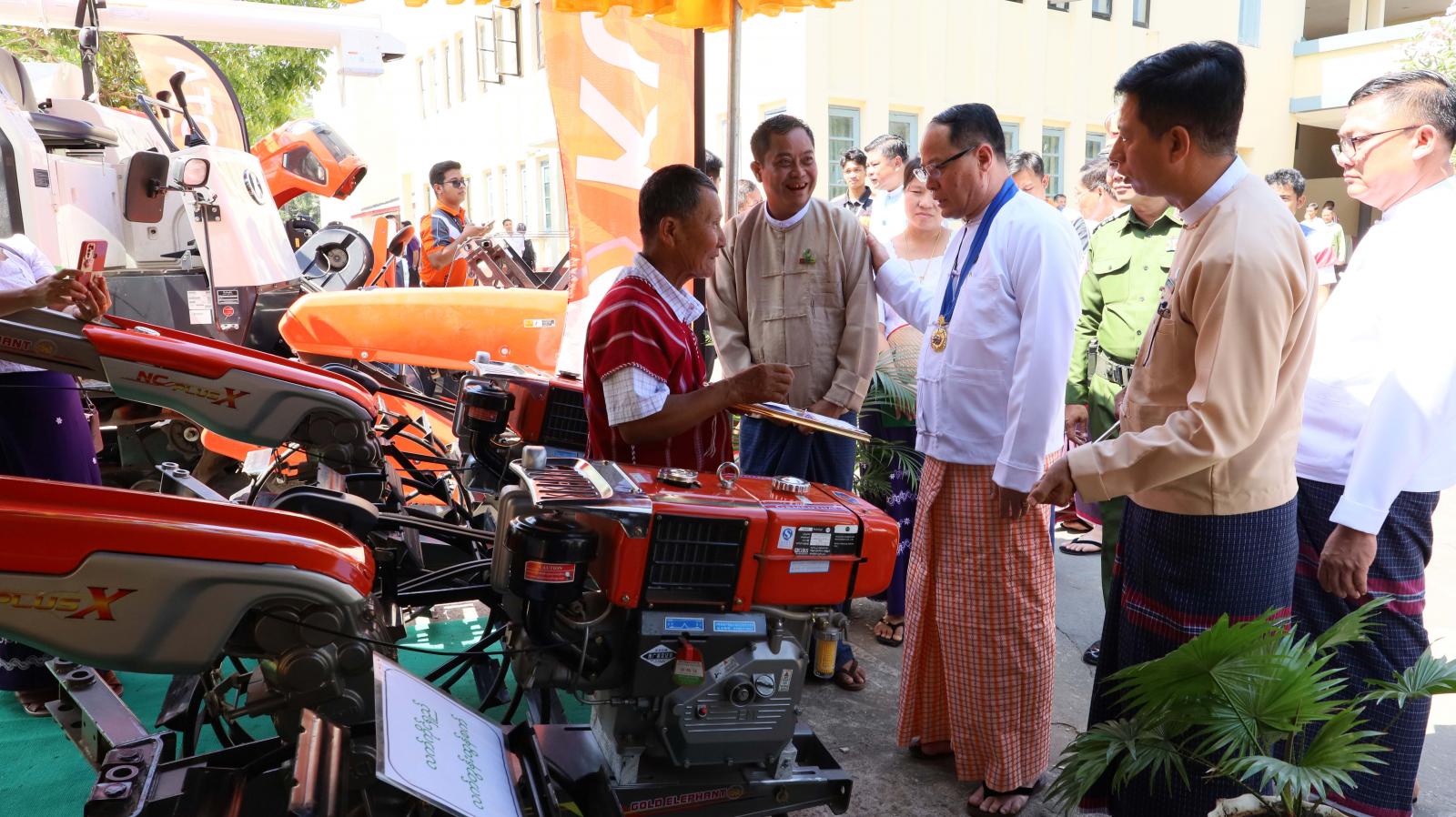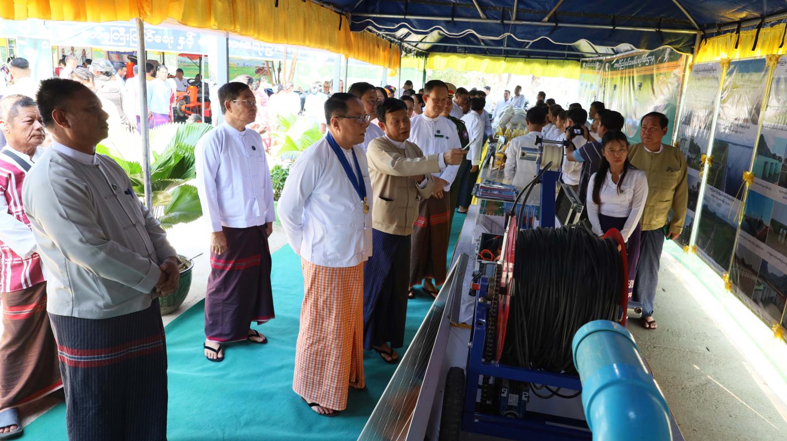 ထို့နောက် ပြည်နယ်ဝန်ကြီးချုပ်နှင့်တာဝန်ရှိသူများသည် ထူးချွန်ဆုရတောင်သူလယ်သမားဦးကြီးများနှင့် စုပေါင်းမှတ်တမ်းဓာတ်ပုံများရိုက်ကူးကြပြီး တစ်ဦးချင်းရင်းနှီးနွေးထွေးစွာတွေ့ဆုံနှုတ်ဆက်၍ အားပေးစကားများပြောကြားကာ ခင်းကျင်းပြသထားသော (၆၃)နှစ်မြောက် တောင်သူလယ်သမားနေ့ အခမ်းအနားတွင် ထူးချွန်ဆုရရှိ သောစိုက်ပျိုးမွေးမြူရေးတောင်သူများ၏မှတ်တမ်းများ၊ ပြည်နယ်မွေးမြူရေးနှင့်ကုသရေးဦးစီးဌာန၏ မြက်ဖြတ်စက်၊ အစာကြိတ်စက်နှင့် တိရစ္ဆာန်ထွက်ပစ္စည်းအရောင်းပြခန်း၊ စက်မှုကြီးကြပ်ရေးနှင့်စစ်ဆေးရေးဦးစီးဌာန၏ ဒေသတွင်းတပ်ဆင်ထုတ်လုပ်သည့် လယ်ယာသုံးစက်ကိရိယာပစ္စည်းများပြခန်း၊ သမဝါယမဦးစီးဌာန၏ ပြည်နယ်အတွင်း သမဝါယမအသင်းများ၏ ဆန်၊ ဆီ အစရှိသော စိုက်ပျိုးမွေးမြူရေးထုတ်ကုန်ပြခန်း၊ ဆည်မြောင်းနှင့်ရေအသုံးချမှုဦးစီးဌာန၏ ဒေသတွင်းစိုက်ပျိုးရေရှိရေးလုပ်ငန်းဆောင်ရွက်မှုပြခန်း၊ ငါးလုပ်ငန်းဦးစီးဌာန၏ ဒေသတွင်းမွေးမြူထွက်ရှိသော ငါးနှင့်ရေထွက်ပစ္စည်းပြခန်း၊ စိုက်ပျိုးရေးဦးစီးဌာန၏ စိုက်ပျိုးရေးထုတ်ကုန်နှင့်သီးနှံပြခန်း၊ သဘာဝမြေဩ ဇာများထုတ်ကုန်ပြခန်း၊ ကြေးတိုင်နှင့်မြေစာရင်းဦးစီးဌာန မြေယာဆိုင်ရာတိုင်းတာမှုပြခန်း၊ မြန်မာ့လယ်ယာဖွံ့ဖြိုးရေးဘဏ်၏ ဒေသတွင်းစိုက်ပျိုးစရိတ်ချေးငွေနှင့် MSME ဖွံ့ဖြိုးတိုးတက်ရေးချေးငွေဆိုင်ရာအသိပညာပေးပြခန်း၊ စက်မှုလယ်ယာဦးစီးဌာန၏ လယ်ယာသုံးစက်ကိရိယာအရောင်းပြခန်း၊ Kubota Co.,Ltd၏ လယ်ယာသုံးစက်ကိရိယာ အရောင်းပြခန်းစသည်ဖြင့် ဒေသတွင်းစိုက်ပျိုးမွေးမြူရေးထုတ်ကုန်နှင့် အသေးစား၊ အငယ်စား၊ အလတ်စားစက်မှုလက်မှုပြခန်းများကို လှည့်လည်ကြည့်ရှုအားပေး၍ တာဝန်ရှိသူများအား လိုအပ်သည်များမှာကြားခဲ့ကြောင်း သတင်းရရှိသည်။