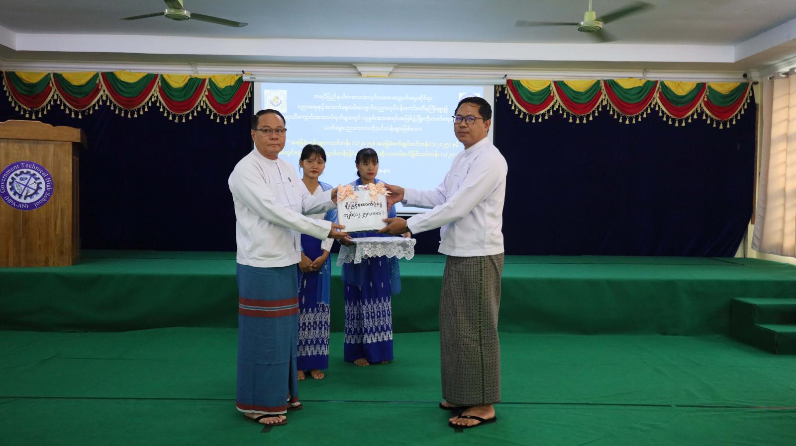 ထို့နောက် ပြည်နယ်ဝန်ကြီးချုပ်က သင်တန်းစရိတ်ချီးမြှင့်ငွေကျပ် ၁၂၂၅၈၀၀ဝိ/ (တစ်ရာနှစ်ဆယ့်နှစ်သိန်း ငါးသောင်းရှစ်ထောင်ကျပ်) ကို ကျောင်းအုပ်ကြီးထံ ပေးအပ်ချီးမြှင့်ခဲ့ပြီး သင်တန်းအတွက် သင်ထောက်ကူပစ္စည်းများကို သင်တန်းသားကိုယ်စားလှယ်များထံ ပေးအပ်ချီးမြှင့်ကာ စုပေါင်းမှတ်တမ်းဓာတ်ပုံများ ရိုက်ကူးခဲ့ကြသည်။