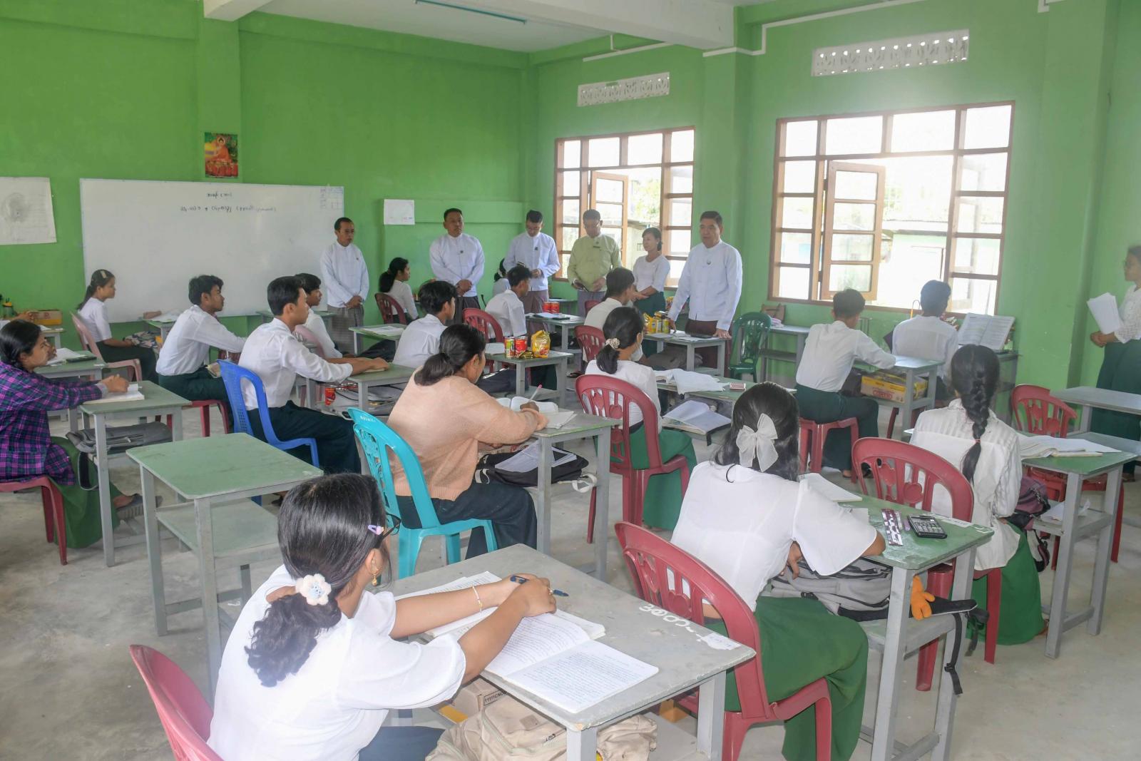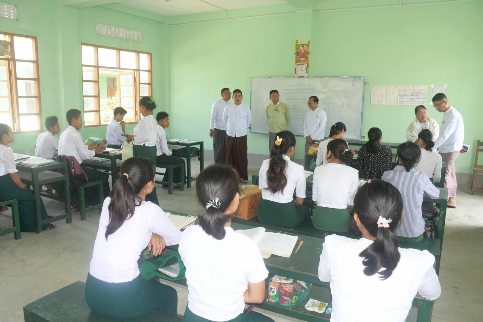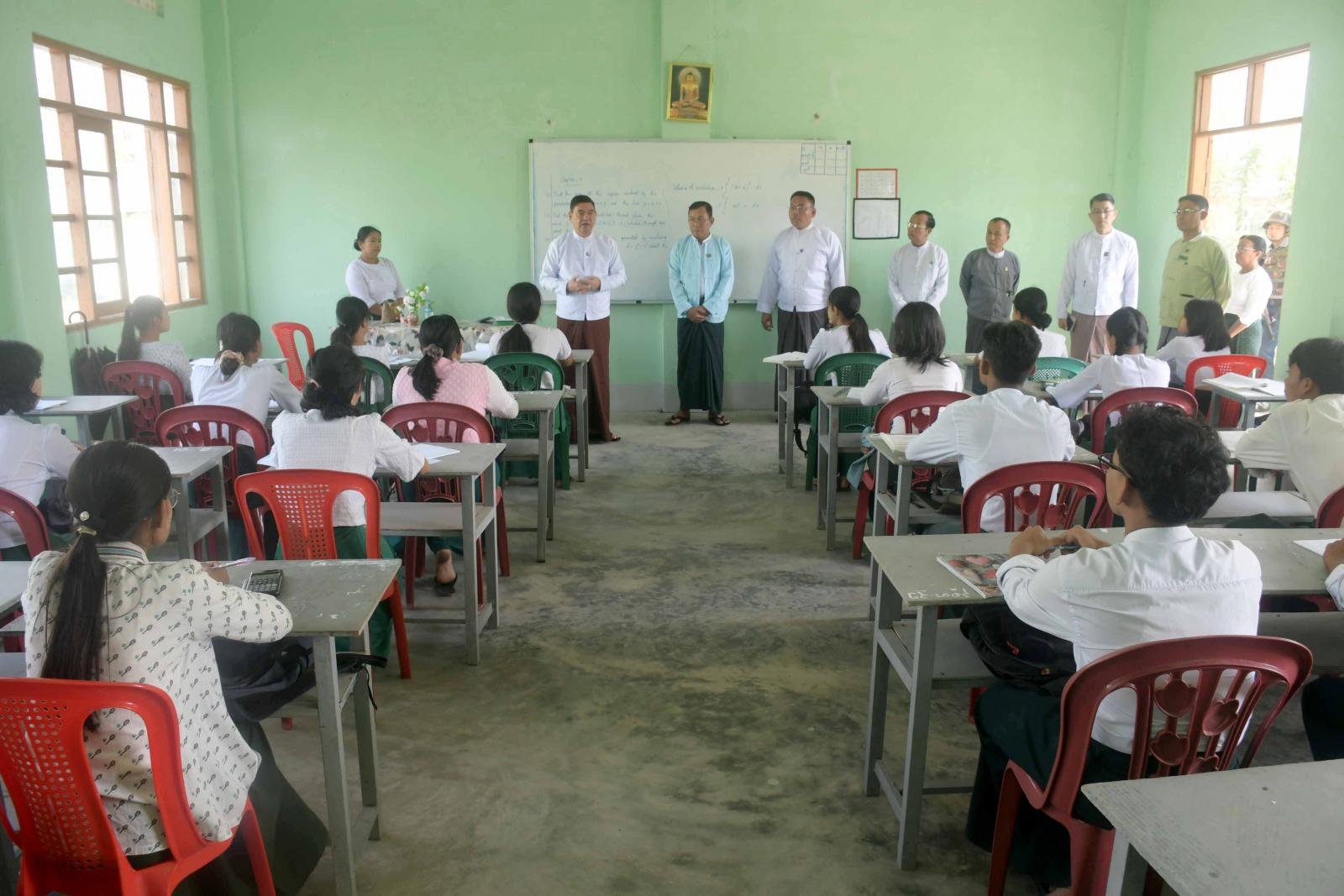 ဆက်လက်၍ ပြည်နယ်ဝန်ကြီးချုပ်နှင့်အဖွဲ့သည်အဆိုပါကျောင်း၌ တက္ကသိုလ်ဝင်စာမေးပွဲ ဖြေဆိုကြမည့် ကျောင်းသား၊ ကျောင်းသူများအား ဆရာ၊ ဆရာမများက အနီးကပ်ပညာ သင်ကြားနေမှုကို လှည့်လည်ကြည့်ရှုအားပေးကြပြီး ပြည်နယ်ဝန်ကြီးချုပ်က ကျောင်းသား၊ ကျောင်းသူများအနေဖြင့် လာမည့်တက္ကသိုလ်ဝင်စာမေးပွဲဖြေဆိုရန်အတွက် ဘာသာရပ်အလိုက်ကျက်မှတ်ပြီး စာမေးပွဲဖြေဆိုရန် အသင့်ဖြစ်နေကြမည်ဟု ယုံကြည်ပါကြောင်း၊ ဘာသာရပ်အလိုက် ဆရာ၊ ဆရာမများကလည်း သင်ကြားပြီးကြပြီဖြစ်ကြောင်း၊ ကျောင်းသား၊ ကျောင်းသူများအနေဖြင့် စာမေးပွဲအတွက် အသင့်ဖြစ်နေရမည့်အချိန်ဖြစ်ကြောင်း၊ မိဘများ၏ ဂုဏ်ကျေးဇူး၊ ဆရာ၊ ဆရာများ၏ ဂုဏ်ကျေးဇူးကို စာမေးပွဲတွင် အကောင်းဆုံးဖြေဆိုခြင်းဖြင့် ကျေးဇူးဆပ်ရမည်ဖြစ်ကြောင်း၊ မိမိကိုယ်တိုင်ကြိုးစားမှ အောင်မြင်မှုပန်းတိုင်ကို ရောက်ရှိနိုင်မည်ဖြစ်ကြောင်း၊ ပညာရေးသည် နိုင်ငံတစ်ခု၊ ပြည်နယ်တစ်ခု၊ ဒေသတစ်ခု၏ အကောင်းဆုံးရင်းနှီးမြှုပ်နှံမှုပင်ဖြစ်ကြောင်း၊ ကျောင်းသား၊ ကျောင်းသူများသည် နောင်တစ်ခေတ်တွင် နိုင်ငံတော်၏ တာဝန်များကို ထမ်းဆောင်ကြမည့်သူများဖြစ်ကြောင်း၊ ထို့ကြောင့် နိုင်ငံတော်ကဗလငါးတန်နှင့် ပြည့်စုံသော မျိုးဆက်သစ်လူငယ်များပေါ်ထွန်းလာအောင် ပညာရေးတွင် ရင်းနှီးမြှုပ်နှံမှုများများစွာဆောင်ရွက်ပေးလျက်ရှိကြောင်း၊ မိမိတို့ ရခိုင်ပြည်နယ်အစိုးရအဖွဲ့အနေဖြင့် လည်း ကျောင်းသား၊ ကျောင်းသူများတက္ကသိုလ်ဝင်စာမေးပွဲကို အေးချမ်းစွာဖြေဆိုနိုင်ရန်အတွက် အသားဘူး၊ ခေါက်ဆွဲခြောက်၊ အသီးဖျော်ရည်၊ ကော်ဖီမစ်နှင့် စာကြည့်မီးအိမ်များ အားပေးအပ်ချီးမြှင့် ပေးလျက်ရှိကြောင်း၊ ကျောင်းသား၊ ကျောင်းသူများအနေဖြင့် ယခုအချိန်တွင် စာမေးပွဲကို အောင်မြင်စွာဖြေဆိုနိုင်ရန် ကြိုးစားဆောင်ရွက်ကြရမည်ဖြစ်ကြောင်း၊ မိဘများနှင့် ဆရာ၊ ဆရာမများ ကလည်း ကျောင်းသား၊ ကျောင်းသူများအတွက် လိုအပ်သည့်အရာများကို ဖြည့်ဆည်းဆောင်ရွက်ပေးကြမည် ဖြစ်ကြောင်း၊ အထူးသဖြင့် စာမေးပွဲဖြေဆိုရန် နီးကပ်လာပြီဖြစ်သည့်အတွက်ကျန်းမာရေးကို အထူးဂရုစိုက်၍ နေထိုင်သွားကြမည်ဖြစ်ကြောင်းနှင့် စာမေးပွဲတွင်ဘာသာရပ်အလိုက် အောင်အောင်မြင်မြင်ဖြေဆိုနိုင်ကြပြီး အမှတ်ကောင်း ကောင်းဖြင့် အောင်မြင်သူများဖြစ်နိုင်ကြပါစေကြောင်း ပြောကြားခဲ့သည်။
