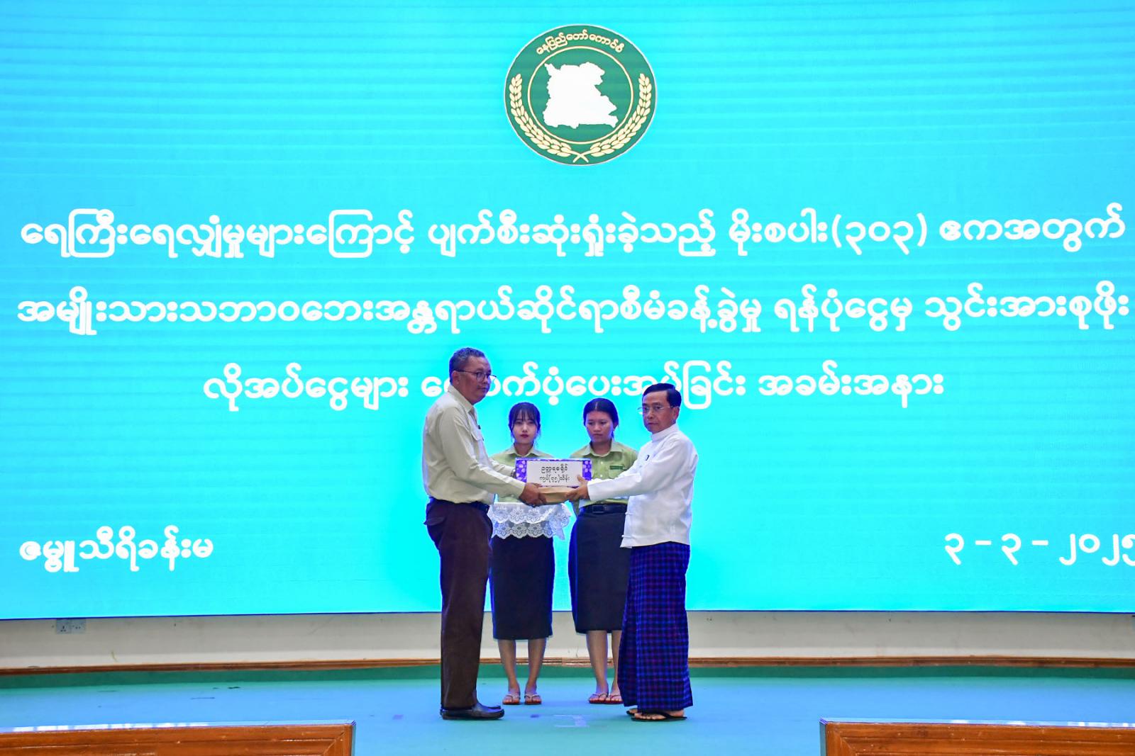 ယင်းနောက် နေပြည်တော်ကောင်စီဥက္ကဋ္ဌ ဦးသန်းထွန်းဦးက နေပြည်တော်အတွင်း ရေကြီးရေလျှံမှုများကြောင့် ပျက်စီးဆုံးရှုံးခဲ့သည့် မိုးစပါး ၃၀၃ ဧကအတွက် အမျိုးသားသဘာဝဘေးအန္တရာယ်ဆိုင်ရာ စီမံခန့်ခွဲမှုရန်ပုံငွေမှ ထောက်ပံ့ပေးအပ်သည့် သွင်းအားစုဖိုးငွေများကို ပေးအပ်ရာ ခရိုင်စီမံအုပ်ချုပ်ရေးအဖွဲ့ဥက္ကဋ္ဌများက လက်ခံရယူခဲ့ကြကြောင်း သိရသည်။