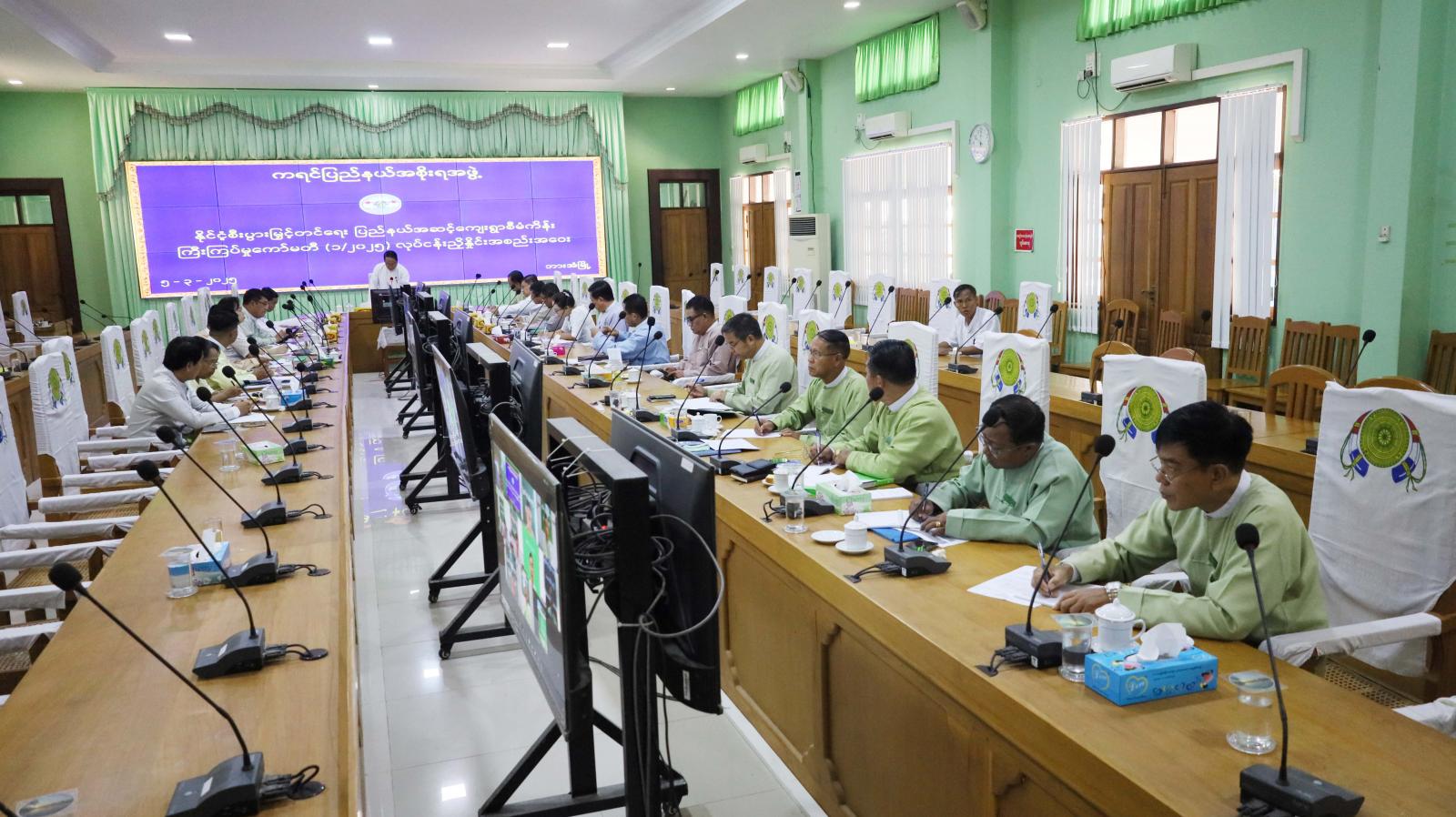 ထို့နောက် ပြည်နယ်အဆင့်ဌာနဆိုင်ရာအကြီးအကဲများက ယခင်အပတ်အစည်းအဝေးဆုံးဖြတ်ချက်များအပေါ် လိုက်နာဆောင်ရွက်ပြီးစီးမှုအခြေအနေများကို ရှင်းလင်းတင်ပြကြပြီး ပြည်နယ် စီးပွားရေးရာဝန်ကြီး ဦးစောခင်မောင်မြင့်က မြို့နယ်များအလိုက်ချေးငွေထုတ်ချေးပေးနိုင်မှု၊ အတိုး/ အရင်းပြန်လည်ပေးဆပ်မှုနှင့် ချေးငွေထပ်မံရယူရန် အဆိုပြုတင်ပြလာမှုအခြေအနေများကို ရှင်းလင်းတင်ပြကာ ပြည်နယ်အဆင့်ဌာနဆိုင်ရာများက နိုင်ငံ့စီးပွားမြှင့်တင်ရေးရန်ပုံငွေမှ ချေးငွေရယူထားပြီး မိုးစပါး၊ မိုးသီးနှံနှင့်ဆောင်းသီးနှံများ စိုက်ပျိုးထုတ်လုပ်မှုအခြေအနေ၊ သီးနှံအလိုက် ချေးငွေထုတ်ချေးပေးထားမှု၊ သမဝါယမအသင်းများ၏ချေးငွေထုတ်ချေးမှု၊ ရန်ပုံငွေဖြင့် ပြည်နယ် အတွင်း အသား၊ ငါး၊ ဥထုတ်လုပ်မှု၊ စားသုံးမှု၊ ပိုလျှံမှု၊ ချေးငွေထုတ်ချေးခွင့်အဆိုပြုတင်ပြထားမှုများကို ဆွေးနွေးတင်ပြကြသည်။