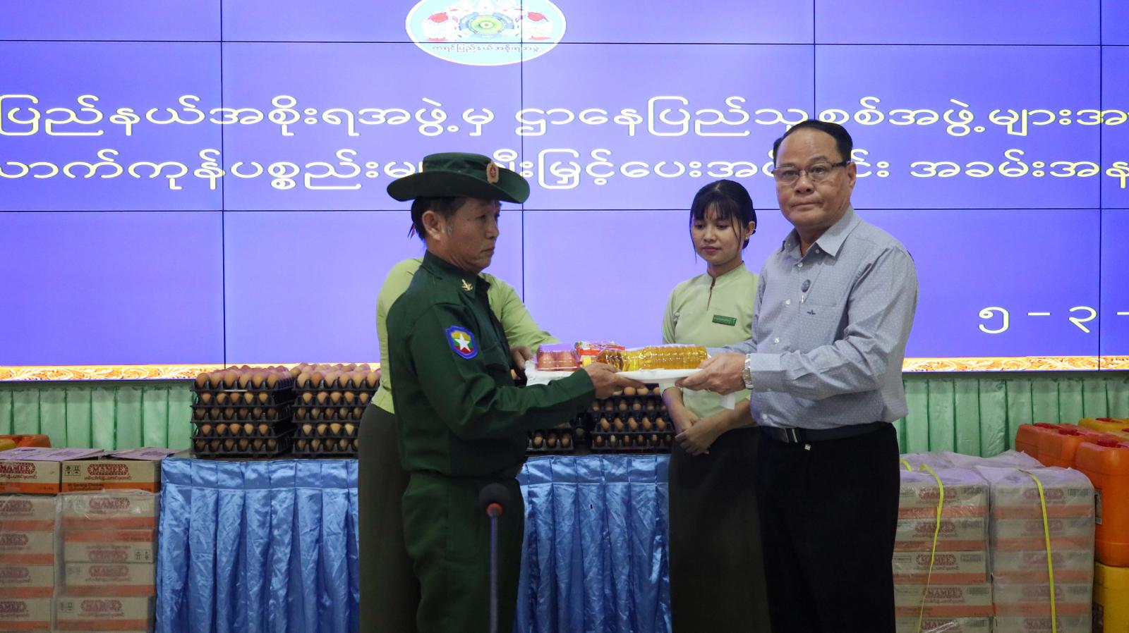 ထို့နောက် ပြည်နယ်ဝန်ကြီးချုပ်နှင့်တာဝန်ရှိသူများက ဌာနေပြည်သူ့စစ်အဖွဲ့များအား စုစုပေါင်း ငွေကျပ် ၁၀၂၆၂၅၀ဝိ/- (တစ်ရာ့နှစ်သိန်းခြောက်သောင်းနှစ်ထောင်ငါးရာကျပ်)တန်ဖိုးရှိ ဆန်၊ ဆီ၊ ကြက်ဥ၊ ခေါက်ဆွဲခြောက်များကို ချီးမြှင့်ပေးအပ်ပြီး အရှေ့တောင်တိုင်းစစ်ဌာနချုပ် ဒုတိယတိုင်းမှူးက လိုအပ်သည်များမှာကြားကာ ဌာနေပြည်သူ့စစ်အဖွဲ့များကိုယ်စားအဖွဲ့ဝင်တစ်ဦးက ကျေးဇူးတင်စကား ပြန်လည်ပြောကြားသည်။
