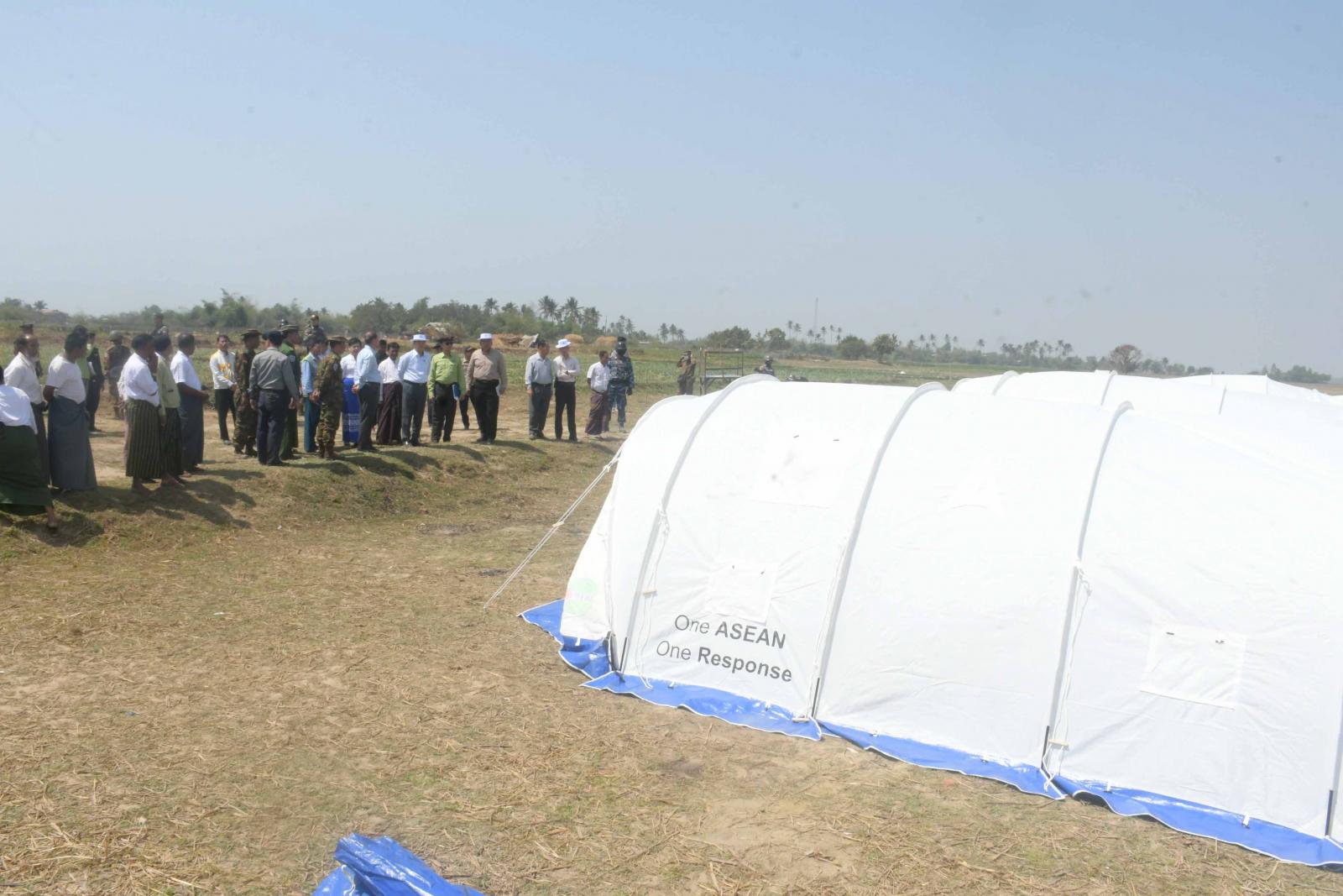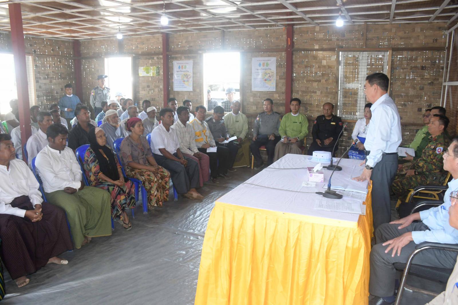 ဆက်လက်၍ ပြည်နယ်ဝန်ကြီးချုပ်နှင့်အဖွဲ့သည် စခန်းတာဝန်ခံရုံး၌ မီးဘေးသင့်ပြည်သူများနှင့် တွေ့ဆုံကြရာ ရခိုင်ပြည်နယ်ဝန်ကြီးချုပ် ဦးထိန်လင်းက ခေါင်းဒုက္ကာ (၂) IDP စခန်းတွင် မီးလောင်မှုဖြစ်ပွားသည့် ဖြစ်စဉ်သတင်းရလျင်ရချင်း၊ နယ်မြေခံတပ်မတော်သားများ၊ ရဲတပ်ဖွဲ့ဝင်များနှင့် မီးသတ်တပ်ဖွဲ့ဝင်များက သွားရောက်ကာ မီးငြိမ်းသတ်ခဲ့ကြကြောင်း၊ ထို့ကြောင့် ပျက်စီးဆုံးရှုံးမှုအနည်းဆုံးဖြစ်ခဲ့ခြင်းဖြစ်ကြောင်း၊ အလားတူ ထိုနေ့မှာပင် မိမိတို့ကိုယ်တိုင်လာရောက်ပြီး အချိန်မီထောက်ပံ့ပေးခြင်း၊ မီးလောင်ပြင်ရှင်းလင်းခြင်းများဆောင်ရွက်နိုင်အောင်စီမံပေးခဲ့ကြောင်း၊ နောက်နေ့တွင် အနောက်ပိုင်း တိုင်းစစ်ဌာနချုပ် တိုင်းမှူးနှင့်အတူ ကွင်းဆင်းပြီး မီးလောင်ပြင်အား နယ်မြေခံတပ်မတော်သားများ၊ ရဲတပ်ဖွဲ့ဝင်များနှင့် ဌာနဆိုင်ရာပူးပေါင်းအဖွဲ့များက ရှင်းလင်းဆောင်ရွက်နေမှုကို ကြည့်ရှုစစ်ဆေး ကြပြီး ယာယီမိုးကာတဲများ တည်ဆောက်ပေးခဲ့ကြကြောင်း၊ ထိုသို့ဆောင်ရွက်ခြင်းသည် အားလုံးပူးပေါင်းပါဝင်ဆောင်ရွက်ခြင်းဖြစ် ကြောင်း၊ မီးဘေးသင့်ပြည်သူများအနေဖြင့်လည်း နောင်တွင် ယခုကဲ့သို့ဖြစ်စဉ်များမဖြစ်ရအောင် စည်းကမ်းတကျနေထိုင်သွားကြရမည်ဖြစ်ကြောင်း၊ ယနေ့တွင် ဒုတိယဝန်ကြီးနှင့်အဖွဲ့က လိုအပ်သောထောက်ပံ့ပစ္စည်းများပေးနိုင်ရေး၊ အဆောက်အဦများပြန်လည်တည် ဆောက်ပေးနိုင်ရေးနှင့် လိုအပ်သည်များကို စီမံဆောင်ရွက်ပေးနိုင်ရေး လာရောက်ကြခြင်းဖြစ်ကြောင်း၊ ယာယီနေထိုင် စဉ်ကာလအတွင်း အခက်အခဲရှိသော်လည်း တစ်ဦးနှင့်တစ်ဦးရိုင်းပင်းကူညီပြီး စည်းကမ်းတကျနေထိုင်ကြရန်လိုကြောင်း၊ ချက်ပြုတ်ရေးအတွက်လည်း နေရာများ စနစ်တကျစီစဉ်ပေးသွားမည်ဖြစ်ကြောင်း၊ ကျန်းမာရေးကိုလည်း ဂရုစိုက်နေထိုင်ကြရန်လိုကြောင်း၊ အလားတူ သောက်သုံးရေကိုလည်း စနစ်တကျသုံးစွဲရန်လိုကြောင်းနှင့် စခန်းအတွင်းသတ်မှတ်ထားသော စည်းကမ်း၊ စည်းမျဉ်းများနှင့်အညီ နေထိုင်သွားကြရန်ပြောကြားသည်။