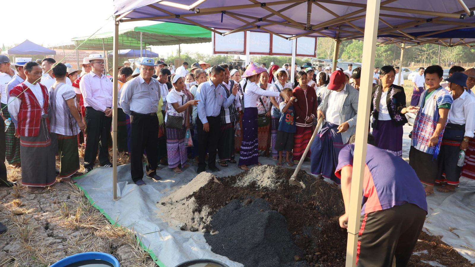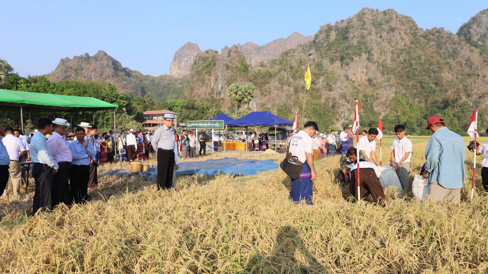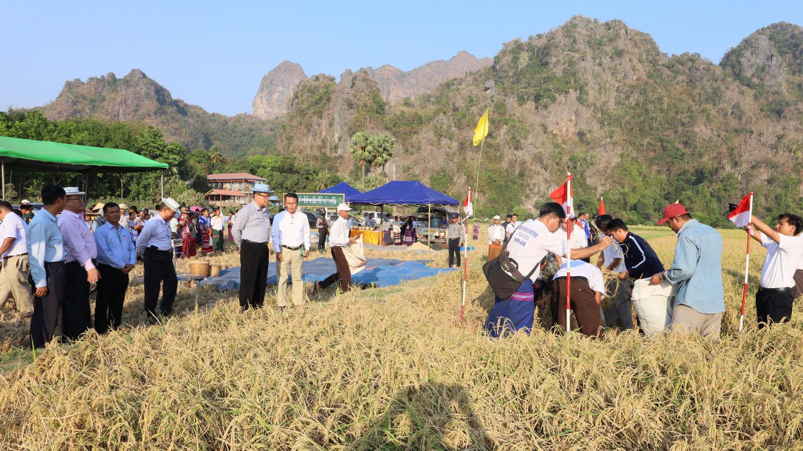 ထို့နောက် ပြည်နယ်ဝန်ကြီးချုပ်၊ ပြည်နယ်တရားလွှတ်တော်တရားသူကြီးချုပ်၊ ပြည်နယ်အစိုးရအဖွဲ့ဝင်များ၊ ဌာနဆိုင်ရာများနှင့် တောင်သူ လယ်သမားဦးကြီးများသည် နွေစပါးအထွက်နှုန်း မှန်ကန်စွာရရှိနိုင်ရေး စိုက်ပျိုးပြီးစီးသည့်ဧကများအနက် ကိုယ်စားပြုအလွှာ(ကောင်း)ကို ကိုယ်စားပြုသော ဆင်းသုခနွေစပါးစိုက်ခင်းကို မြေစာရင်း ဦးစီးဌာနမှဝန်ထမ်းများက(၆ ဒသမ ၆ ပေ x ၆ ဒသမ ၆ ပေ) ပတ်လည် ဧရိယာ ၀ ဒသမ ၀၀၁ ဧက စံကွက်သုံးကွက်အား စံကွက်ရိတ်သိမ်းခြင်း၊ အမှတ်(၂၀) ဘားအံစက်မှုလယ်ယာဦးစီးဌာနမှ ကူဘိုတာရိတ်သိမ်းခြွေလှေ့စက်ဖြင့် ရိတ်သိမ်းခြွေလှေ့သရုပ်ပြသခြင်း၊ စိုက်ပျိုးရေးဦးစီးဌာနမှဝန်ထမ်းများက စူပါအီးအမ်ဘိုကာရှီမြေဆွေးပုံ ပြုလုပ်ခြင်း ကွင်းသရုပ်ပြပွဲနှင့် ရိတ်သိမ်းပြီးနွေစပါးများအား ဝန်ထမ်းများက ချိန်တွယ်တိုင်းတာခြင်းတို့ကို ကြည့်ရှုအားပေးခဲ့ကြပြီး ပြည်နယ်ဝန်ကြီးချုပ်က တာဝန်ရှိသူများအား လိုအပ်သည်များ မှာကြားခဲ့သည်။