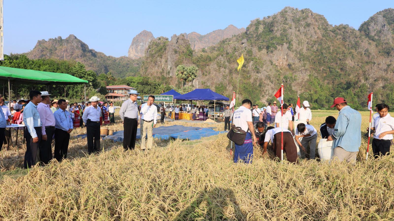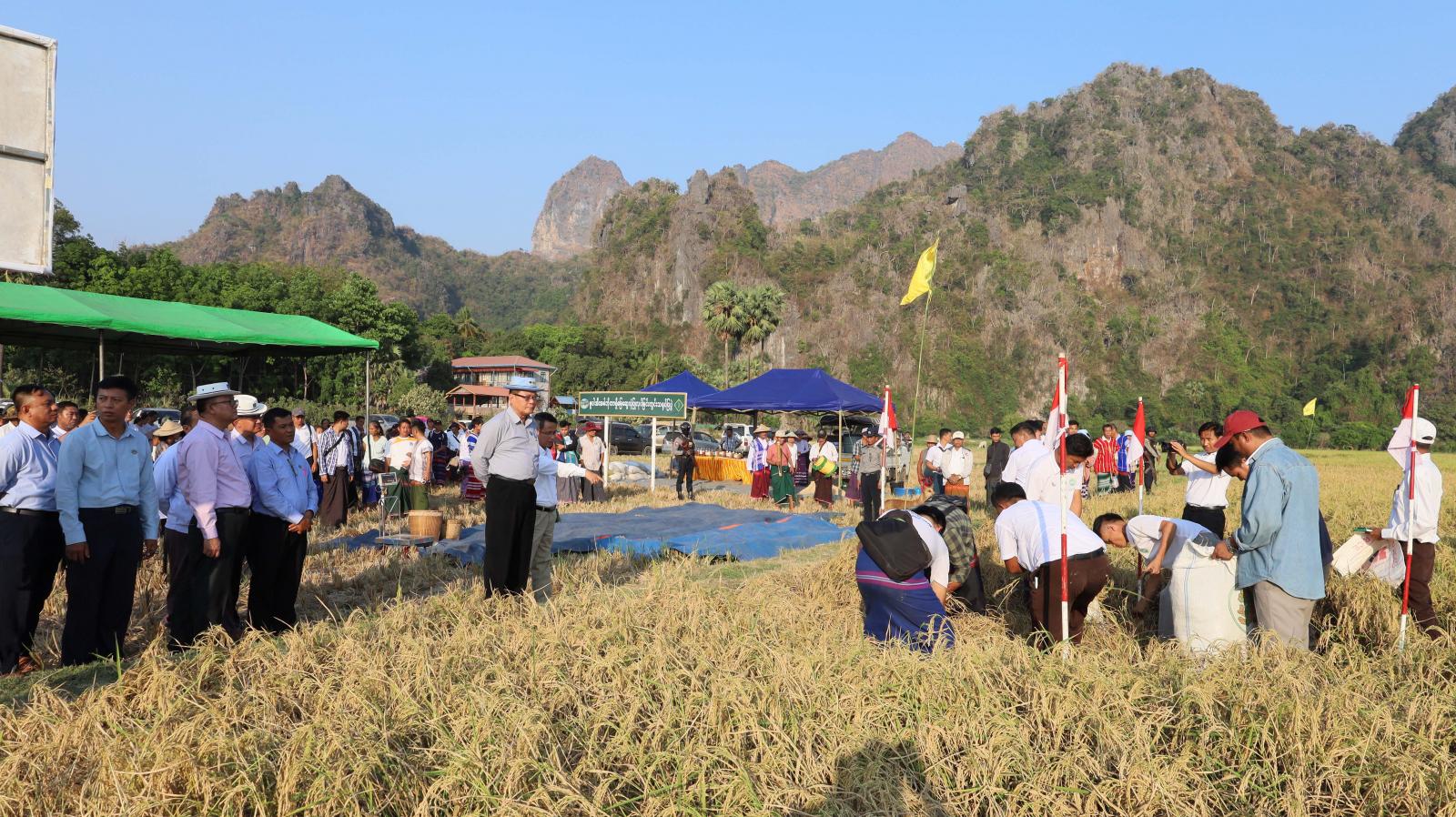 လယ်ယာကဏ္ဍ၏ဖွံ့ဖြိုးတိုးတက်မှု၊ သီးနှံအထွက်နှုန်းတိုးတက်မှုနှင့် စားရေရိက္ခာဖူလုံမှု ရှိ/မရှိ တွက်ချက်နိုင်ရန် ကရင်ပြည်နယ်မြေစာရင်းဦးစီးဌာနမှ နွေစပါးတစ်ဧကအထွက်နှုန်းမှန်ကန်စွာရရှိနိုင်ရေး နွေစပါးစံကွက်ရိတ်သိမ်းခြင်းကို ယမန်နေ့မွန်းလွဲ ၄ နာရီက ဘားအံမြို့နယ်၊ ရဲသာကျေးရွာအုပ်စု၊ ကွင်းအမှတ်- ၁၁၈၈-က၊ နောင်ခရိုင်ကွင်းရှိ တောင်သူဦးမြင့်ဦး၏ ဆင်းသုခနွေစပါးစိုက်ခင်း၌ ကျင်းပခဲ့သည်။