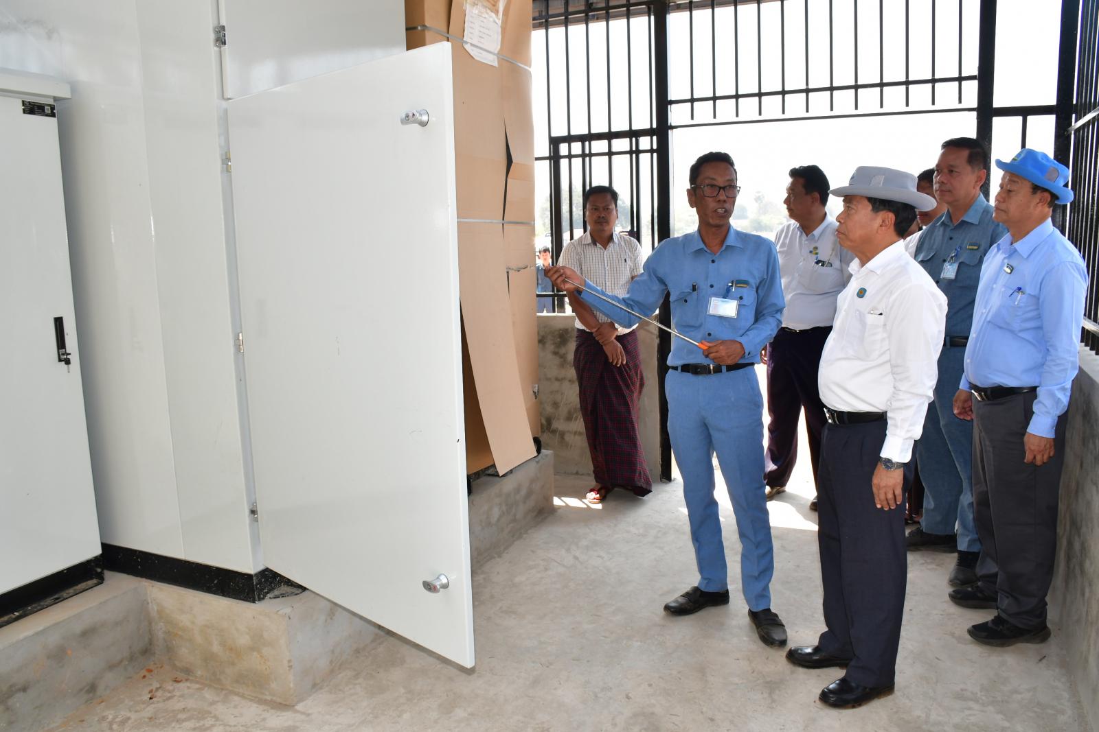 ထိုနောက် နေပြည်တော်ကောင်စီဥက္ကဋ္ဌ ဦးသန်းထွန်းဦးသည် နေပြည်တော်စည်ပင်သာယာရေးကော်မတီမှ ဆောင်ရွက်နေသည့် နေပြည်တော်အတွင်း သောက်သုံးရေပြတ်လပ်မှု မရှိစေရေးအတွက် ချောင်းမငယ်ဆည်ရေအား ဆင်အုံကန်မှ တစ်ဆင့် တစ်နေ့လျှင် ရေဂါလံ ခြောက်သန်း ရေပေးဝေရေး စနစ်ဆောင်ရွက်ခြင်းလုပ်ငန်းအတွက် 11/0.4 KV 1000 KVA Transformer နှစ်လုံးတပ်ဆင် တည်ဆောက်နေမှု အခြေအနေများ ရေပိုက်များ သွယ်တန်းခြင်းလုပ်ငန်းဆောင်ရွက်နေမှု အခြေအနေများကို သွားရောက်ကြည့်ရှုစစ်ဆေးပြီး လိုအပ်သည်များကို တာဝန်ရှိသူများအား မှာကြားသည်။