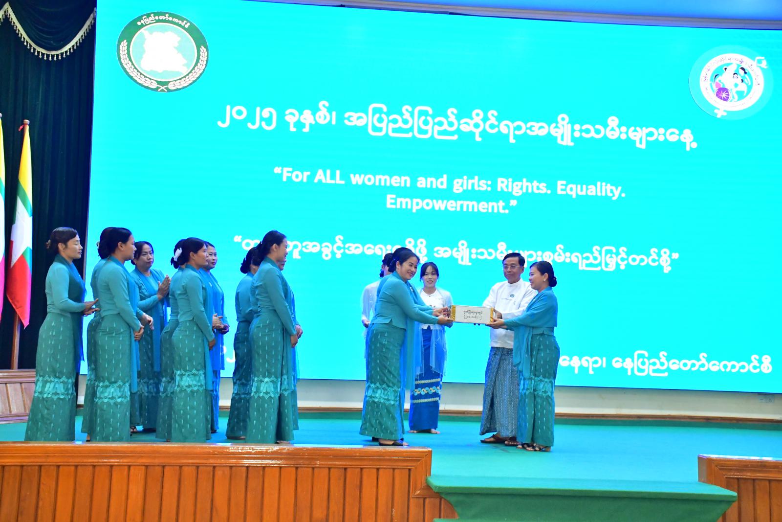 ထို့နောက် နေပြည်တော်ကောင်စီ၊ ခရိုင်၊ မြို့နယ်အမျိုးသမီးရေးရာအဖွဲ့များက အင်အားသစ်များနှင့်အတူ အဖွင့်သီချင်းဖြင့် သီဆိုကြရာ နေပြည်တော်ကောင်စီဥက္ကဋ္ဌ ဦးသန်းထွန်းဦးနှင့် ဇနီး နေပြည်တော်အမျိုးသမီးရေးရာအဖွဲ့နာယက ဒေါ်သီတာဇင်တို့က ဂုဏ်ပြုဆုငွေများ ပေးအပ်ချီးမြှင့်ကြသည်။