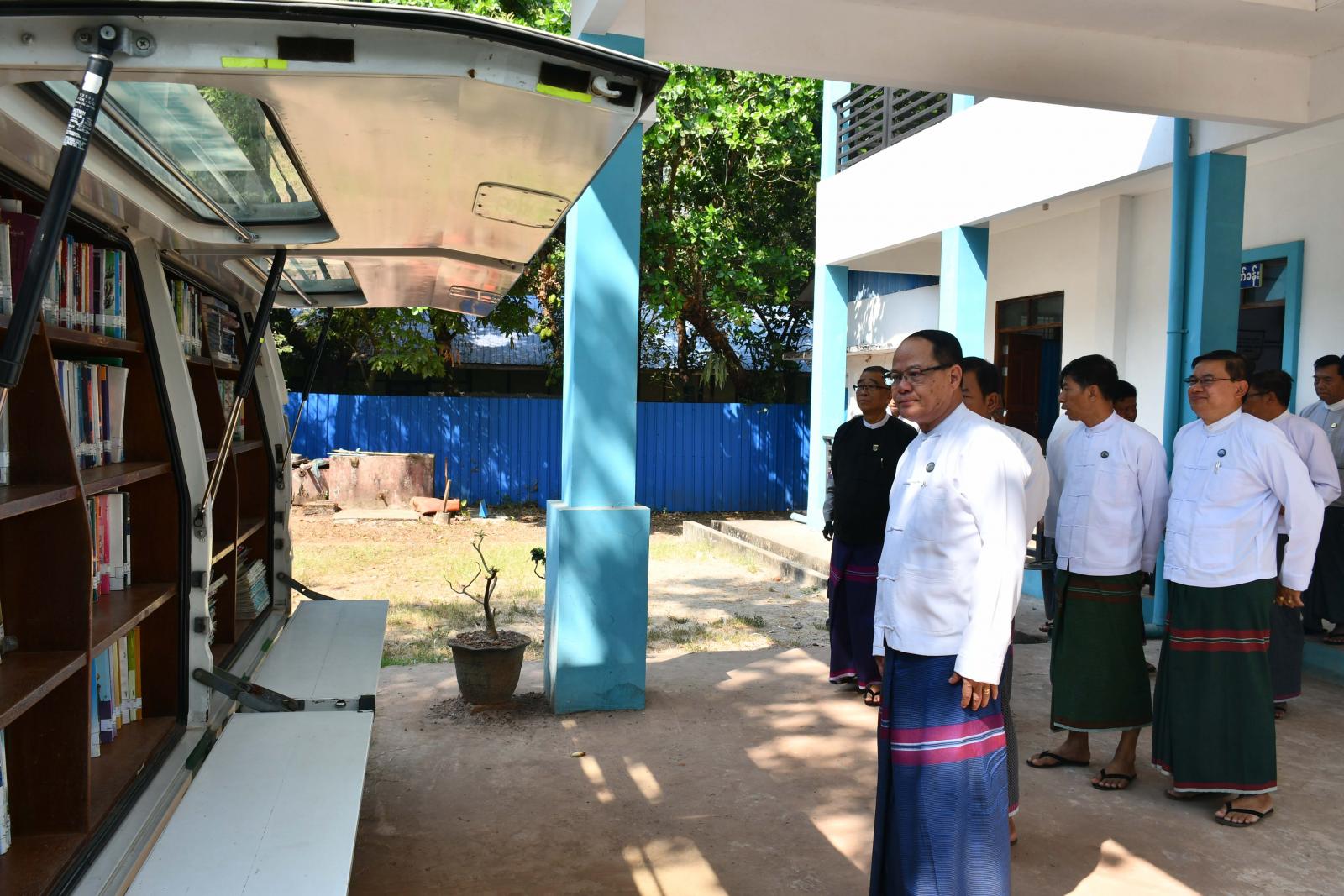 ထို့နောက် ပြန်ကြားရေးနှင့်ပြည်သူ့ဆက်ဆံရေးဦးစီးဌာန ညွှန်ကြားရေးမှူး ဦးမောင်မောင်က သင်တန်းဆိုင်ရာများနှင့် ပတ်သက်၍ ရှင်းလင်းတင်ပြပြီး ပြည်နယ်ဝန်ကြီးချုပ်က သင်တန်း(၃)မျိုး၊ ရက်ပေါင်း(၂၀)အတွက် ငွေကျပ် သိန်း(၄၀)ကျပ်ကို ပြည်နယ်ညွှန်ကြားရေးမှူးထံ ချီးမြှင့်ပေးအပ်ကာ အမှတ်(၄) အခြေခံပညာအထက်တန်းကျောင်းမှ ကျောင်းသူလေးများက ပညာဘဏ်တိုက်စာကြည့်တိုက်သို့ သွားကြစို့ သီချင်းဖြင့် ကပြဖျော်ဖြေကြရာ ပြည်နယ်ဝန်ကြီးချုပ်နှင့် တာဝန်ရှိသူများက ဂုဏ်ပြုဆုငွေများ ပေးအပ်ချီးမြှင့်ခဲ့ကြသည်။