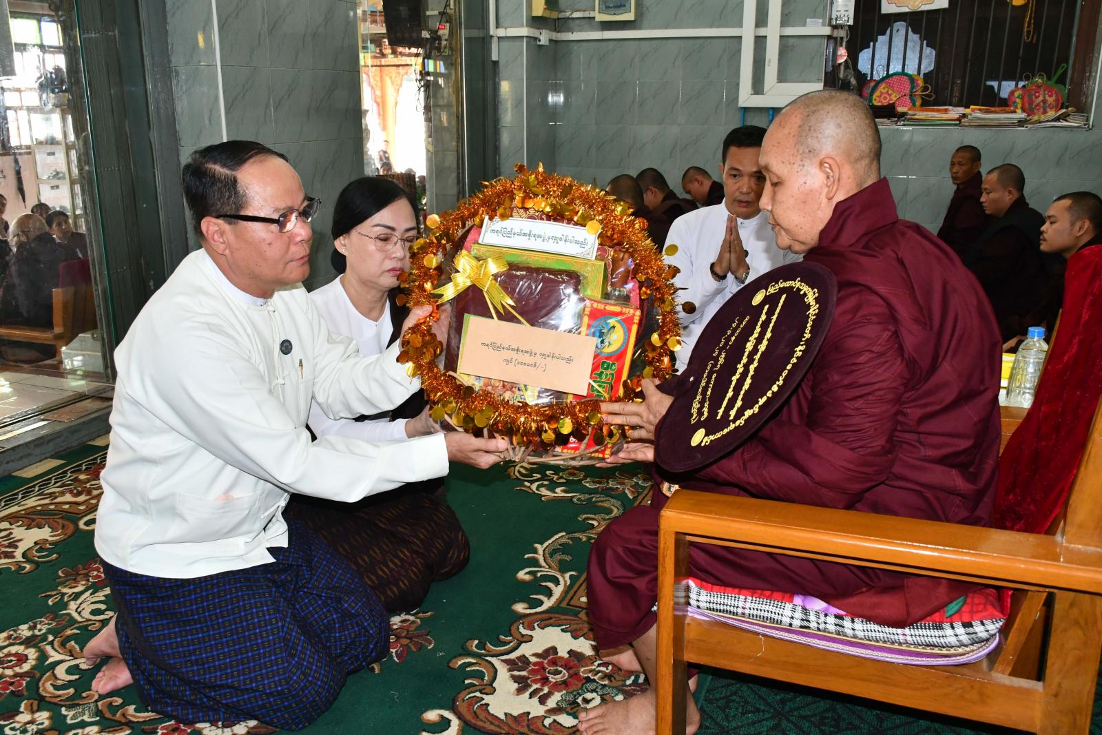 ထို့နောက် ပြည်နယ်ဝန်ကြီးချုပ်က သာသနာရေးဆိုင်ရာများကိုလျှောက်ထားတင်ပြပြီး တာဝန်ရှိသူများ၊ စေတနာရှင်၊အလှူရှင်များနှင့်အတူ သံဃာတော်အရှင်သူမြတ်များအား လှူဖွယ်ဝတ္ထုပစ္စည်းများနှင့်နဝကမ္မအလှူတော်ငွေများ ဆက်ကပ်လှူဒါန်းကြကာ နိုင်ငံတော်ဩဝါဒစရိယ ကျောင်းထိုင်ဘုန်းကြီးသင်တန်းကျောင်း ကျောင်းအုပ်ဆရာတော် မဟာဂန္ထဝါစက ပဏ္ဍိတ ဘဒ္ဒန္တဝိဇ္ဇာနန္ဒထံမှ ဩဝါဒကထာနာယူ၍ လှူဒါန်းမှုအစုစုတို့အတွက် ရေစက်သွန်းချအမျှပေးဝေကြသည်။