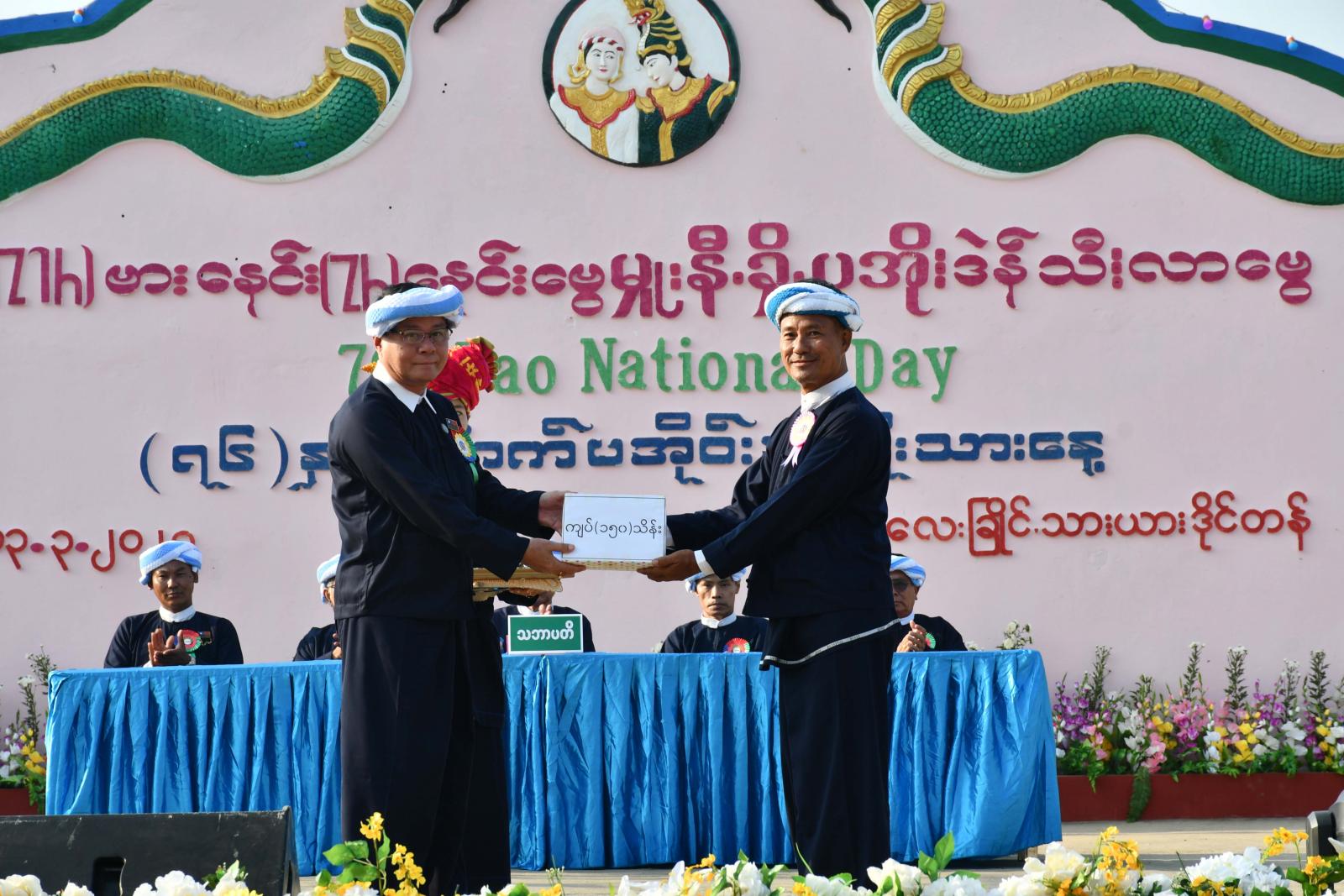 ယင်းနောက် ပြည်နယ်ဝန်ကြီးချုပ်က ပအိုဝ်းအမျိုးသားနေ့နှုတ်ခွန်းဆက်စကားပြောကြားပြီး(၇၆)နှစ်မြောက် ပအိုဝ်းအမျိုးသားနေ့အောင်မြင်စွာကျင်းပနိုင်ရေး ငွေကျပ်သိန်း(၁၅၀)ကိုချီးမြှင့်ပေးအပ်ကာ ပအိုဝ်းတိုင်းရင်းသားလူငယ်တစ်ဦးက ပအိုဝ်းအမျိုးသားနေ့ဖြစ်ပေါ်လာပုံသမိုင်းအကျဉ်းကို ပအိုဝ်းဘာသာဖြင့်ဖတ်ကြားတင်ပြသည်။
