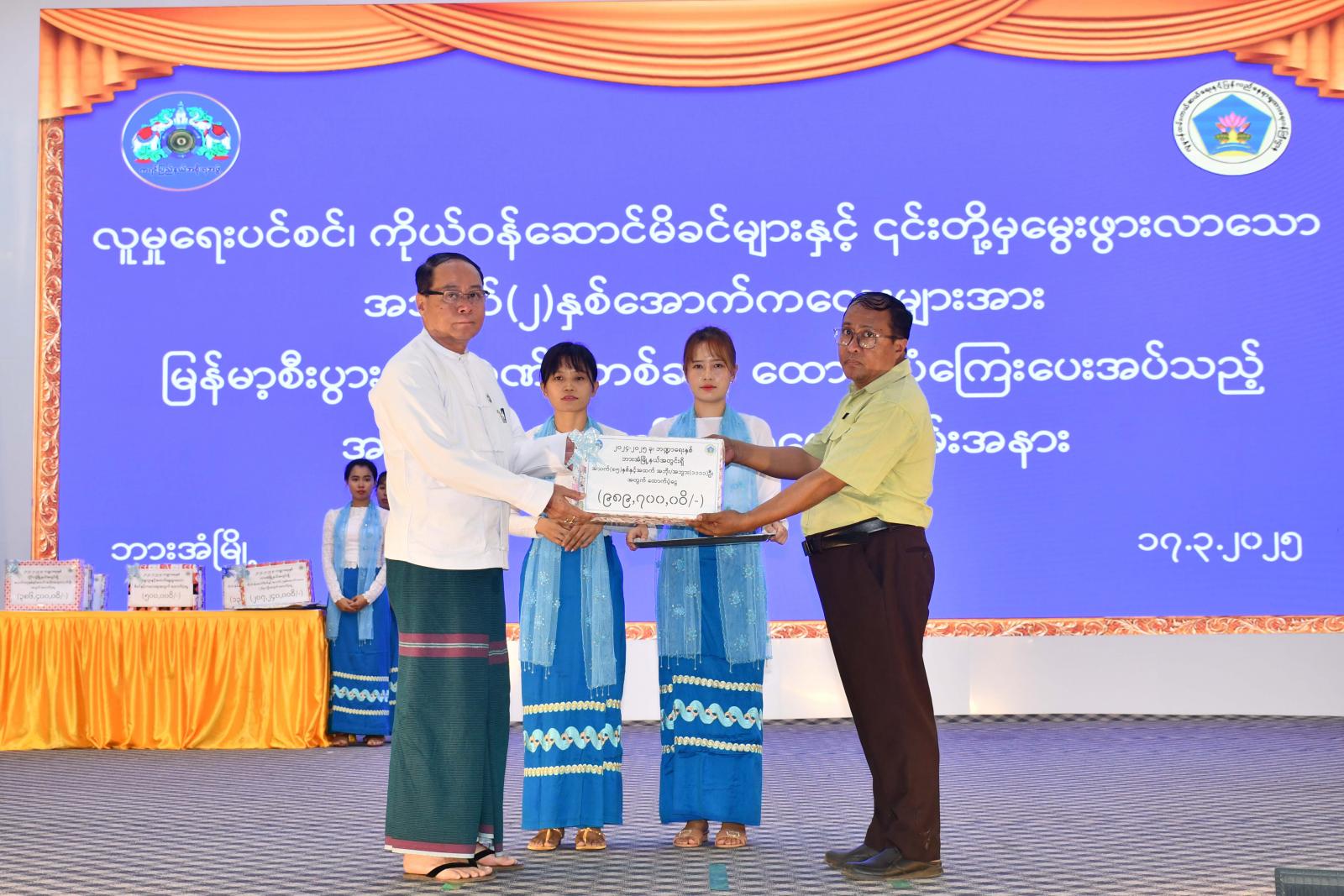 ထို့နောက် ကရင်ပြည်နယ်လူမှုဝန်ထမ်းရုံး ညွှန်ကြားရေးမှူးက လူမှုကာကွယ်စောင့်ရှောက်ရေးအစီအစဉ်(၂) ရပ်ဖြစ်သော လူမှုရေးပင်စင်၊ ကိုယ်ဝန်ဆောင်မိခင်နှင့်၎င်းတို့မှ မွေးဖွားလာသော အသက်(၂)နှစ်အောက်ကလေးများအား မြန်မာ့စီးပွားရေးဘဏ်မှတဆင့် ထောက်ပံ့ ကြေးပေးအပ်ခြင်းနှင့်ပတ်သက်၍ ရှင်းလင်းပြောကြားပြီး ပြည်နယ်ဝန်ကြီးချုပ်က ဘားအံမြို့နယ်အတွင်းရှိ လူမှုရေးပင်စင်အကျိုးခံစားခွင့်ရှိသူ ဘိုးဘွား(၁၁၁၁)ဦးအတွက် ထောက်ပံ့ကြေးငွေကျပ် ၉၈၉၇၀၀၀ဝိ/-(ကိုးရာရှစ်ဆယ့်ကိုးသိန်းခုနှစ်သောင်းကျပ်)နှင့် ဘားအံမြို့နယ်အတွင်းရှိ ကိုယ်ဝန်ဆောင်မိခင်နှင့်၎င်းတို့မှမွေးဖွားလာသောအသက်(၂)နှစ်အောက်ကလေးသူငယ်(၂၆၉၀)ဦးအတွက် ထောက်ပံ့ငွေကျပ် ၂၀၇၂၄၀၀၀ဝိ/ (နှစ်ထောင်ခုနှစ်ဆယ့်နှစ်သိန်းလေးသောင်းကျပ်) ကိုလည်းကောင်း၊ ပြည်နယ်အမျိုးသမီးရေးရာနှင့် မိခင်နှင့်ကလေးစောင့်ရှောက်မှုကြီးကြပ်ရေးအဖွဲ့နာယက က လှိုင်းဘွဲမြို့နယ်အတွင်းရှိ လူမှုရေးပင်စင်အကျိုးခံ စားခွင့်ရှိသူဘိုးဘွား(၄၇၆)ဦး အတွက် ထောက်ပံ့ကြေးငွေကျပ် ၃၈၆၄၀၀၀ဝိ/-(သုံးရာရှစ်ဆယ့်ခြောက်သိန်းလေးသောင်းကျပ်)နှင့် ကိုယ်ဝန်ဆောင်မိခင်နှင့်၎င်းတို့မှ မွေးဖွားလာသော အသက်(၂)နှစ်အောက် ကလေးသူငယ် (၁၇၉၀)ဦးအတွက် ငွေကျပ် ၁၃၁၃၂၀၀၀ဝိ/-(တစ်ထောင့်သုံးရာတစ်ဆယ့်သုံးသိန်းနှစ်သောင်းကျပ်)ကိုလည်းကောင်း၊ ပြည်နယ်တရားလွှတ်တော်တရားသူကြီးချုပ်က ကော့ကရိတ်မြို့နယ်အတွင်းရှိ လူမှုရေးပင်စင်အကျိုးခံစားခွင့်ရှိသူ ဘိုးဘွား(၄၆)ဦးအတွက် ငွေကျပ် ၃၁၈၀၀၀ဝိ/-(သုံးဆယ်တစ်သိန်းရှစ်သောင်းကျပ်)ကိုလည်းကောင်း၊ ပြည်နယ်စီးပွား ရေးရာဝန်ကြီးက သံတောင်ကြီးမြို့နယ်အတွင်းရှိ လူမှုရေးပင်စင်အကျိုးခံစားခွင့်ရှိသူဘိုးဘွား(၃၉)ဦးအတွက် ငွေကျပ် ၃၄၅၀၀၀ဝိ/-(သုံးဆယ်လေးသိန်းငါးသောင်းကျပ်)ကိုလည်းကောင်း၊ ပြည်နယ်သယံဇာတရေးရာဝန်ကြီးက ကြာအင်းဆိပ်ကြီးမြို့နယ်အတွင်းရှိ လူမှုရေးပင်စင်အကျိုးခံစားခွင့်ရှိသူဘိုးဘွား(၃၇)ဦးအတွက် ငွေကျပ် ၃၂၄၀၀၀ဝိ/-(သုံးဆယ့်နှစ်သိန်းလေးသောင်းကျပ်)ကိုလည်းကောင်း၊ ပြည်နယ်လူမှု ရေးရာဝန်ကြီးက သံတောင်မြို့နယ်အတွင်းရှိ လူမှုရေးပင်စင်အကျိုးခံစားခွင့်ရှိသူဘိုးဘွား (၂၈)ဦး အတွက် ငွေကျပ် ၂၄၀၀၀၀ဝိ/(နှစ်ဆယ့်လေးသိန်းကျပ်)ကို လည်းကောင်း သက်ဆိုင်ရာကို ယ်စားလှယ်များထံ ချီးမြှင့်ပေးအပ်သည်။
