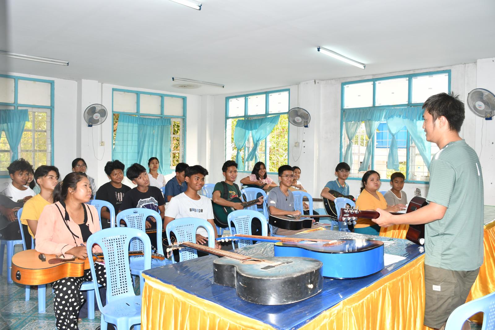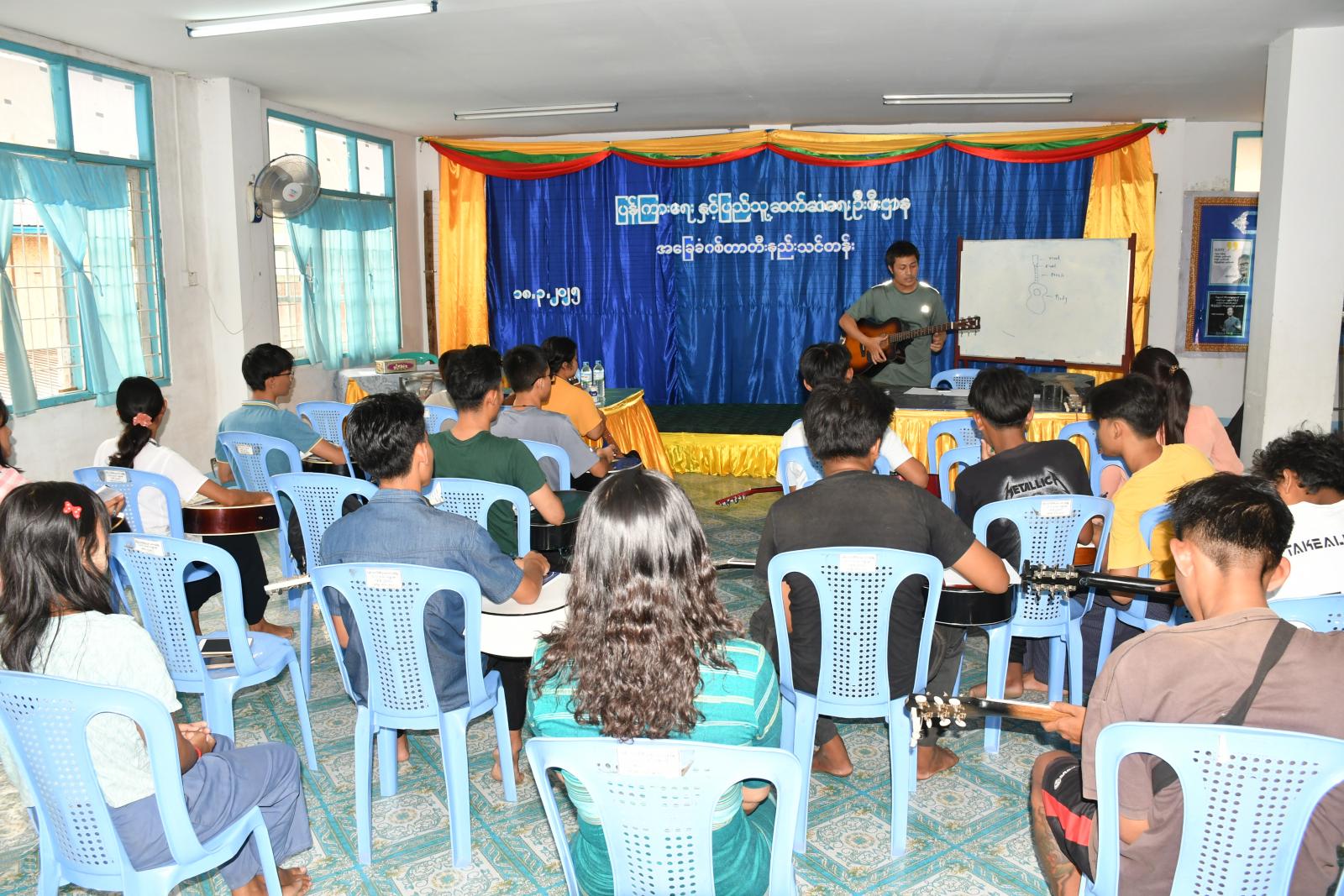 နွေရာသီကျောင်းပိတ်ရက်ကာလအတွင်း ကျောင်းသား၊လူငယ်များ ဗလငါးတန်ဖွံ့ဖြိုးစေရေးနှင့် အခြေခံဂစ်တာတီးပညာရပ်ကို အခြေခံနားလည်တတ်မြောက်စေရန်ရည်ရွယ်၍ ပြန်ကြားရေးနှင့်ပြည်သူ့ဆက်ဆံရေးဦးစီးဌာနနှင့် ဂစ်တာပညာရှင်များပူးပေါင်းပြီး နွေရာသီအခြေခံဂစ်တာသင်တန်း (၁/၂၀၂၅)ကို ယမန်နေ့ ညနေ ၄နာရီက စတင်၍ အဆိုပါဦးစီးဌာန၊ လူထုအခြေပြုဗဟိုဌာန(Community Centre)ခန်းမ၌ ဖွင့်လှစ်သင်ကြားပေးခဲ့သည်။