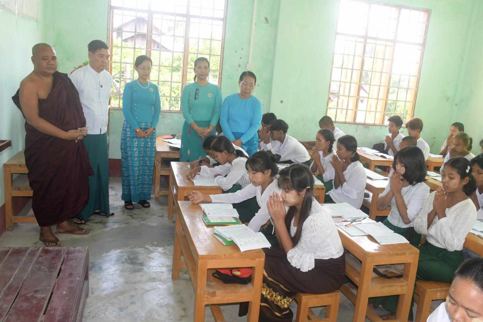 ဆက်လက်၍ ရခိုင်ပြည်နယ်အစိုးရအဖွဲ့ကကြီးမှူး၍ နွေရာသီယဉ်ကျေးလိမ္မာသင်တန်းဖွင့်လှစ်သင်ကြားနေမှုကို လှည့်လည်ကြည့်ရှုအားပေးကြပြီး ကျောင်းသား၊ ကျောင်းသူများအား စားသောက် ဖွယ်ရာများပေးအပ်ချီးမြှင့်ကြသည်။ ယင်းနောက် ကျောင်းစာကြည့်တိုက်၌ ကျောင်းသား၊ ကျောင်းသူများ စာပေဖတ်ရှုလေ့လာနေမှုကို ကြည့်ရှုအားပေးကြကာ စာကြည့်တိုက်အတွက် စာအုပ်၊ စာပေများပေးအပ်လှူဒါန်းကြသည်။ ဆက်လက်၍ ကျောင်းတိုက်အတွင်းရှိ ယာယီနေရပ်စွန့်ခွာပြည်သူများ နေထိုင်မှုကို လှည့်လည်ကြည့်ရှုစစ်ဆေးကြကာ ပြည်သူများအေးချမ်းစွာ နေထိုင်နိုင်ရေးအတွက် လိုအပ်သည့်များ ဖြည့်ဆည်းဆောင်ရွက်ပေးနိုင်ရေး တာဝန်ရှိသူများနှင့် ပေါင်းစပ်ညှိနှိုင်းပေးခဲ့ပြီး ကလေးငယ်များအား စားသောက်ဖွယ်ရာများ ထောက်ပံ့ပေးအပ်ခဲ့ကြောင်း သိရသည်။