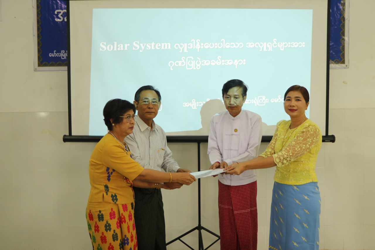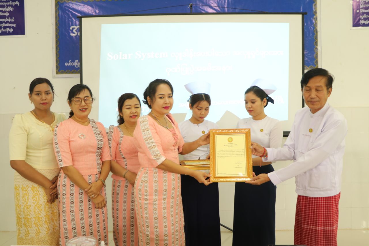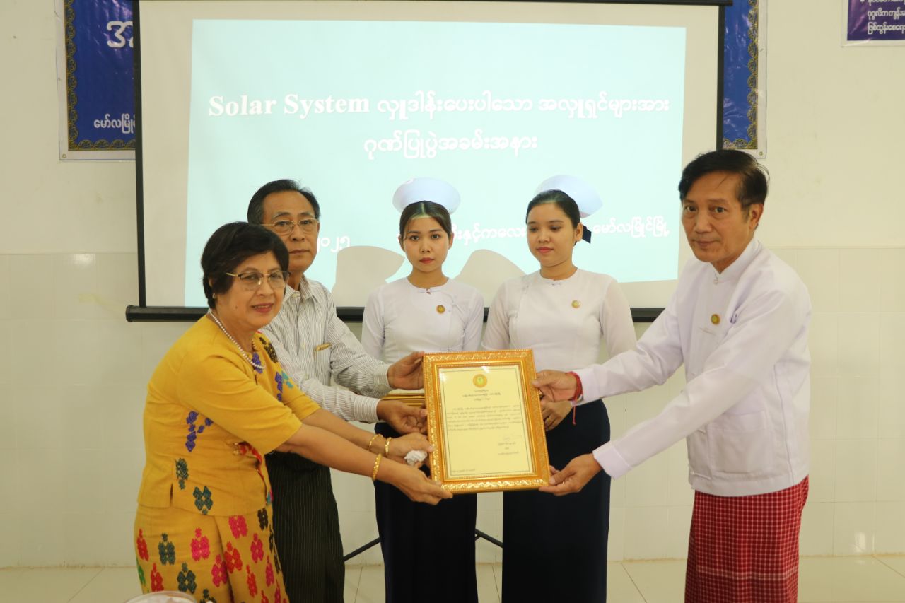 ထို့နောက် Solar အလှူရှင်များကိုယ်စား ဦးမျိုးအောင် (GQ သောက်ရေသန့်) နှင့် Solar System တပ်ဆင်ပေးပါသော ဦးလင်းပြည့်ဖြိုး (Play Boy Electronic) တို့က ပြည်နယ်ပြည်သူ့ကျန်းမာရေးနှင့်ကုသရေးဦးစီးဌာနမှူးနှင့် ဆေးရုံအုပ်ကြီးထံသို့ Solar System များအား လွှဲပြောင်းလှူဒါန်းခဲ့ကြသည်။