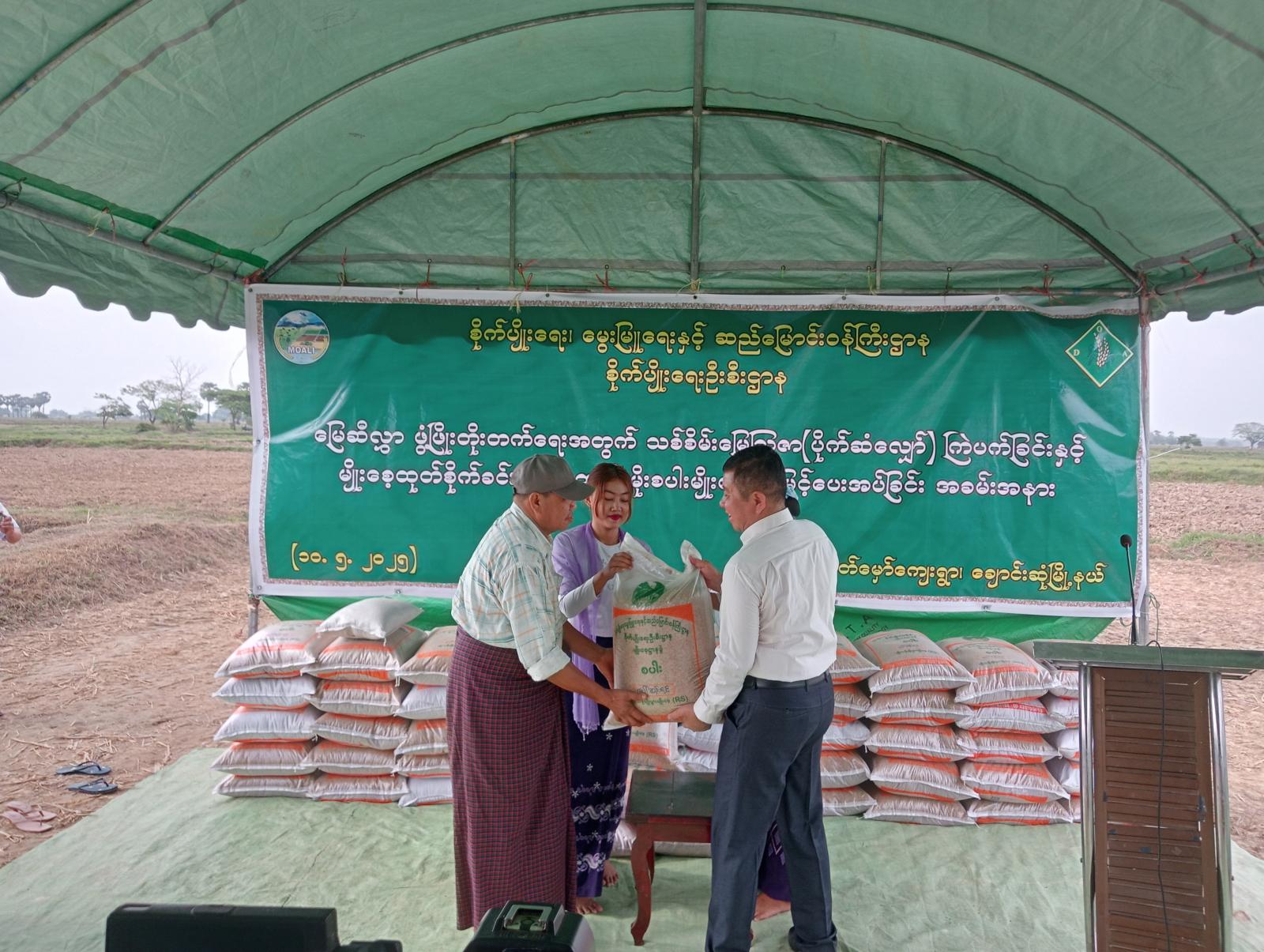 အဆိုပါ မျိုးစပါးမျိုးစေ့များကို တောင်သူ (၁၄)ဦး၏ မျိုးစေ့ထုတ် စိုက်ဧက (၅၀)အတွက် ပေါ်ဆန်းရင် မျိုးစပါး တင်း(၅၀)ပေးအပ်ခဲ့ပြီး မြို့နယ်အတွင်း လာမည့်မိုးစပါးစိုက်ပျိုးရာသီ၌ မိုးစပါးစိုက်ဧက (၆၅၃၀၉) ဧက စိုက်ပျိုးထုတ်လုပ်နိုင်ရန်လျာထား ဆောင်ရွက်လျက်ရှိကြောင်း မြို့နယ်စိုက်ပျိုးရေးဦးစီးဌာနမှ သိရသည်။