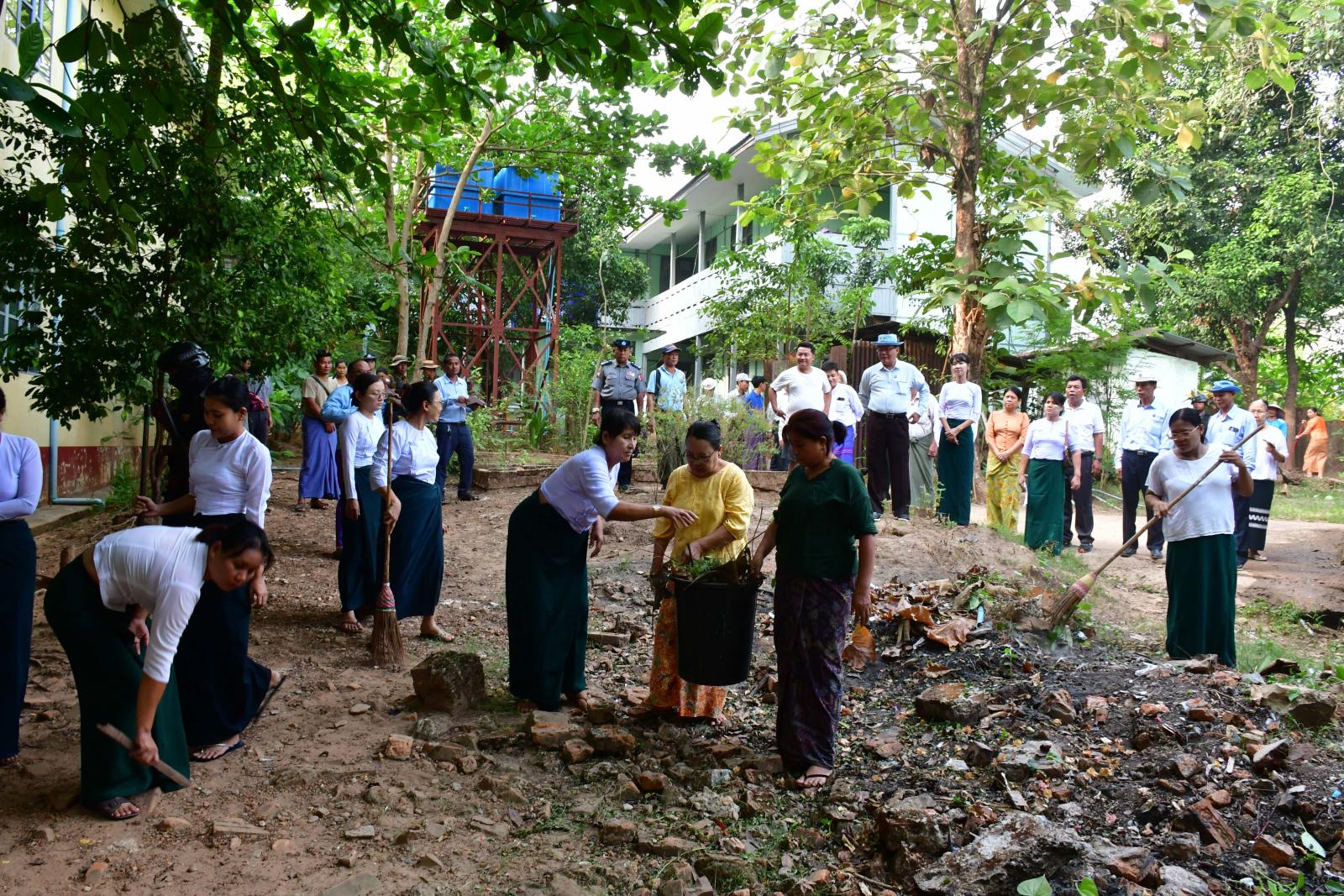 ထို့နောက် ပြည်နယ်ဝန်ကြီးချုပ်နှင့် တာဝန်ရှိသူများသည် မကြာမီကာလအတွင်း အခြေခံပညာကျောင်းများ ပြန်လည်ဖွင့်လှစ်တော့မည်ဖြစ်သည့်အတွက် ကျောင်းသား၊ ကျောင်းသူများ အဆင်ပြေချောမွေ့စွာ ပညာသင်ကြားနိုင်ရေးကျောင်းများ၌ ရပ်ကွက်နေ ပြည်သူများနှင့် ဌာနဆိုင်ရာများပူးပေါင်း၍ စုပေါင်းသန့်ရှင်းရေးလုပ်ငန်း ဆောင်ရွက်နေမှုများအား သွားရောက်ကြည့်ရှုစစ်ဆေးရာ ပြည်နယ်ဝန်ကြီးချုပ်နှင့်အဖွဲ့သည် အမှတ်(၅)အခြေခံပညာအထက်တန်းကျောင်း၊ အမှတ်(၂)အခြေခံပညာအထက်တန်းကျောင်း(ခွဲ)၊ မဲဘောင်အလယ်တန်းကျောင်း(ခွဲ)နှင့် တောင်ကလေး အထက်တန်းကျောင်းတို့တွင် နယ်မြေခံတပ်မတော်သားများ၊ မြန်မာနိုင်ငံရဲတပ်ဖွဲ့၊ မီးသတ်တပ်ဖွဲ့ဝင်များနှင့် ဌာနဆိုင် ရာဝန်ထမ်းများ၊ ရပ်ကွက်နေပြည်သူများပူးပေါင်း၍ စုစုပေါင်းအင်အား ၁၀၇၅ ဦးခန့်သည် စာသင်ကျောင်းများ အတွင်း/အပြင်ရှိ ချုံနွယ်ပေါင်းမြက်များ ခုတ်ထွင်ရှင်းလင်းခြင်း၊ စွန့်ပစ်ပလတ်စတစ်နှင့် အမှိုက်များဖယ်ရှားရှင်းလင်းခြင်း၊ ရေစီးရေလာကောင်းမွန်စေရေး ရေနုတ်မြောင်းများတူးဖော်ပေးခြင်း အစရှိသည့် စုပေါင်းသန့်ရှင်းရေးလုပ်ငန်းများ ဆောင်ရွက်နေမှုနှင့် အဆိုပါကျောင်းများ၏ ဥပဓိရုပ်ကောင်းမွန်ရေး၊ စာသင်ခန်း၊ စာသင်ဆောင်၊ ပရိဘောဂများနှင့် ရေ၊ မီး၊ မိလ္လာများ ပြည့်စုံလုံလောက်မှုရှိစေရေး ကြည့်ရှုစစ်ဆေးကာ ပြည်နယ်ဝန်ကြီးချုပ်က ကျောင်းနေပျော်၍ စာတော်သော ကျောင်းသား၊ ကျောင်းသူများဖြစ်စေရေး ကျောင်းများကို သန့်ရှင်းသာယာသော ပတ်ဝန်းကျင်ကောင်းများအဖြစ် အစဉ်ဖန်တီးပေးကြရန် တာဝန်ရှိသူများအား မှာကြားသည်။