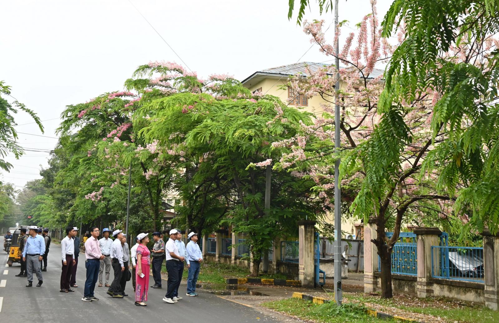 ထို့နောက် အဆိုပါဈေးကြီးလမ်းမှတစ်ဆင့် ရွှေတောင်လမ်းတစ်လျှောက် လမ်းဘေးဝဲ/ယာ တစ်လျှောက် ပြည်ထောင်စုလမ်းမကြီးထိ အရိပ်ရပန်းပွင့်သည့် ငုစပ်ချယ်ရီပန်းပင်များနှင့် စိန်ပန်းပင်များ စိုက်ပျိုးထားရှိရာတွင် ပန်းများဖြင့် ဝေဆာဖူးပွင့်နေမှုအခြေအနေများကိုလည်းကောင်း၊ ထိုမှတစ်ဆင့် ဆွမ်ပရာဘွမ်လမ်းမကြီးမှ ရုံးကြီးလမ်းတစ်လျှောက် လမ်းဘေးဝဲ/ယာတွင် ငုစပ်ချယ်ရီပင်များနှင့် ငုဝါပင်များ ရောစပ်စိုက်ပျိုးထားရှိမှုတို့ကိုလည်းကောင်း၊ ဘုံကျောင်းလမ်းတစ်လျှာက် အရိပ်ရအပင်ကြီးမျိုးဖြစ်သည့် စိန်ပန်းပြာပန်းပင်များ စိုက်ပျိုးထားရှိမှုနှင့် ပန်းများဖြင့် ဖူးပွင့်ဝေဆာနေမှုအခြေအနေများကိုလည်းကောင်း၊ ယင်းနောက် မြို့သစ်ကြီးရပ်ကွက်အတွင်း ဈေးကြီးလမ်းမတစ်လျှောက် လမ်းဘေးဝဲ/ယာများတွင် ငုဝါပန်းပင်များ စိုက်ပျိုးထားရှိမှုတို့ကိုလည်းကောင်း လှည့်လည်ကြည့်ရှုစစ်ဆေးခဲ့ကြပြီး ပြည်နယ်ဝန်ကြီးချုပ်က မြို့တော်မြစ်ကြီးနားမြို့အား သန့်ရှင်းသာယာလှပပြီး ရောင်စုံပန်းများဖြင့် ဖူးပွင့်ဝေဆာနေစေရေး၊ လမ်းဘေးဝဲ/ယာများ ရေမြောင်းများ ရေစီးရေလာကောင်းမွန်အောင် ဆောင်ရွက်ရေး ဌာနဆိုင်ရာတာဝန်ရှိသူများနှင့် ညှိနှိုင်းပေါင်းစပ်ပေးခဲ့သည်။