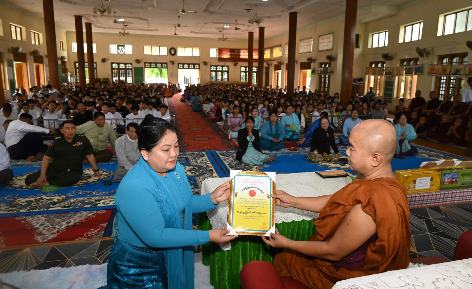ဆက်လက်၍ ကျောင်းအုပ်ဆရာတော် မဟာဂန္ထဝါစကပဏ္ဍိတ ဘဒ္ဒန္တဝါသဝထံ ပြည်နယ်ဝန်ကြီးချုပ်၏ဇနီး ဒေါ်နန်ဆိုင်းက ပြည်နယ်အစိုးရအဖွဲ့က လှူဒါန်းသည့် ငွေကျပ်သိန်း (၂၀)ကို လည်းကောင်း၊ ပြည်နယ်အမျိုးသမီးရေးရာအဖွဲ့နှင့် အလှူရှင်များက အလှူငွေများကိုလည်းကောင်း အသီးသီးပေးအပ်လှူဒါန်းကြရာ ဆရာတော်က ဂုဏ်ပြုမှတ်တမ်းလွှာများကို ပြန်လည်ချီးမြှင့်အပ်နှင်းသည်။
