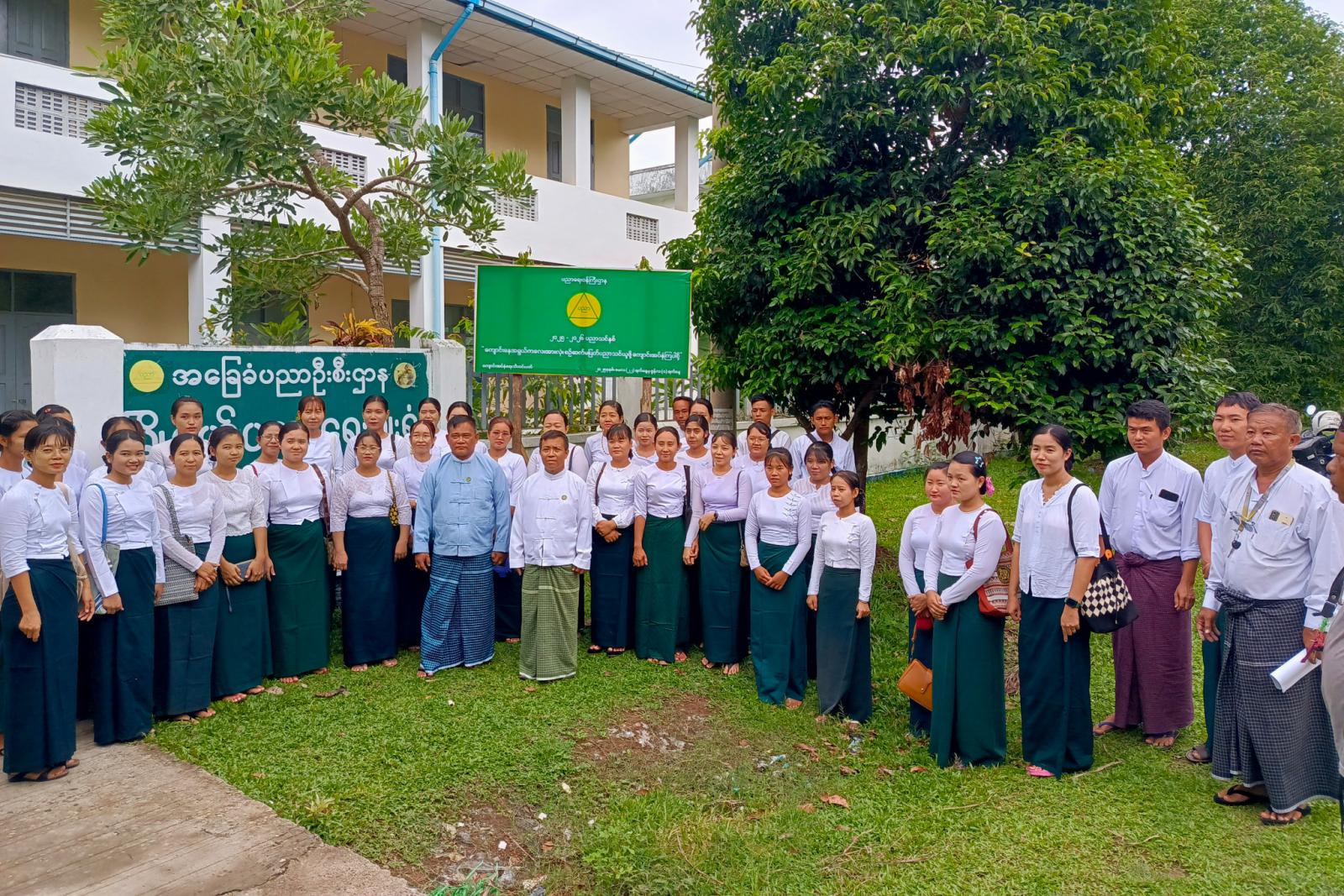 မြေစိုက်ပိုစတာစိုက်ထူရာတွင် မြို့နယ်ပညာရေးမှူး ဦးမြင့်ထွေးနှင့် အခြခံပညာကျောင်းများမှ ကျောင်းအုပ်ကြီးများ၊ တာဝန်ရှိသူများက ၂၀၂၅-၂၀၂၆ ပညာသင်နှစ် “ကျောင်းနေအရွယ်ကလေးအားလုံး စဉ်ဆက်မပြတ် ပညာသင်ယူဖို့ ကျောင်းအပ်နှံကြပါစို့” စာသားပါ ဗွီနိုင်းမြေစိုက်ပိုစတာကို စုပေါင်းစိုက်ထူခဲ့ကြသည်။