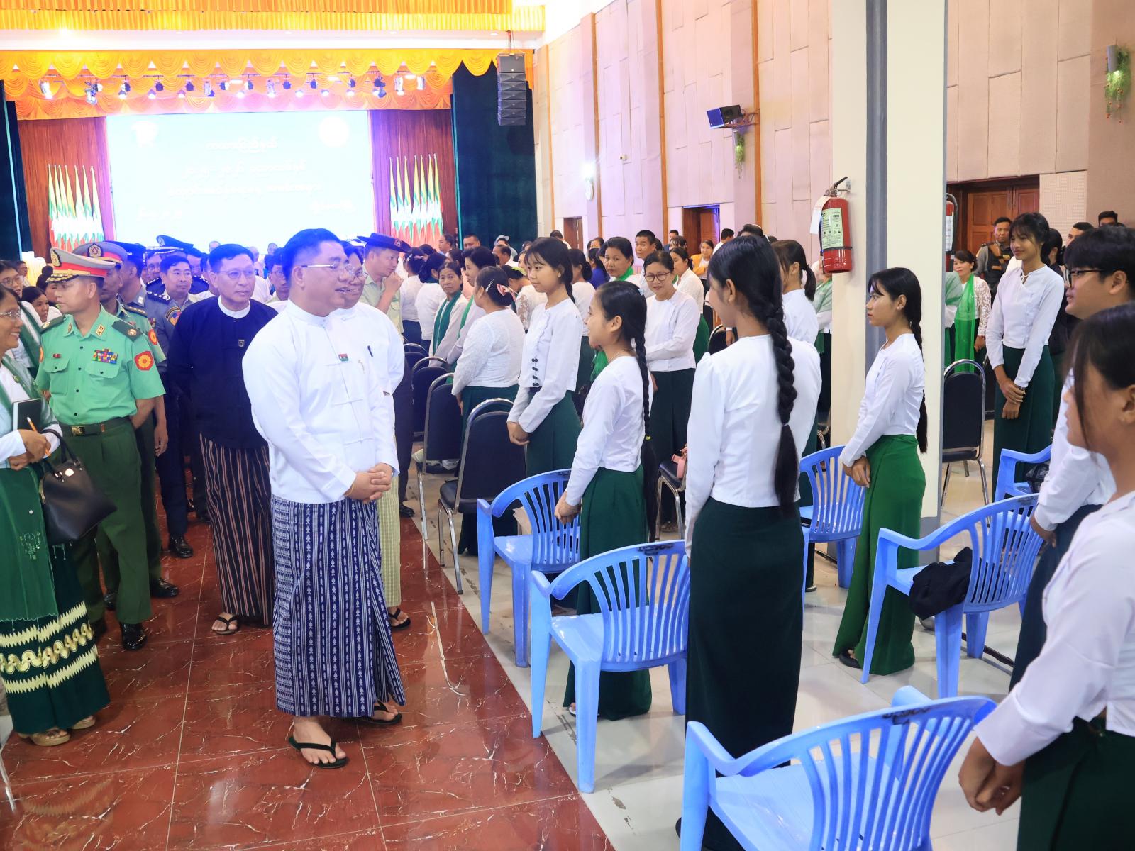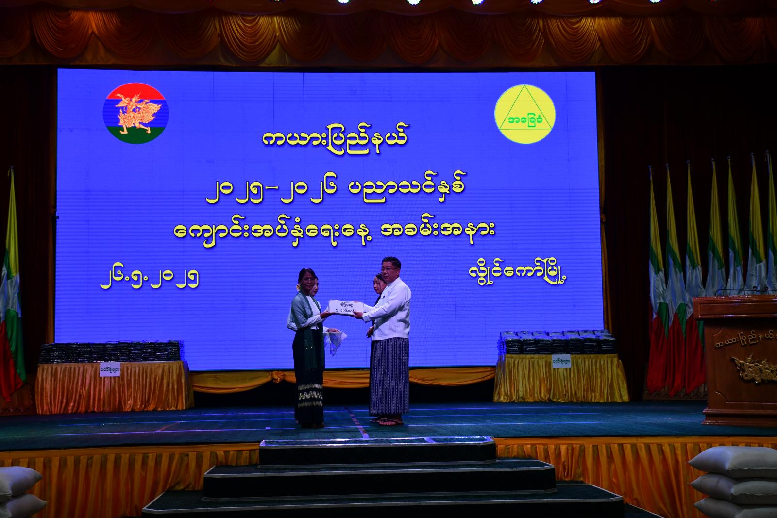 ထို့နောက် ပြည်နယ်ဝန်ကြီးချုပ်က ဆရာ၊ ဆရာမများနှင့် ပညာရေးဝန်ထမ်းများအတွက် ကျောင်းဝတ်စုံ၊ ချီးမြှင့်ငွေ၊ အခြေခံစားကုန်နှင့် အထက်တန်းအဆင့် ကျောင်းသား၊ ကျောင်းသူများအတွက် အခမဲ့ကျောင်းသုံးပြဋ္ဌာန်းစာအုပ်၊ ဗလာစာအုပ်နှင့် ခဲတံများကိုလည်းကောင်း၊ ဒေသကွပ်ကဲရေးမှူးက စီမံဝန်ထမ်းများအတွက် ဝတ်စုံစရိတ်၊ ချီးမြှင့်ငွေနှင့် အလယ်တန်းအဆင့် ကျောင်းသား၊ ကျောင်းသူများအတွက် အခမဲ့ကျောင်းသုံးပြဋ္ဌာန်းစာအုပ်၊ ဗလာစာအုပ်နှင့် ခဲတံများကိုလည်းကောင်း၊ စီးပွားရေးရာဝန်ကြီးက မူလတန်းအဆင့်အတွက် ကျောင်းဝတ်စုံနှင့် ကျောင်းသုံးပြဋ္ဌာန်းစာအုပ်၊ ဗလာစာအုပ်နှင့် ခဲတံများကိုလည်းကောင်း အသီးသီးပေးအပ်ရာ တာဝန်ရှိသူများနှင့် ကျောင်းသား၊ ကျောင်းသူများက လက်ခံရယူကြသည်။