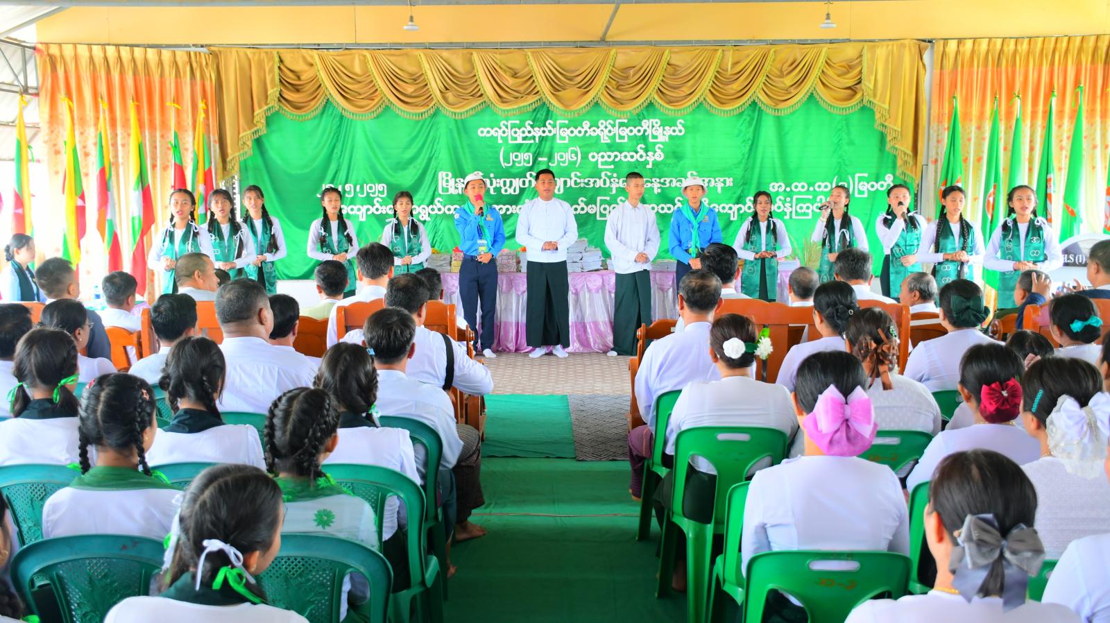 ဆက်လက်၍ ခရိုင်စီမံအုပ်ချုပ်ရေးအဖွဲ့ဥက္ကဋ္ဌ ခရိုင်အုပ်ချုပ်ရေးမှူး ဦးကောင်းစံလင်းနှင့် အဖွဲ့ဝင်များ၊ ခရိုင်အဆင့်ဌာနဆိုင်ရာများ၊ မြို့နယ်စီမံအုပ်ချုပ်ရေးအဖွဲ့ဥက္ကဋ္ဌ မြို့နယ်အုပ်ချုပ်ရေးမှူး ဦးသန်းနိုင်၊ မြို့နယ်စီမံအဖွဲ့ဝင် (၁) ဗိုလ်မှူးညီညီလွင်နှင့် အဖွဲ့ဝင်များ၊ မြို့နယ်စည်ပင်သာယာရေးအဖွဲ့ အမှုဆောင်အရာရှိ ဒုတိယညွှန်ကြားရေးမှူး ဦးကျော်ကျော်ဦးနှင့် မြို့နယ်အဆင့် ဌာနဆိုင်ရာများက ၂၀၂၅-၂၀၂၆ ပညာသင်နှစ်အတွက် ပညာရေးဝန်ကြီးဌာနက (အခမဲ့) ပေးအပ်သော ကျောင်းသုံးပုံနှိပ်ပြဌာန်းစာအုပ်၊ စာရေးကိရိယာ၊ Copy စာအုပ်နှင့် ဝတ်စုံများကို ပေးအပ်ရာ ကျောင်းအလိုက် KG အဆင့်မှ Grade 12 အဆင့်ထိ ကျောင်းသား၊ ကျောင်းသူများမှ လက်ခံရယူခဲ့သည်။