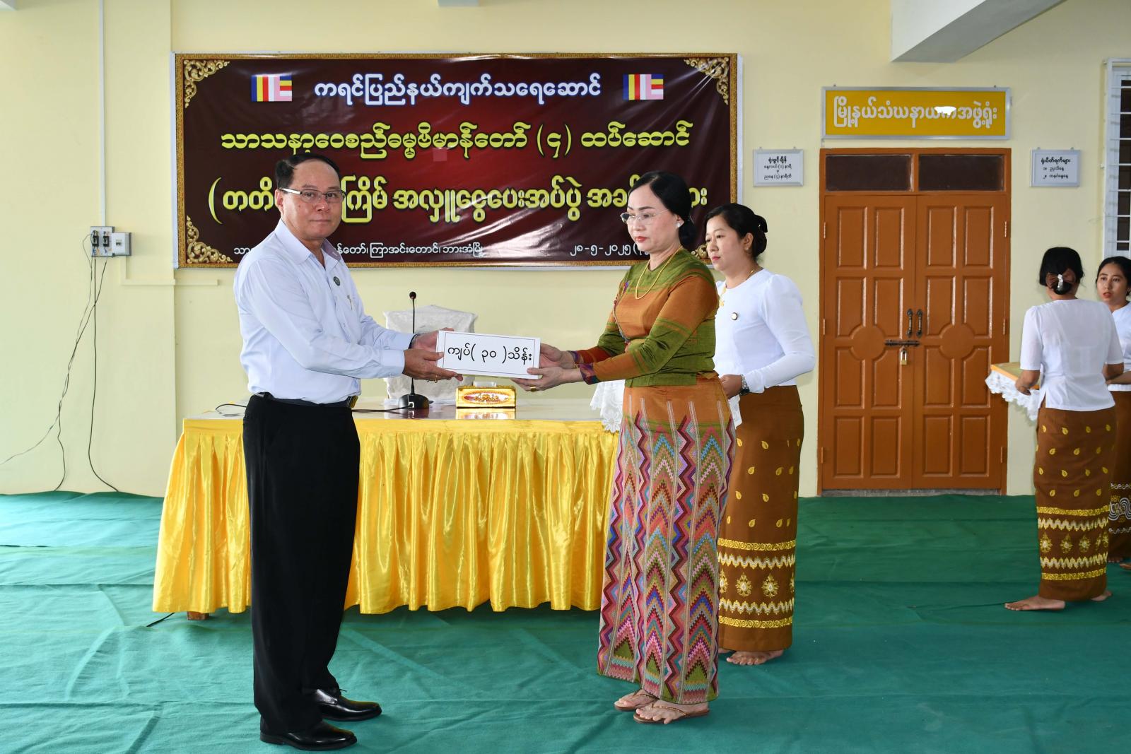 ပြည်နယ်အတွင်း ဘာသာရေးဆိုင်ရာအခမ်းအနားများ၊ ပွဲတော်များ၊ သံဃအစည်းအဝေးများစသည့် သာသနာ ရေးဆိုင်ရာကိစ္စရပ်များ ကျင်းပဆောင်ရွက်ရာတွင် ပြည့်စုံလုံလောက်သည့် အဆောက်အဦ လိုအပ်လျက်ရှိပြီး ပြည်နယ်ဩဝါဒါစရိယဆရာတော်ကြီးများ၏ ဆုံးမလမ်းညွှန်မှုဖြင့် သာသနာ့ဝေစည်အမည်ရှိ (၄) ထပ်ဓမ္မဗိမာန်တော်ကြီးကို အလှူရှင်များစုပေါင်းပါဝင်လှူဒါန်းမှုဖြင့် စတင်ဆောက်လုပ်ခဲ့ရာ ယခုအခါရာခိုင်နှုန်းအားဖြင့် (၄၅) ရာခိုင်နှုန်းခန့် တည်ဆောက်ပြီးစီးနေပြီး ပထမအကြိမ် အလှူငွေပေးအပ်လှူဒါန်းပွဲတွင် ငွေကျပ် ၇၄၇၁၅၃၅၀ဝိ/- ကျပ်၊ ဒုတိယအကြိမ်အလှူငွေပေးအပ်လှူဒါန်းပွဲတွင် ငွေကျပ် ၆၅၉၈၈၈၂၀ဝိ/-ကျပ် စုစုပေါင်းငွေကျပ် ၁၄၀၇၀၄၁၇၀ဝိ/- ရရှိလှူဒါန်းနိုင်ခဲ့ပြီး ယခုတတိယအကြိမ် ပေးအပ်လှူဒါန်းပွဲတွင် ပြည်နယ်ဝန်ကြီးချုပ်၊ ပြည်နယ်အစိုးရအဖွဲ့ဝင်များနှင့် မိသားစုဝင်များ၊ ဌာနဆိုင်ရာမိသားစုများ၊ ပြည်နယ်အတွင်းရှိ စီးပွားရေးလုပ်ငန်းရှင်များ၊ ကုမ္ပဏီများ၊ ဗုဒ္ဓဘာသာနွယ်ဝင်စေတနာရှင် အလှူရှင်များက စုစုပေါင်းငွေကျပ် ၁၁၁၃၇၄၀၀ဝိ/-ကျပ်ကို သာသနာ့ဝေစည်ဓမ္မဗိမာန်တော်ကြီး (၄) ထပ်ဆောင်ဖြစ် မြောက်ရေးဦးစီးကော်မတီဥက္ကဋ္ဌ ပြည်နယ်ဝန်ကြီးချုပ်ထံ ပေးအပ်လှူဒါန်းကြရာ ပြည်နယ်ဝန်ကြီးချုပ်က ဂုဏ်ပြုမှတ်တမ်းလွှာများကို ပြန်လည်ပေးအပ်ချီးမြှင့်ကာ နိဂုံးချုပ်အမှာစကား ပြောကြားသည်။