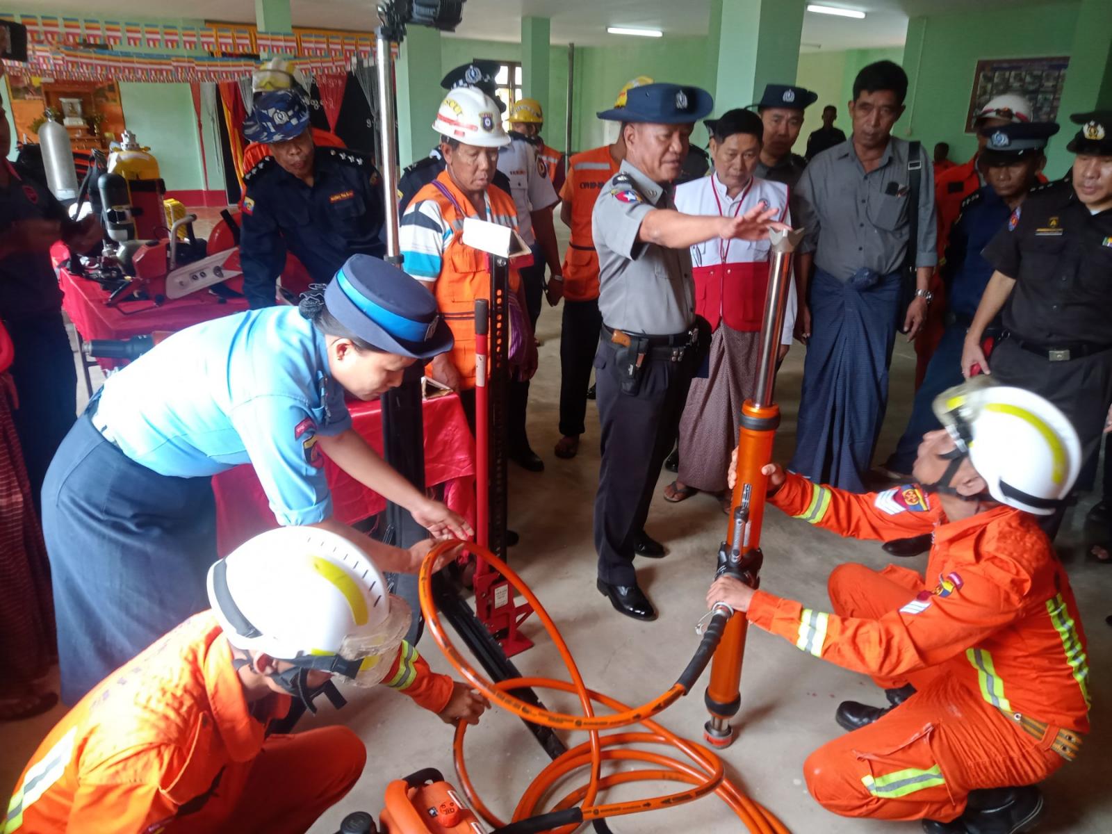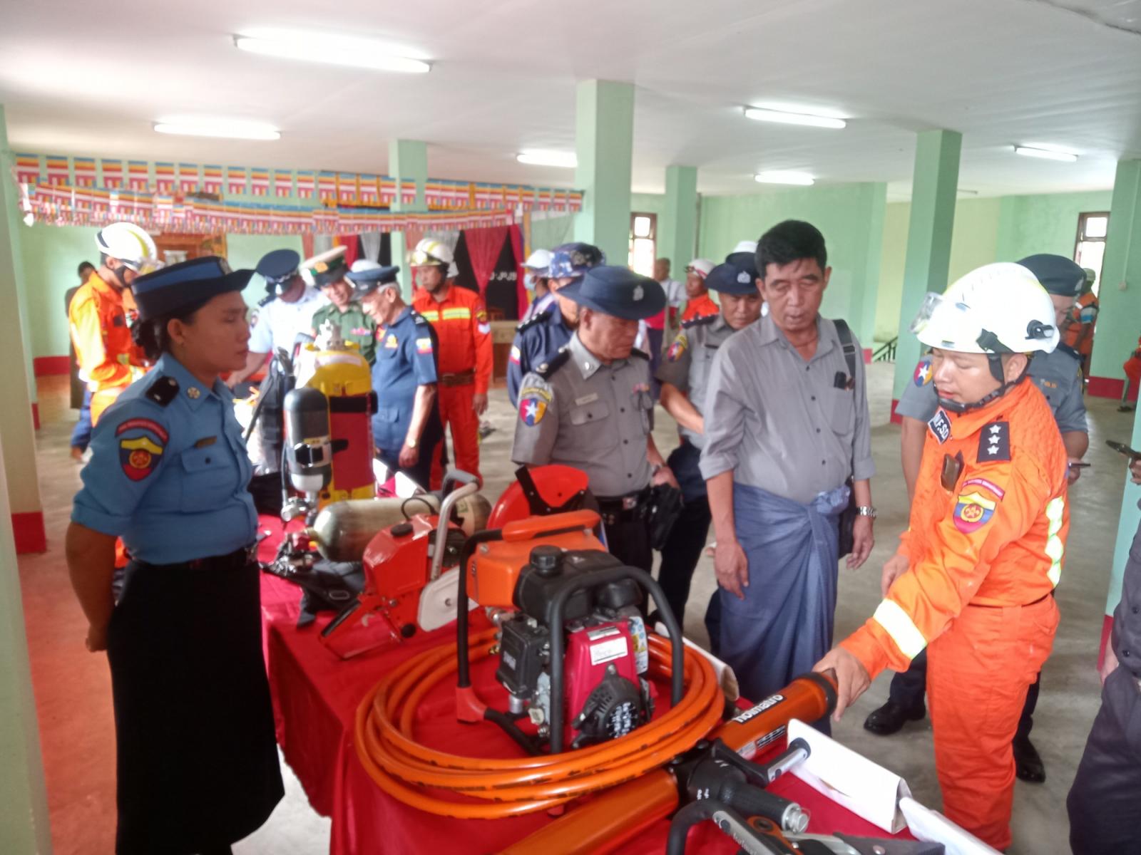 ယင်းနောက် မုန်တိုင်းသတိပေး အရေးပေါ်ထုတ်ပြန်ချက်များကို ပြည်သူလူထုများသိရှိနိုင်ရန် အသံချဲ့စက်ဖြင့် ကြေညာခြင်း၊ ကြိုတင်ပြင်ဆင်ထားသည့် ကုန်မြင့်နေရာများတွင် ဘေးလွတ်ရာနေရာများသို့ ပြောင်းရွှေ့ရာတွင်၊ သက်ကြီးရွယ်အိုနှင့် ကလေးသူငယ်များကို ကူညီပြောင်းရွှေ့ပေးခြင်း၊ ကျန်ရှိသူများကို ရှာဖွေကယ်ဆယ် ဆောင်ရွက်ပေးခြင်း၊ ဒဏ်ရာရရှိသူများကို ရှေးဦးသူနာပြုစုစောင့်ရှောက်ပေးခြင်းနှင့် ဆေးရုံ၊ ဆေးခန်းများသို့ လူနာတင်ယာဉ်ဖြင့် တင်ပို့ကူညီပေးခြင်းတို့ကို မြို့နယ်မီးသတ်ဦးစီးဌာနနှင့် မြို့နယ်ကြက်ခြေနီတပ်ဖွဲ့တို့ ပူးပေါင်း၍ ဇာတ်တိုက်လေ့ကျင့် ဆောင်ရွက်ခဲ့ကြသည်။