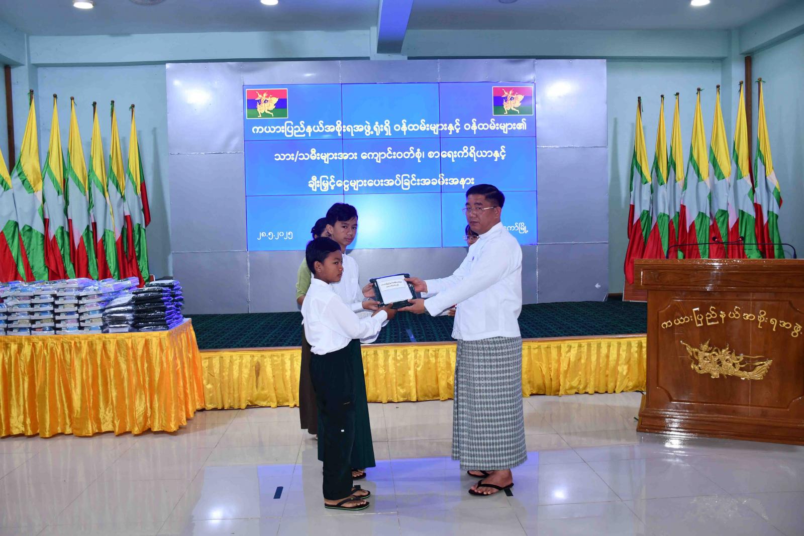 ထို့နောက် ပြည်နယ်ဝန်ကြီးချုပ်က မဟာဘွဲ့သင်တန်းတက်ရောက်နေသည့် ဝန်ထမ်းများနှင့် အဝေးသင်တက္ကသိုလ်တက်ရောက်နေသည့် ဝန်ထမ်းများအတွက် ချီးမြှင့်ငွေများအားလည်းကောင်း၊ အထက်တန်း၊ အလယ်တန်းနှင့် မူလတန်းတွင် ပညာသင်ကြားကြမည့် ဝန်ထမ်းများ၏ သားသမီးများအတွက် ကျောင်းဝတ်စုံ၊ စာရေးကိရိယာနှင့် ချီးမြှင့်ငွေများအားလည်းကောင်း ပေးအပ်ရာဝန်ထမ်းများနှင့် ကျောင်းသား၊ ကျောင်းသူများက အသီးသီးလက်ခံရယူကြသည်။ ဆက်လက်၍ ပြည်နယ်အစိုးရအဖွဲ့ဝင်များက ဝန်ထမ်းများ၏ သားသမီးများမှ တက္ကသိုလ်တက်ရောက်နေသူများ၊ အထက်တန်း၊ အလယ်တန်းနှင့် မူလတန်းတွင် တက်ရောက်ပညာသင်ကြားကြမည့် ကျောင်းသား၊ ကျောင်းသူများအတွက် ကျောင်းဝတ်စုံ၊ စာရေးကိရိယာနှင့် ချီးမြှင့်ငွေများအသီးသီးပေးအပ်ရာ ကိုယ်စားလှယ်များက လက်ခံရယူကြသည်။