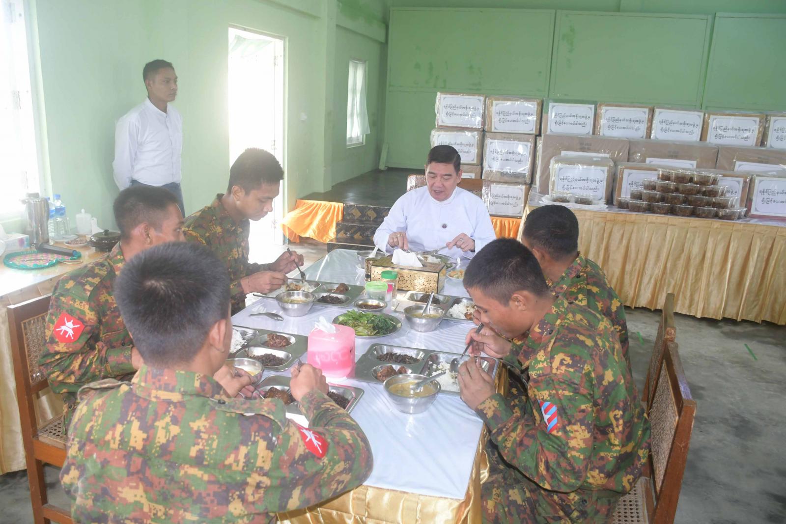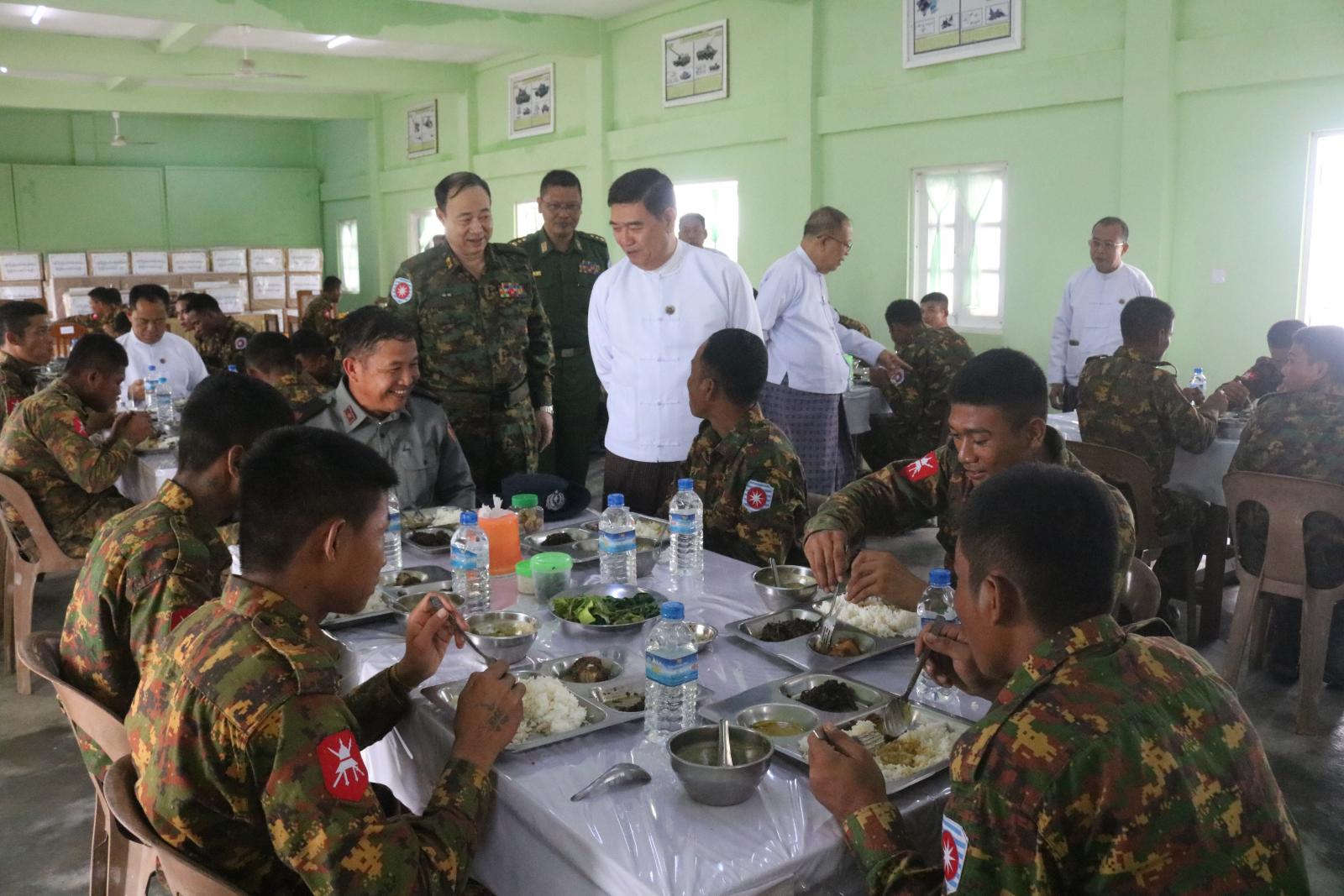 ယင်းနောက် ပြည်နယ်ဝန်ကြီးချုပ်နှင့်အဖွဲ့သည် စစ်တွေတပ်နယ်၌ လုံခြုံရေးတပ်ဖွဲ့ဝင်များအား ရခိုင်ပြည်နယ်အစိုးရအဖွဲ့က တည်ခင်းဧည့်ခံကျွေးမွေးသည့် အထူးနေ့လယ်စာ စားပွဲသို့ တက်ရောက်ကြသည်။ နေ့လယ်စာစားပွဲတွင် ရခိုင်ပြည်နယ်ဝန်ကြီးချုပ်က လုံခြုံရေးတပ်ဖွဲ့ဝင်များအတွက် စားသောက်ဖွယ်ရာများ ပေးအပ်ချီးမြှင့်ပြီး ပြည်နယ်ဝန်ကြီးချုပ်၊ တိုင်းမှူးနှင့် ပြည်နယ်အစိုးရအဖွဲ့ဝင်များသည် တပ်ဖွဲ့ဝင်များနှင့်အတူ အထူးနေ့လယ်စာကို အတူတကွ သုံးဆောင်ကြသည်။