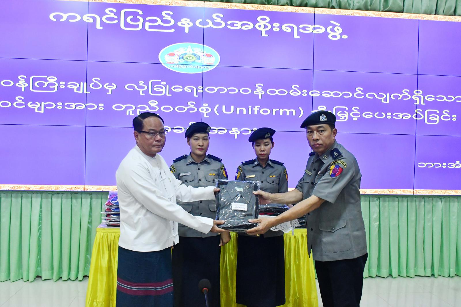 ထို့နောက် ပြည်နယ်ဝန်ကြီးချုပ်က လုံခြုံရေးတာဝန်များထမ်းဆောင်လျက်ရှိသော ပြည်နယ်၊ ခရိုင်၊ မြို့နယ် ရဲတပ်ဖွဲ့မှူးရုံးများ၊ ရဲအကူတပ်ဖွဲ့ခွဲနှင့် အမှတ် (၂၂) လုံခြုံရေးရဲတပ်ဖွဲ့ခွဲတို့မှ ရဲတပ်ဖွဲ့ဝင်များအတွက် စုစုပေါင်းငွေကျပ် ၈၂၄၀၀၀ဝိ/-(ရှစ်ဆယ်နှစ်သိန်းလေးသောင်းကျပ်)တန်ဖိုးရှိ တူညီဝတ်စုံ (Uniform) နှင့် လည်စည်းများကို ချီးမြှင့်ပေးအပ်ရာ ကရင်ပြည်နယ်ရဲတပ်ဖွဲ့မှူး ရဲမှူးကြီးအေးသိန်း ကိုယ်စား ဒုတိယပြည်နယ်ရဲတပ်ဖွဲ့မှူးက ကျေးဇူးတင်စကား ပြန်လည်ပြောကြားကာ ပြည်နယ်ဝန်ကြီးချုပ်နှင့်တာဝန်ရှိသူများသည် တက်ရောက်လာသော ရဲတပ်ဖွဲ့ဝင်များအား တစ်ဦးချင်း ရင်းနှီးနွေးထွေးစွာတွေ့ဆုံနှုတ်ဆက်၍ အားပေးစကားများ ပြောကြားခဲ့ကြောင်း သိရသည်။