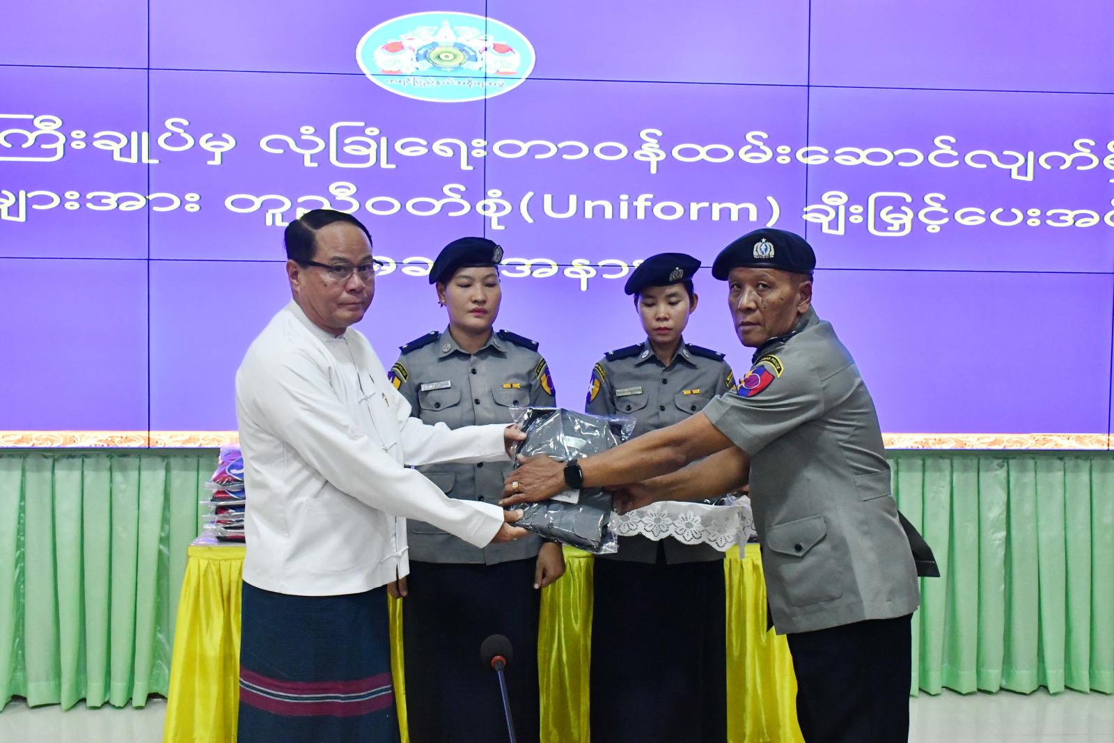 လုံခြုံရေး၊ တရားဥပဒေစိုးမိုးရေး၊ ရပ်ရွာအေးချမ်းသာယာရေး၊ မူးယစ်ဆေးဝါးအန္တရာယ်တားဆီးကာကွယ်ရေးနှင့်ပြည်သူ့အကျိုးပြုလုပ်ငန်းတာဝန်များကို ထမ်းဆောင်လျက်ရှိသော ရဲတပ်ဖွဲ့ဝင်များအား ပြည်နယ်အစိုးရအဖွဲ့ ပြည်နယ်ဝန်ကြီးချုပ်ဦးစောမြင့်ဦးက တူညီဝတ်စုံ(Uniform)များ ချီးမြှင့်ပေးအပ်သည့်အခမ်းအနားကို ဇွန်လ ၃ ရက်နေ့ မွန်းလွဲ ၂ နာရီက ပြည်နယ်အစိုးရအဖွဲ့ရုံး အစည်းအဝေးခန်းမ (၂) ၌ ကျင်းပသည်။