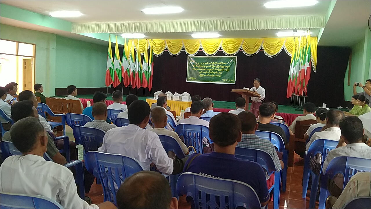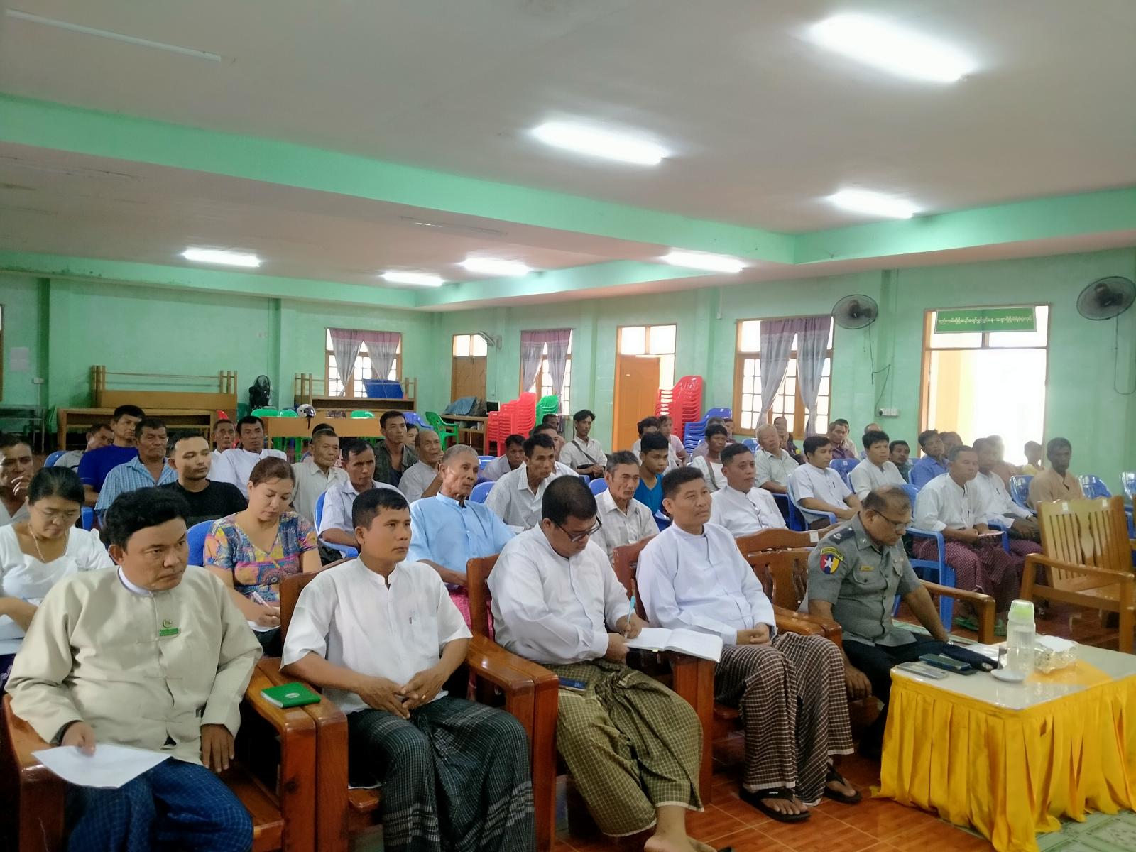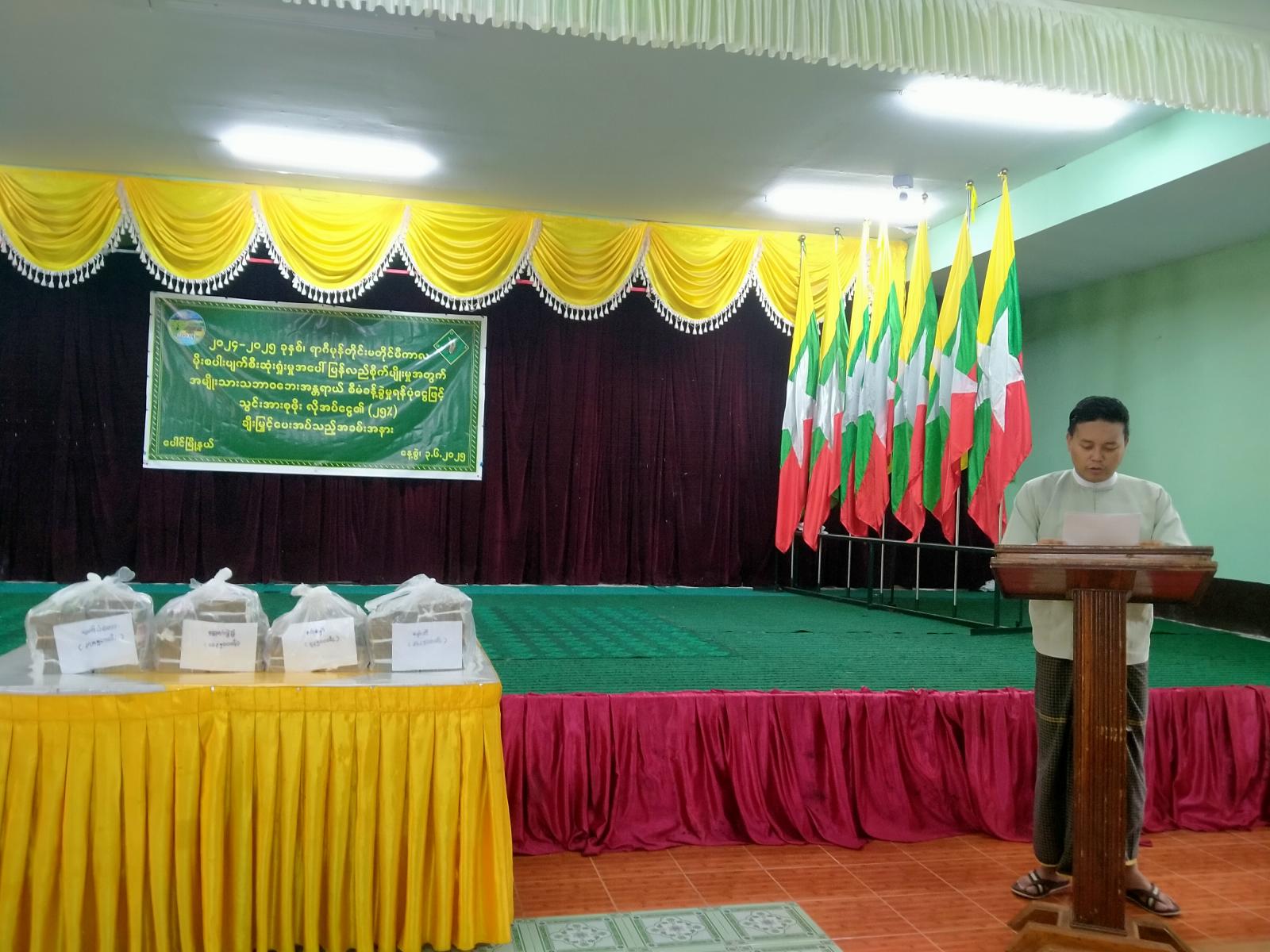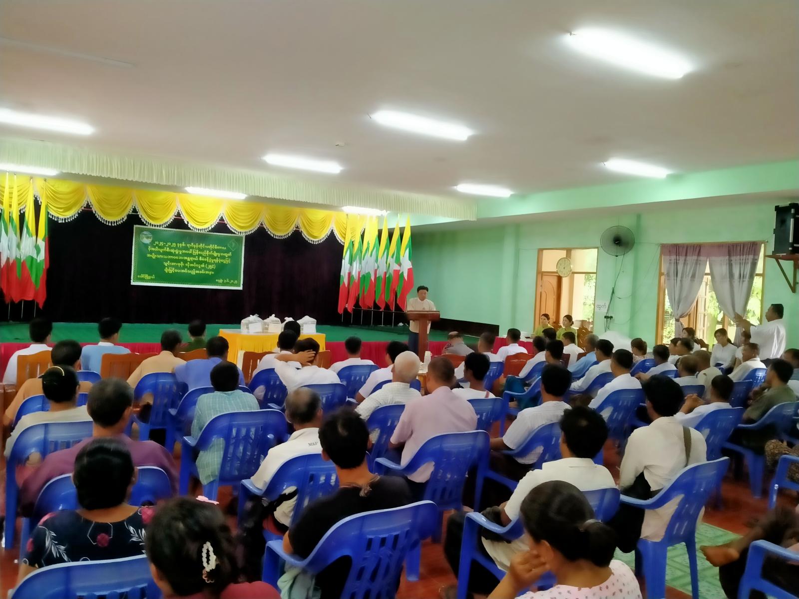 ရှေးဦးစွာ မြို့နယ်စီမံအုပ်ချုပ်ရေးအဖွဲ့ဥက္ကဋ္ဌ ဦးထင်လင်းအောင်က နိုင်ငံတော်အနေဖြင့် အမျိုးသားသဘာဝဘေးအန္တရာယ်စီမံခန့်ခွဲမှု ရန်ပုံငွေဖြင့် မိုစပါးပျက်စီးသွားပြီး ပြန်လည်စိုက်ပျိုးခဲ့သည့် ရွာ(၄)ရွာလယ်မြေဧက(၁၄၁၆) ၏ သွင်းအားစုဖိုး၏လိုအပ်ငွေ(၂၅%) တစ်ဧကလျှင် ကျပ်ငါးသောင်းနှုန်းဖြင့် ချီးမြှင့်ပေးအပ်သွားမည်ဖြစ်ပါကြောင်း၊ တောင်သူများအနေဖြင့် စိုက်ဘဏ်ချေးငွေကိုလည်း အချိန်မီ အပြေအကြေဆပ်နိုင်ရန်လိုအပ်ကြောင်း ပြောကြားခဲ့သည်။