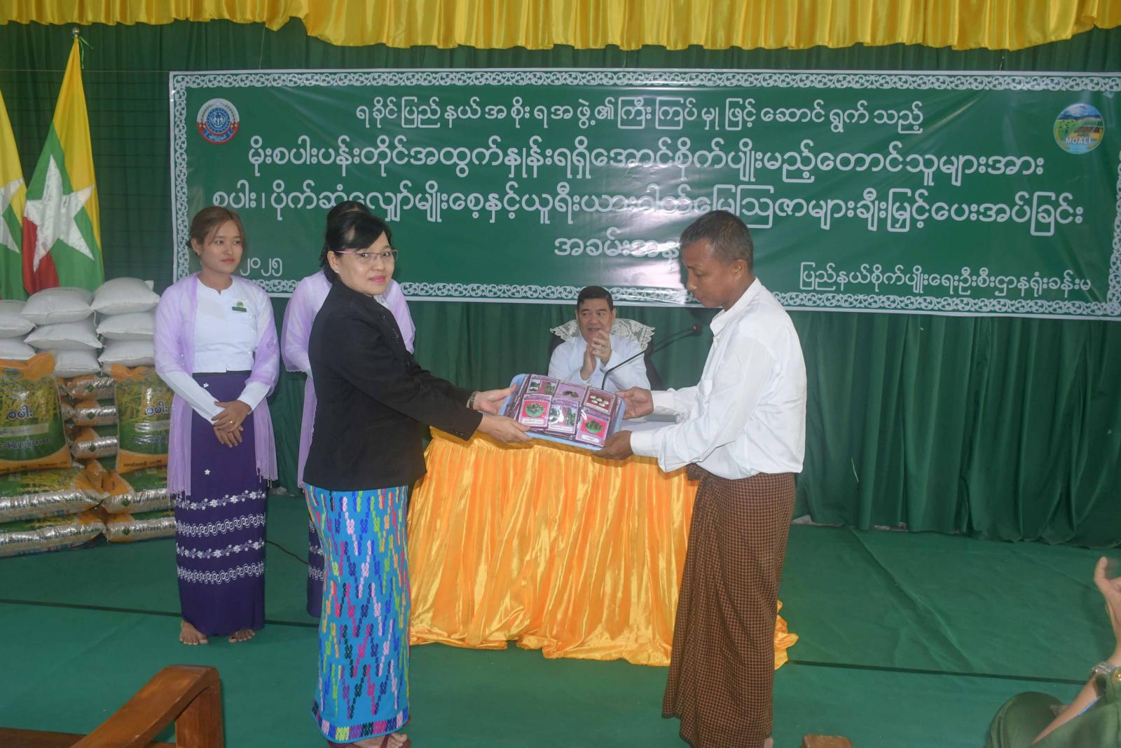 ထို့နောက် စိုက်ပျိုးရေးဦးစီးဌာန၊ ပြည်နယ်ဦးစီးမှူးက မျိုးစပါး၊ ပိုက်ဆံလျှော်မျိုးစေ့၊ ယူရီးယား ဓာတ်မြေဩဇာများ ချီးမြှင့်ပေးအပ်ခြင်းနှင့် နည်းပညာပေးရက်တိုသင်တန်း ဖွင့်လှစ်ရခြင်းနှင့် ပတ်သက်၍ ရှင်းလင်းတင်ပြသည်။ ယင်းနောက် ပြည်နယ်ဝန်ကြီးချုပ် ဦးထိန်လင်းက တောင်သူများ အား မျိုးစပါးနှင့် ပိုက်ဆံလျှော်မျိုးစေ့များအားလည်းကောင်း၊ ပြည်နယ်တရား လွှတ်တော်တရားသူကြီးချုပ်က ယာယီနေရပ်စွန့်ခွာပြည်သူများအား ဟင်းသီးဟင်းရွက်မျိုးစေ့များအားလည်းကောင်း၊ ပြည်နယ်လုံခြုံရေးနှင့်နယ်စပ်ရေးရာဝန်ကြီးက ယူရီးယားဓာတ်မြေ ဩဇာများအားလည်းကောင်း၊ ပြည်နယ်စီးပွားရေးရာဝန်ကြီးက နည်းပညာပေးလက်ကမ်း စာစောင်များအားလည်းကောင်းပေးအပ်ကြရာ တောင်သူတစ်ဦးက ကျေးဇူးတင်စကားပြန်လည် ပြောကြားခဲ့သည်။ဆက်လက်၍ ပြည်နယ်ဝန်ကြီးချုပ်နှင့် အဖွဲ့သည် အခမ်းအနားသို့ တက်ရောက်လာကြသည့် တောင်သူများအား ရင်းရင်းနှီးနှီးတွေ့ဆုံနှုတ်ဆက် ကာ စိုက်ပျိုးရေးဦးစီးဌာနမှဝန်ထမ်းများက သဘာဝပိုးနှင်ဆေးပြုလုပ်ခြင်း၊ ငါးအမိုင်နိုအက်ဆစ်ပြုလုပ် ခြင်း၊ စူပါဘိုကာရှီပြုလုပ်ခြင်းတို့ကို လက်တွေ့သရုပ်ပြသနေမှုအား ကြည့်ရှုအားပေးကြပြီး လိုအပ်သည် များကို တာဝန်ရှိသူများနှင့် ညှိနှိုင်းပေါင်းစပ်ပေးခဲ့သည်။