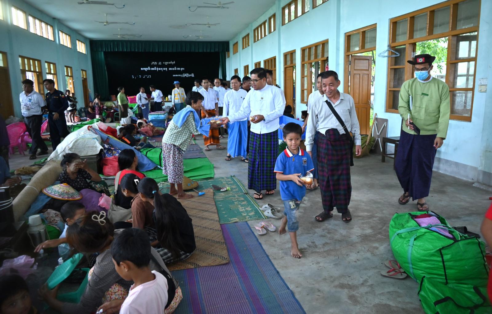 ထို့မှတစ်ဆင့် ပြည်နယ်ဝန်ကြီးချုပ်နှင့် အဖွဲ့ဝင်များသည် မြို့သစ်ကြီးရပ်ကွက် အောင်ဇေရန် အောင်ဘုန်းတော်ကြီးကျောင်း ရေဘေးကယ်ဆယ်ရေးစခန်းသို့ သွားရောက်ပြီး စခန်းအတွင်းရှိ အိမ်ထောင်စုများအား ရေပြန်လည်ကျဆင်းနေပြီဖြစ်သည့်အတွက် မကြာမီ မိမိတို့၏နေအိမ်များသို့ ပြန်လည်ရွေ့ပြောင်းနေထိုင်ကြရမည်ဖြစ်ပါကြောင်း၊ သို့ဖြစ်ပါ၍ ရှင်းလင်းရေးလုပ်ငန်းများနှင့် နောက်ဆက်တွဲ ကျန်းမာရေးစောင့်ရှောက်မှုများပေးအပ်နိုင်ရေး စီမံဆောင်ရွက်ပေးသွားမည် ဖြစ်ပါကြောင်း အားပေးပြောကြားကာ အိမ်ထောင်စုများအား ထမင်းထုတ်များနှင့် မုန့်များကို ပေးအပ်ခဲ့ကြသည်။