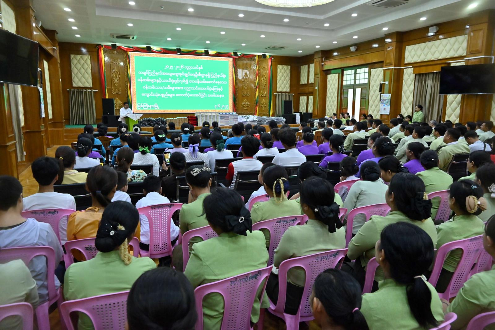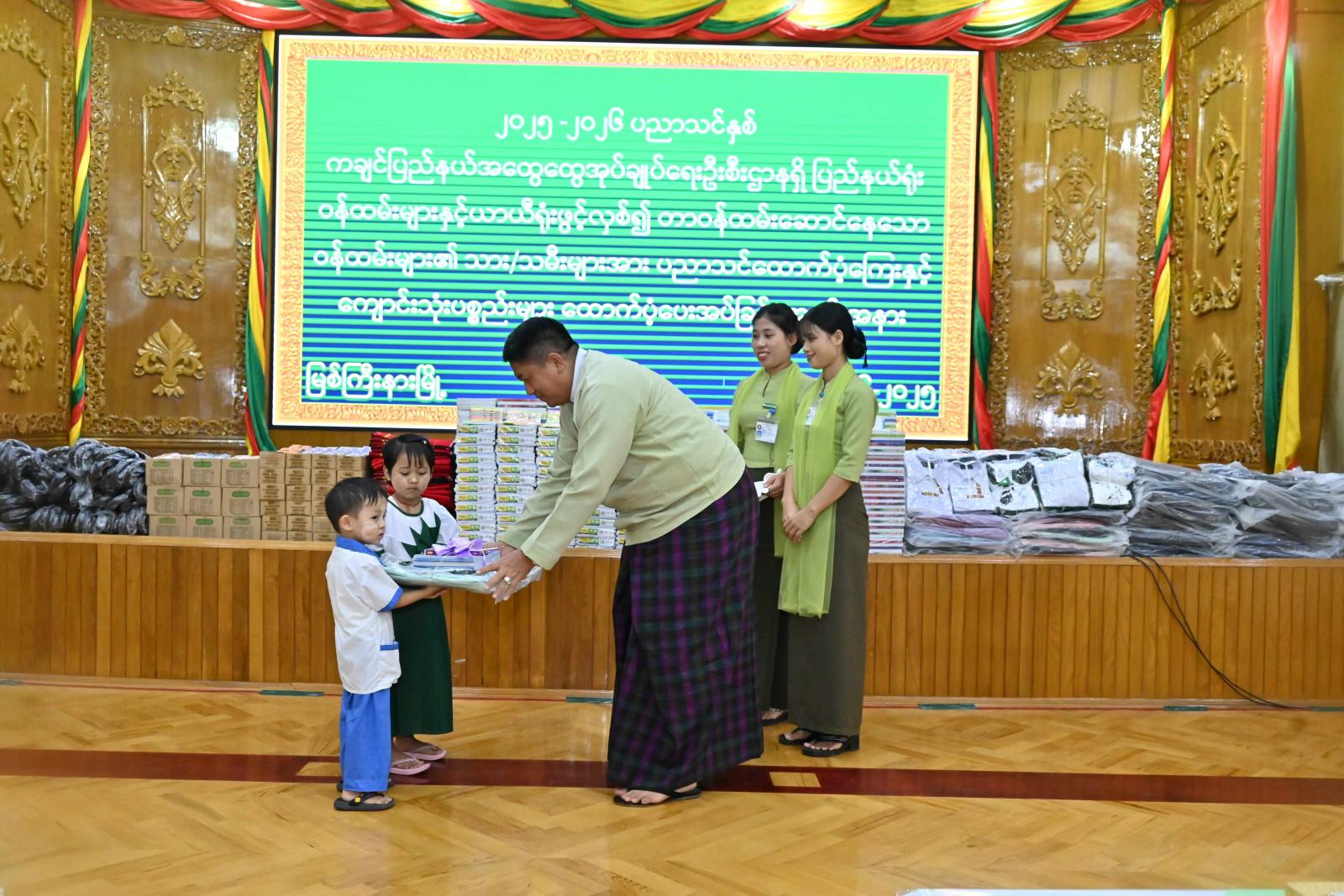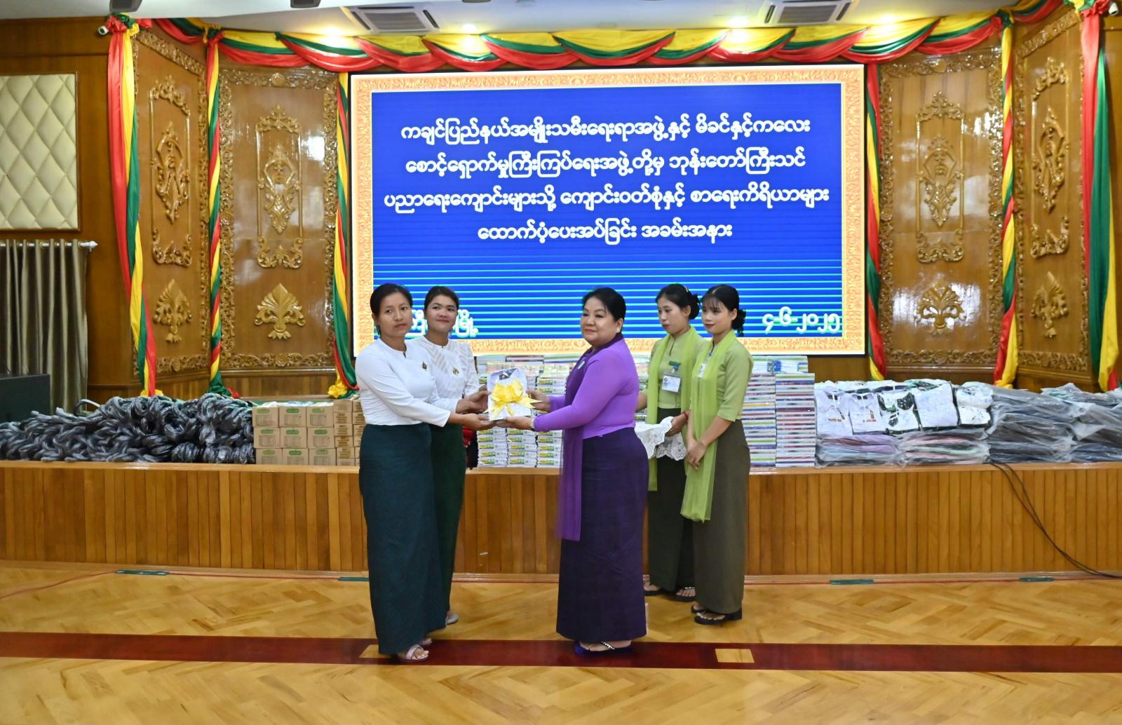 ထို့နောက် ပြည်နယ်ဝန်ကြီးချုပ်နှင့် ဇနီးဒေါ်နန်ဆိုင်း၊ ပြည်နယ်တရားလွှတ်တော်တရား သူကြီးချုပ်၊ ပြည်နယ်အစိုးရအဖွဲ့ဝင် လုံခြုံရေးနှင့် နယ်စပ်ရေးရာဝန်ကြီး၊ စီးပွားရေးရာဝန်ကြီးနှင့် အစိုးရအဖွဲ့အတွင်းရေးမှူးတို့က ပြည်နယ်အထွေထွေအုပ်ချုပ်ရေးဦးစီးဌာန၊ ပြည်နယ်ရုံးနှင့် ယာယီရုံးဖွင့်လှစ်တာဝန်ထမ်းဆောင်နေသော ဝန်ထမ်းသား/ သမီးတက္ကသိုလ်တက်ရောက်နေသော ကျောင်းသား/ ကျောင်းသူ (၄၂)ဦး၊ အထက်တန်းအဆင့် (၃၄)ဦး၊ အလယ်တန်းအဆင့် (၄၁)ဦးနှင့် မူလတန်းအဆင့် (၁၄၈)ဦး၊ စုစုပေါင်း (၃၀၉)ဦးတို့အတွက် ပညာသင်ထောက်ပံ့ကြေးအဖြစ် ငွေကျပ် (၉၀၅ ၀၀၀၀)နှင့် ငွေကျပ် (၂၄၄၅၀၀၀၀)တန်ဖိုးရှိ ဗလာစာအုပ်၊ ဘောပင်၊ လွယ်အိတ်၊ ထီးနှင့် ကျောင်း ဝတ်စုံများကို အသီးသီးထောက်ပံ့ပေးအပ်ခဲ့ကြသည်။