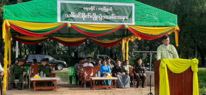 အခမ်းအနားတွင် ရေးခရိုင် စီမံအုပ်ချုပ်ရေးအဖွဲ့ဥက္ကဋ္ဌ ခရိုင်အုပ်ချုပ်ရေးမှူး ဦးစန်းမင်းကကမ္ဘာ့ပတ်ဝန်းကျင် ထိန်းသိမ်းရေးနေ့ အထိမ်းအမှတ် ၂၀၂၅ ခုနှစ်၊ မိုးရာသီသစ်ပင်စိုက်ပျိုးပွဲကျင်းပရခြင်းရည်ရွယ်ချက်၊ အကျိုးကျေးဇူးများနှင့် ပတ်သက်၍ အဖွင့်အမှာစကားပြောကြားပြီး မြို့နယ်သစ်တော ဦးစီးဌာနမှူးဦးစီးအရာရှိဦးရွှေနိုင်က အပင်ရှင်သန်ကြီးထွားစေရေး စိုက်ပျိုးနည်းစနစ်များကို ရှင်းလင်း ပေးသည်။
