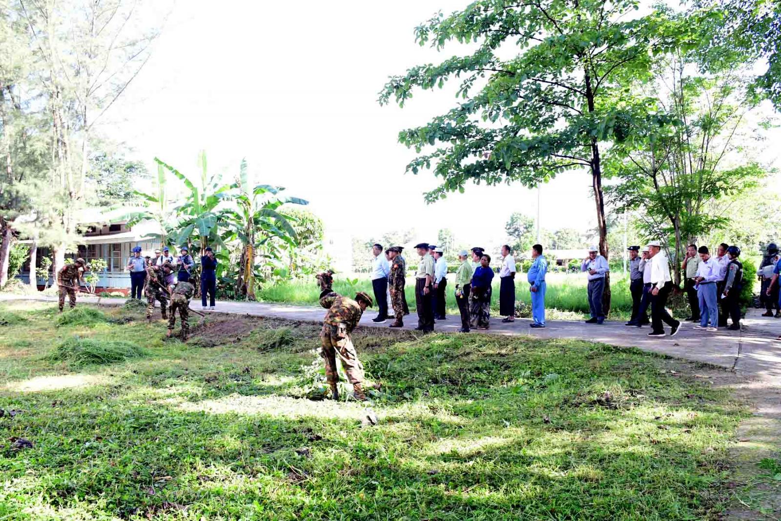 ရှေးဦးစွာ ပြည်နယ်ဝန်ကြီးချုပ်နှင့် တာဝန်ရှိသူများသည် လွိုင်ကော်မြို့၊ ခုတင် ၅၀၀ ဆံ့ ပြည်သူ့ဆေးရုံကြီးနှင့် သူနာပြုနှင့် သားဖွားသင်တန်းကျောင်းဝင်းအတွင်း နယ်မြေခံတပ်ရင်းတပ်ဖွဲ့များ၊ ရဲတပ်ဖွဲ့ဝင်များ၊ မီးသတ်တပ်ဖွဲ့ဝင်များ၊ ကျန်းမာရေးဝန်ထမ်းများ၊ သူနာပြုသင်တန်းကျောင်းမှ သင်တန်းသူများ၊ ဌာနဆိုင်ရာဝန်ထမ်းများက စုပေါင်းသန့်ရှင်းရေး ဆောင်ရွက်နေမှုတို့ကို လှည့်လည်ကြည့်ရှုပြီး သန့်ရှင်းရေးဆောင်ရွက်နေကြသူများအား ရင်းရင်းနှီးနှီးနှုတ်ဆက်အားပေးသည်။ ပြည်နယ်ဝန်ကြီးချုပ်က မြို့သန့်ရှင်းသာယာလှပရေးနှင့် စိမ်းလန်းစိုပြည်ရေးအတွက် ဌာနဆိုင်ရာရုံးများ၊ ကျောင်းများ၊ အများနှင့် သက်ဆိုင်သည့်နေရာများ၊ လူနေရပ်ကွက်များ၌ သန့်ရှင်းသာယာရေး လုပ်ငန်းများကို စဉ်ဆက်မပြတ် ဆောင်ရွက်သွားကြရန် တာဝန်ရှိသူများအား မှာကြားခဲ့သည်။