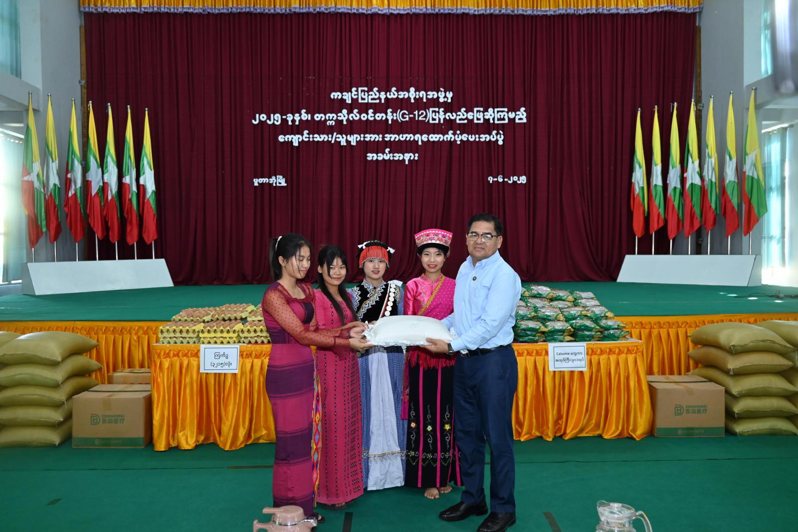 ကချင်ပြည်နယ်၊ ပူတာအိုခရိုင်အတွင်း မိုးသည်းထန်စွာ ရွာသွန်းမှုကြောင့် ရေဘေးသင့်ပြည်သူများအား ကူညီထောက်ပံ့ပေးနိုင်ရေး ပူတာအိုမြို့သို့ရောက်ရှိနေသော ပြည်နယ်ဝန်ကြီးချုပ် ဦးခက်ထိန်နန်သည် ပြည်နယ်သယံဇာတရေးရာဝန်ကြီး၊ ပြည်နယ်အဆင့်ဌာနဆိုင်ရာတာဝန်ရှိသူများ နှင့်အတူ ဇွန် ၇ ရက် နံနက် ၉ နာရီက ဖုန်ကုန်ရာဇီခန်းမ၌ ၂၀၂၅ ခုနှစ်၊ တက္ကသိုလ်ဝင်စာမေးပွဲ ပြန်လည်ဖြေဆိုကြမည့် ကျောင်းသား/ ကျောင်းသူများအား အာဟာရထောက်ပံ့ပေးအပ်ခြင်းနှင့် ဒေသဖွံ့ဖြိုးတိုးတက်ရေးလုပ်ငန်းများအတွက် ထောက်ပံ့ငွေများပေးအပ်ပွဲအခမ်းအနားကို ကျင်းပပြု လုပ်ရာ အခြေခံပညာအထက်တန်းကျောင်း(ပူတာအို)မှ ကျောင်းသား/ ကျောင်းသူလေးများက တေးသရုပ်ဖော်အကအလှများဖြင့် ဖျော်ဖြေတင်ဆက်၍ အခမ်းအနားကို ဖွင့်လှစ်ပေးခဲ့ကြောင်း သိရသည်။