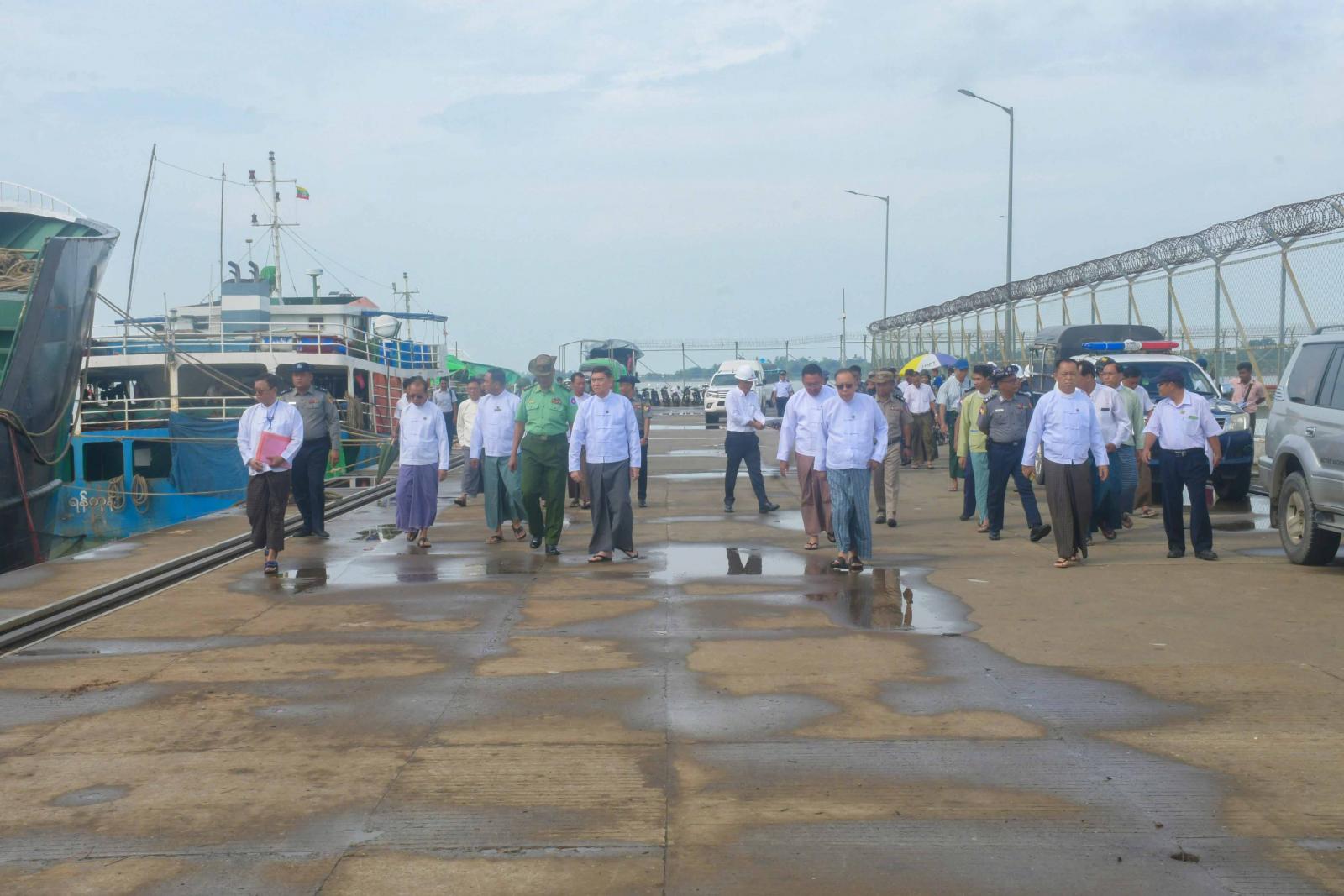 ဦးစွာ ပြည်နယ်ဝန်ကြီးချုပ်နှင့်အဖွဲ့သည် အမ်ဗွီရဲထွန်းအောင်(၁) သင်္ဘောတွင် ဆန်နှင့်အခြေခံစားသုံးကုန်ပစ္စည်းများအား ကုန်တင်ကုန်ချပြုလုပ်နေမှုကို သွားရောက်ကြည့်ရှုစစ်ဆေးကြပြီး ကုန်ပစ္စည်းများအား စနစ်တကျအတင်အချပြုလုပ်နိုင်ရေး၊ ဈေးကွက်အတွင်းအမြန်ဆုံးဖြန့်ဖြူး ရောင်းချရေး၊ ကုန်ပစ္စည်းများ ပျက်စီးဆုံးရှုံးမှုမဖြစ်စေရေး၊ လိုအပ်မှုမရှိသောနေရာများသို့ မရောက်ရှိစေနိုင်ရေးနှင့် ဘေးအန္တရာယ်ကင်းရှင်းစွာ ဆောင်ရွက်နိုင်ရေးတို့ကိုမှာကြားပြီး လိုအပ်သည်များကို တာဝန်ရှိသူများနှင့် ပေါင်းစပ်ညှိနှိုင်းပေးခဲ့သည်။