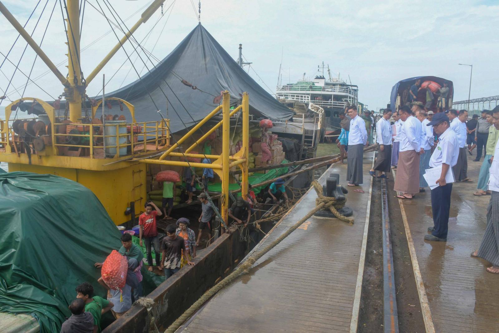အမျိုးသားသဘာဝဘေးအန္တရာယ်ဆိုင်ရာစီမံခန့်ခွဲမှုကော်မတီ၏ လမ်းညွှန်မှုအရ ရခိုင်ပြည်နယ်အစိုးရအဖွဲ့နှင့် ရန်ကုန်တိုင်းဒေသကြီးအစိုးရအဖွဲ့၏ စီစဉ်ကြီးကြပ်မှုဖြင့် ရခိုင်ပြည်နယ်သို့ သင်္ဘောများဖြင့် ဆန်နှင့်အခြေခံစားသောက်ကုန်ပစ္စည်းများကို ပို့ဆောင်ပေးလျက်ရှိရာ စစ်တွေမြို့ ဘက်စုံသုံး ဆိပ်ကမ်းတွင် အမ်ဗွီရဲထွန်းအောင်(၁)သင်္ဘော၊ အမ်ဗွီအောင်ရတနာသီရိ(၁)သင်္ဘော၊ အမ်ဗွီအောင်ရတနာဌေး သင်္ဘောနှင့်အမ်ဗွီမင်းခန့်ဖြိုးသင်္ဘောတို့ဖြင့် ရန်ကုန်မြို့မှ ဆန်နှင့်အခြေခံစားသောက်ကုန်ပစ္စည်းများ၊ လူသုံးကုန်ပစ္စည်းများရောက်ရှိလာမှုကို ရခိုင်ပြည်နယ်ဝန်ကြီးချုပ် ဦးထိန်လင်းနှင့် ပြည်နယ်အစိုးရအဖွဲ့ဝင်များ၊ ဌာနဆိုင်ရာ တာဝန်ရှိသူများသည် ယနေ့နံနက်ပိုင်းက သွားရောက်ကြည့်ရှုစစ်ဆေးကြသည်။