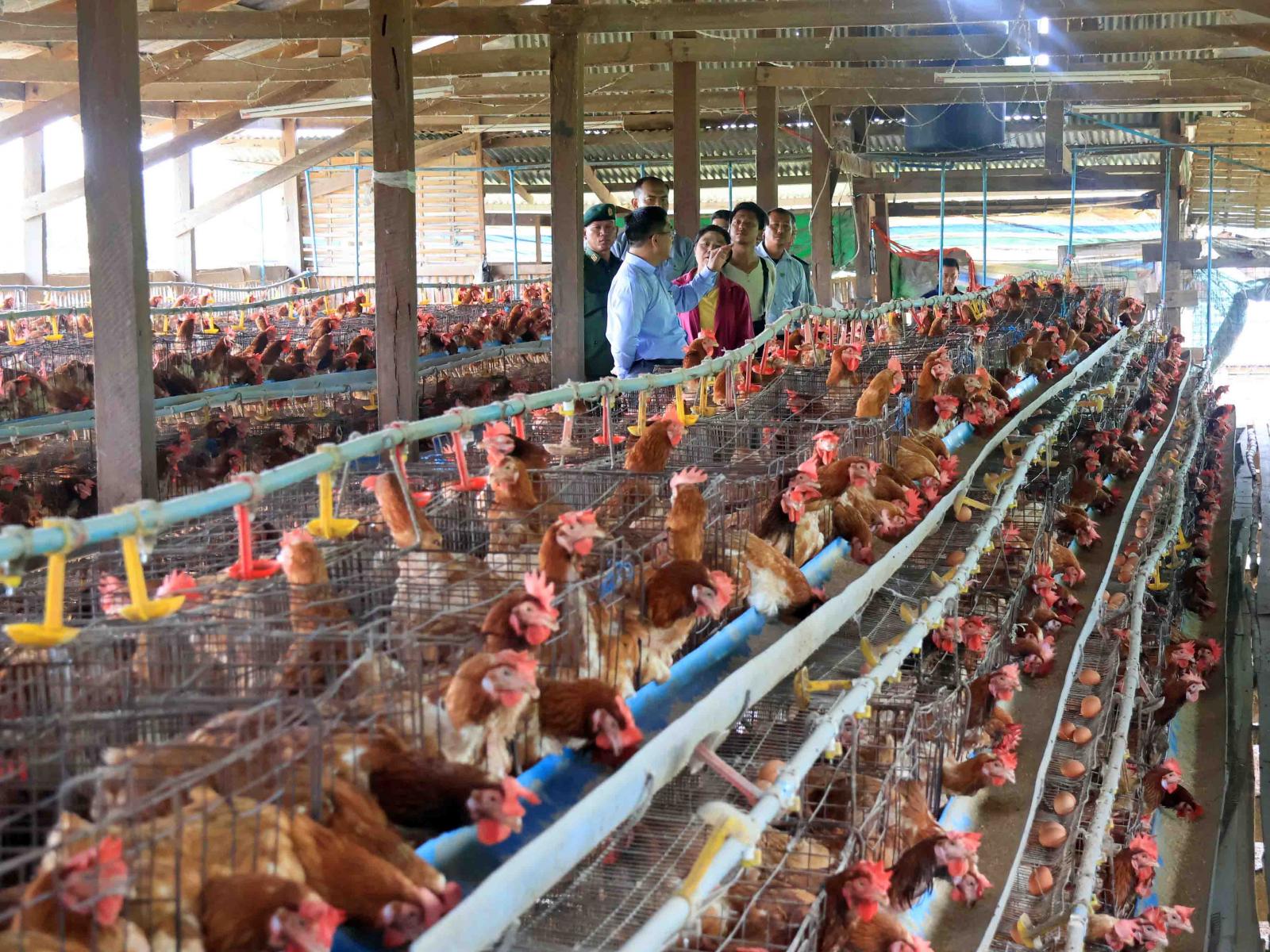 ဆက်လက်၍ လွိုင်ကော်မြို့၊ ပန်ကန်းကျေးရွာရှိ ဥစားကြက်မွေးမြူရေးခြံများသို့ သွားရောက်ကာ ဥစားကြက်များ မွေးမြူအောင်မြင်ဖြစ်ထွန်းနေမှုအခြေအနေများအား လှည့်လည် ကြည့်ရှုစစ်ဆေးသည်။ မွေးမြူရေးလုပ်ငန်းရှင်များနှင့် တာဝန်ရှိသူများက မွေးမြူထားရှိသည့် အခြေ အနေများအား ရှင်းလင်းတင်ပြခဲ့သည်။ ပြည်နယ်ဝန်ကြီးချုပ်က ကြက်မွေးမြူရေးခြံများသည် ပတ်ဝန်းကျင် အခြေအနေကောင်းများရှိသဖြင့် ယခုထက် ပိုမိုတိုးချဲ့မွေးမြူနိုင်အောင် ကြိုးပမ်း ဆောင်ရွက်သွားရန် ဖြစ်ကြောင်း၊ အရင်းအနှီးလိုအပ်ချက်များရှိလာပါက နိုင်ငံ့စီးပွား မြှင့်တင်ရေး ရန်ပုံငွေမှ ထပ်မံပံ့ပိုးကူညီပေး မည်ဖြစ်ကြောင်း၊ မွေးမြူရေးခြံများအား စံသတ်မှတ်ချက် များနှင့် အညီ စနစ်တကျ မွေးမြူနိုင်အောင် ဆောင်ရွက်သွားကြရန် မှာကြားခဲ့သည်။