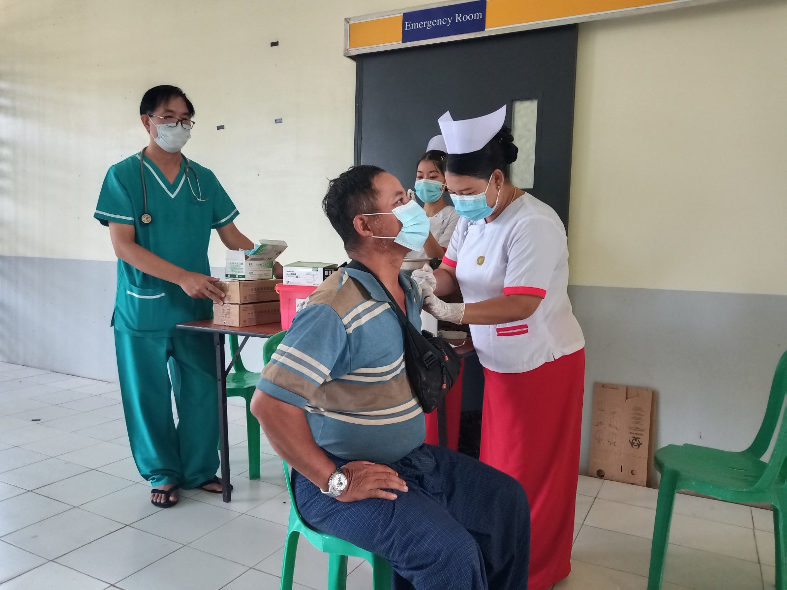 ယင်းသို့ထိုးနှံပေးရာသို့ တစ်ကြိမ်တစ်ခါမျှ မထိုးနှံရသေးသောသူများ၊ အကြိမ်ရေမပြည့်သေးသူများနှင့် ထပ်ဆောင်းထိုးနှံသူများအား လိုအပ်သည့်ကျန်းမာရေးဆိုင်ရာ ကိစ္စရပ်များကို မြို့နယ်ဆရာဝန်ကြီး ဒေါက်တာခွန်မောင်အိုး ဦးဆောင်သော ကျန်းမာရေး ဝန်ထမ်းများက မေးမြန်းကာ Pfizer. JN-1(Grey Cap) ကာကွယ်ဆေးကို ထိုးနှံပေးသည်။