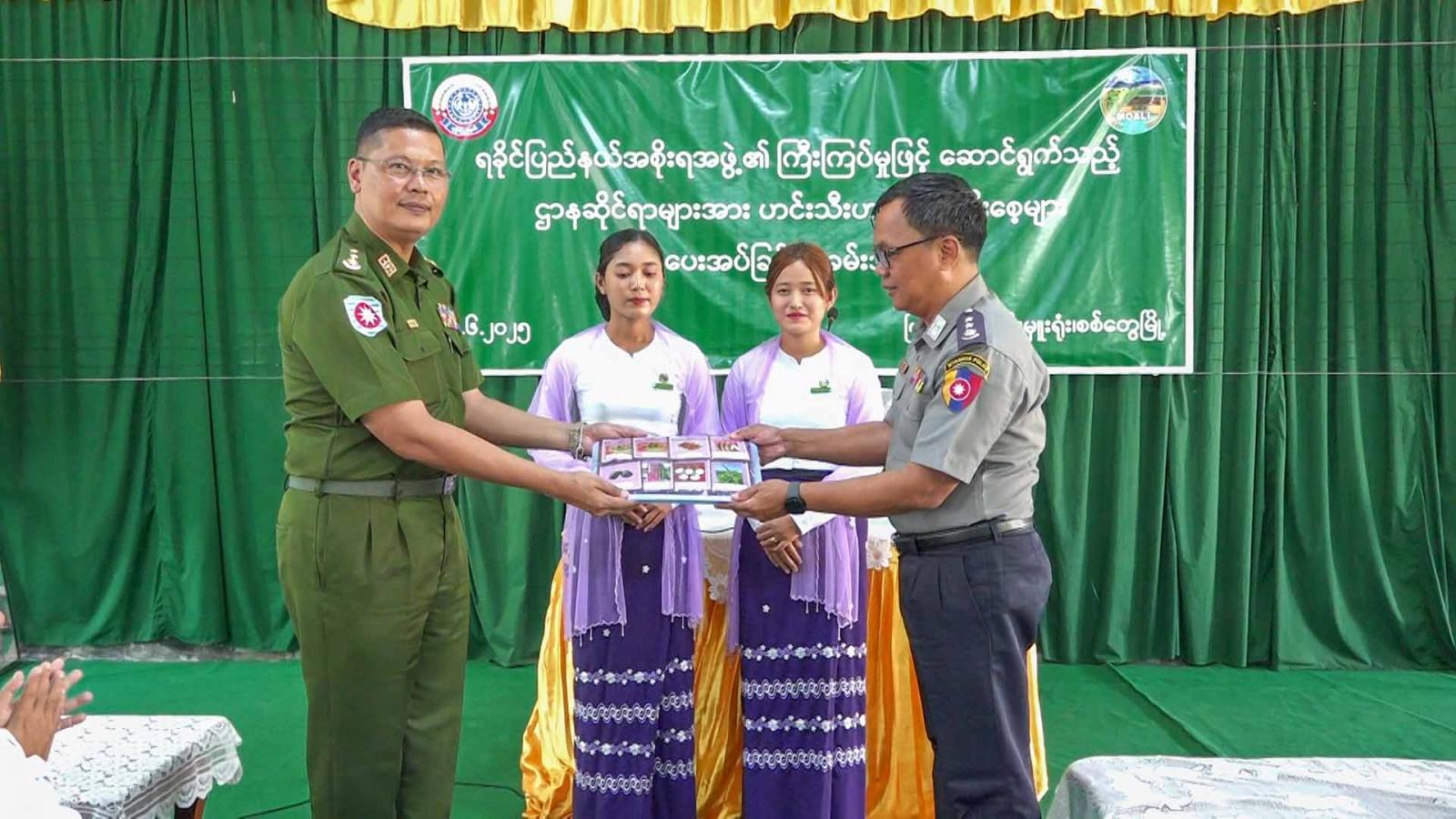 ရခိုင်ပြည်နယ်အစိုးရအဖွဲ့၏ ကြီးကြပ်မှုဖြင့် ဌာနဆိုင်ရာများအား ဟင်းသီးဟင်းရွက် မျိုးစေ့များနှင့် လက်ကမ်းစာစောင်များပေးအပ်ခြင်းအခမ်းအနားကို ယနေ့နံနက်ပိုင်းက ပြည်နယ်စိုက်ပျိုးရေးဦးစီးဌာန၌ ကျင်းပရာ ရခိုင်ပြည်နယ်အစိုးရအဖွဲ့ လုံခြုံရေးနှင့်နယ်စပ်ရေးရာဝန်ကြီး ဗိုလ်မှူးကြီး ကျော်သူရ၊ ပြည်နယ်အဆင့်ဌာနဆိုင်ရာများနှင့် ဖိတ်ကြားထားသူများ တက်ရောက်ကြသည်။
