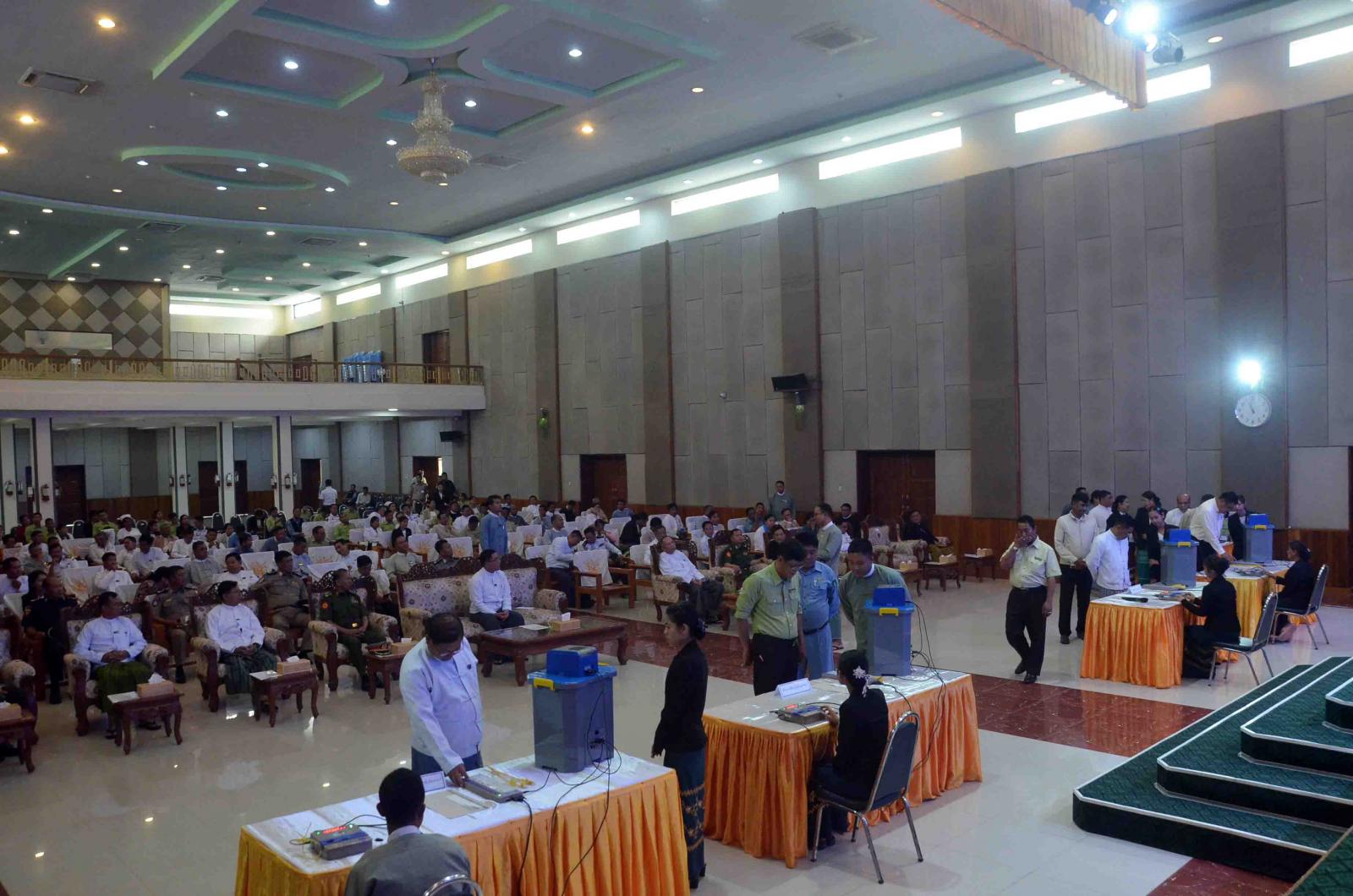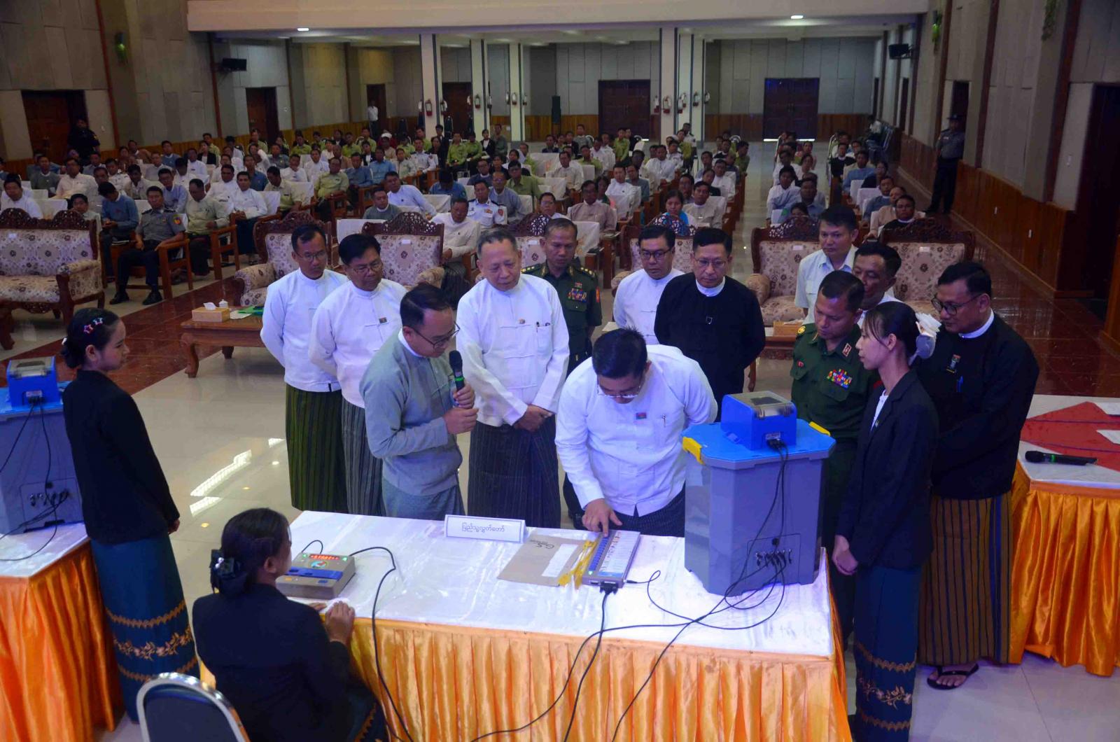 မြန်မာအီလက်ထရောနစ်မဲပေးစက် (MEVM) သရုပ်ပြစမ်းသပ်မဲပေးခြင်းနှင့် နည်းပြဆရာဖြစ်သင်တန်းဖွင့်ပွဲကို ယနေ့နံနက်က လွိုင်ကော်မြို့၊ ပြည်နယ်ခန်းမ၌ကျင်းပရာ ပြည်နယ်ဝန်ကြီးချုပ် ဦးဇော်မျိုးတင်၊ ပြည်ထောင်စုရွေးကောက်ပွဲကော်မရှင်အဖွဲ့ဝင် ကယားပြည်နယ်တာဝန်ခံ ဦးခင်မောင်ဦး၊ ဒေသကွပ်ကဲရေးမှူး၊ ပြည်နယ်တရားသူကြီးချုပ်၊ ပြည်နယ်အစိုးရအဖွဲ့ဝင်များ၊ ဌာနဆိုင်ရာများနှင့် ဌာနဆိုင်ရာအသီးသီးမှ အရာထမ်း၊ အမှုထမ်း သင်တန်းသား၊ သင်တန်းသူများ တက်ရောက်ကြသည်။