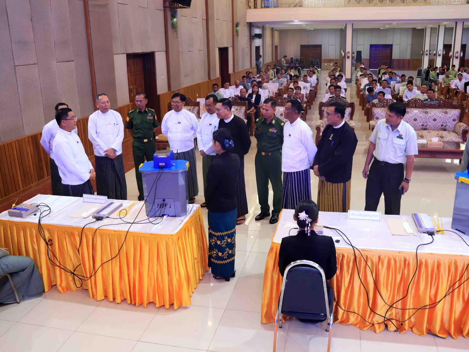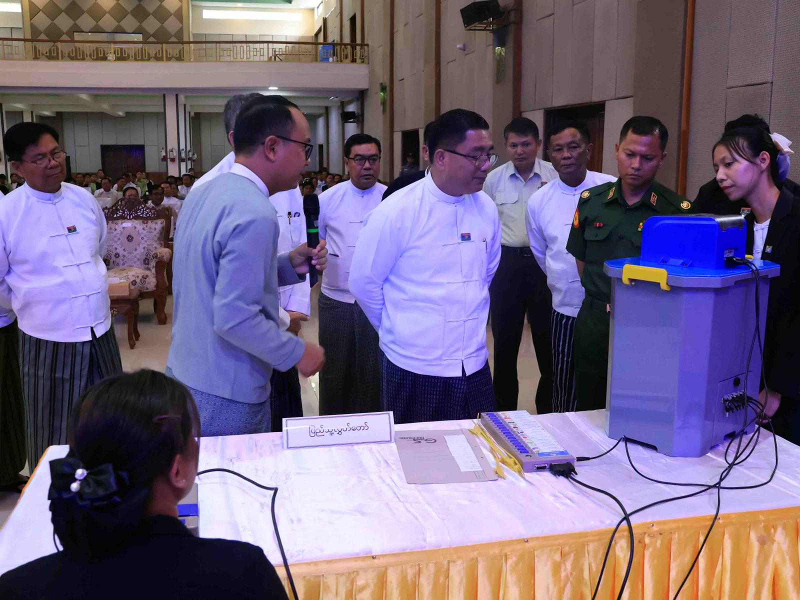 ဆက်လက်၍ ပြည်နယ်ဝန်ကြီးချုပ်နှင့်တာဝန်ရှိသူများသည် မြန်မာအီလက်ထရောနစ်မဲပေးစက် (MEVM) အသုံးပြု၍ လက်တွေ့စမ်းသပ်မဲပေးခြင်းဆောင်ရွက်ခဲ့ကြပြီး တက်ရောက်လာသည့် ဌာနဆိုင်ရာဝန်ထမ်းများ လက်တွေ့စမ်းသပ်မဲပေးနေမှုများကို ကြည့်ရှုအားပေးခဲ့သည်။