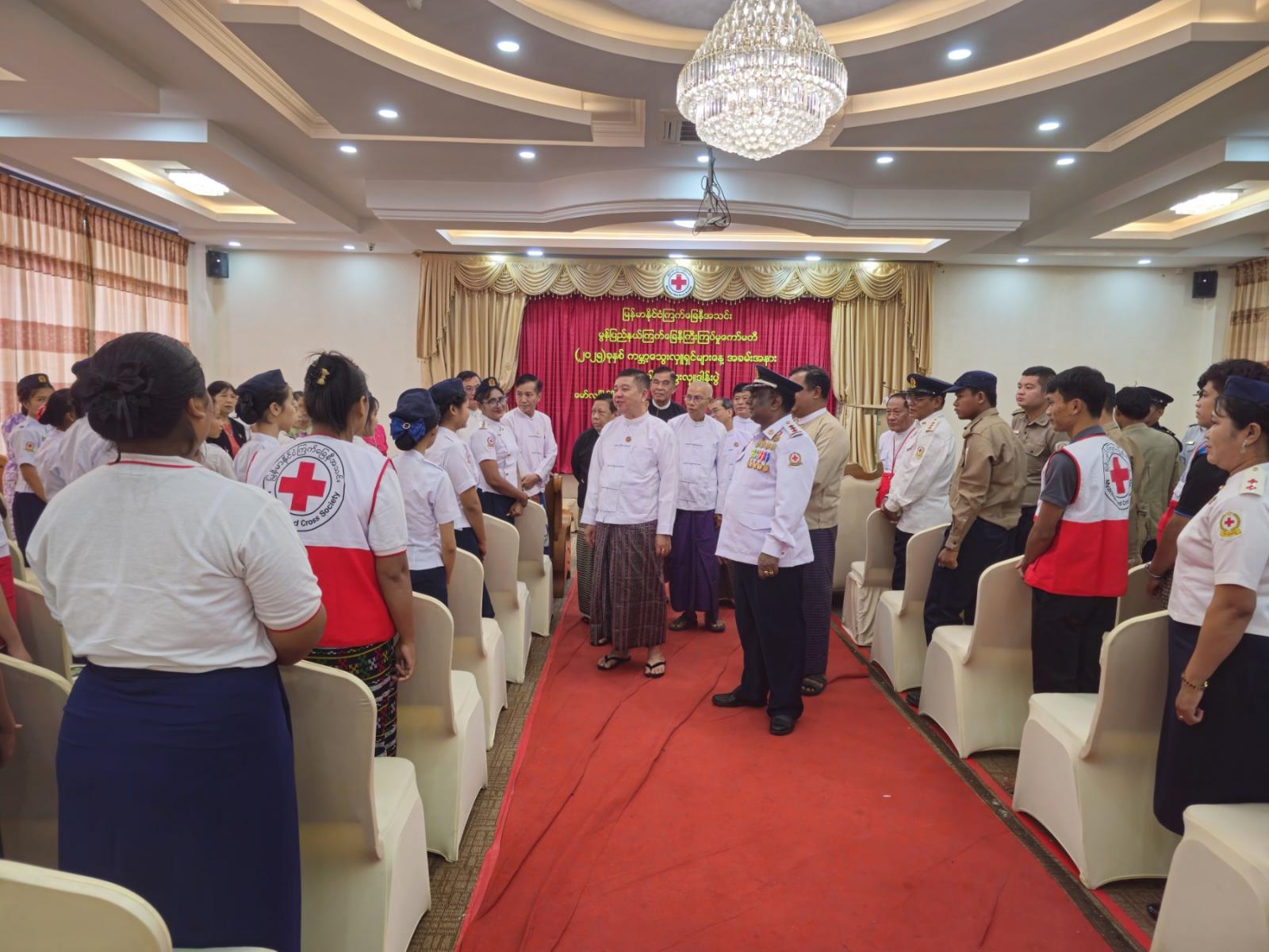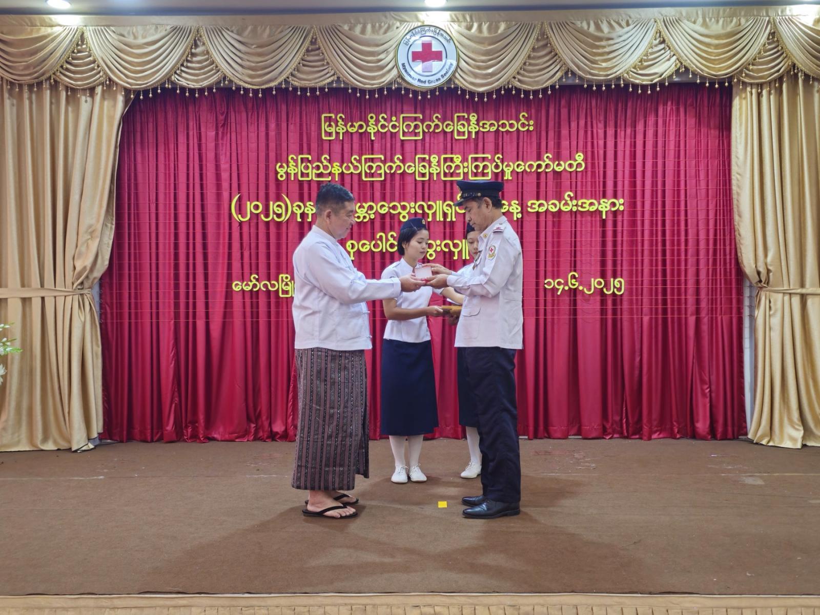 ထို့နောက် ပြည်နယ်ဝန်ကြီးချုပ်က ကြက်ခြေနီသူနာပြုတပ်ဖွဲ့ လုပ်သက် (၃၀) နှစ်ပြည့် တပ်ဖွဲ့ဝင် (၂) ဦးအား ဂုဏ်ထူးဆောင်တံဆိပ်ချီးမြှင့်ပေးသည်။