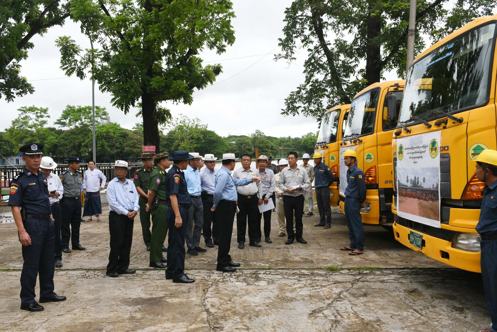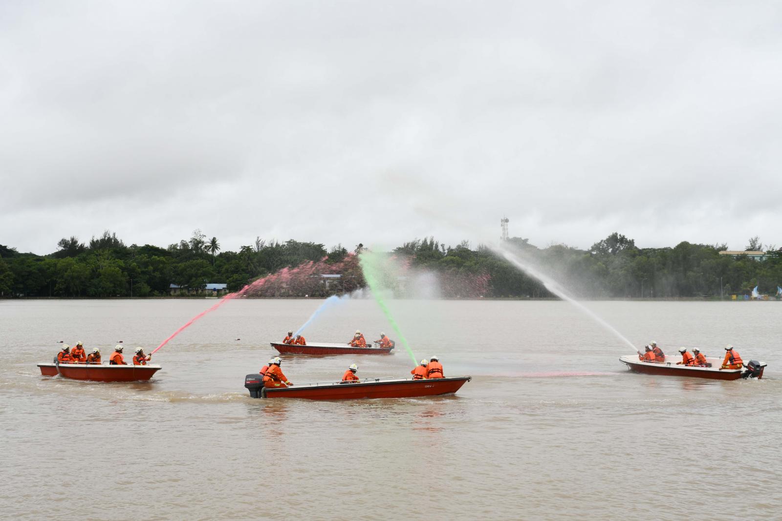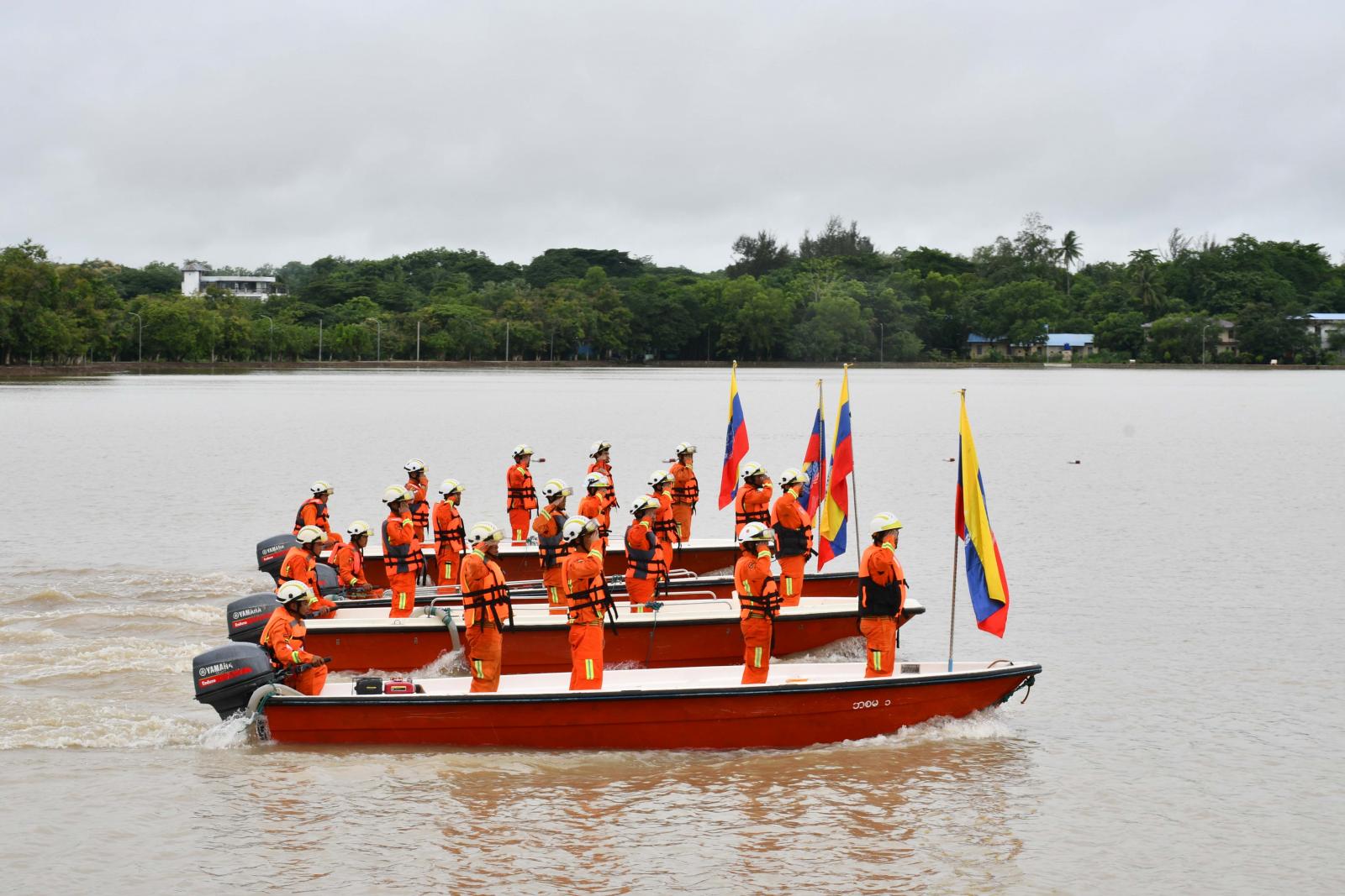 ဦးစွာ ရေပြင်ရှာဖွေကယ်ဆယ်ရေးအဖွဲ့ဝင်များက ရှာဖွေကယ်ဆယ်ရေးရေယာဉ်(၄)စီး၊ တပ်ဖွဲ့ဝင်(၂၀)ဦးဖြင့် ပြည်နယ်ဝန်ကြီးချုပ်အား အလေးပြုကြပြီး အနှေးမောင်း၊ အမြန်မောင်း စွမ်းရည်များ သရုပ်ပြသကာ မိုးလေဝသနှင့် ဇလဗေဒဦးစီးဌာန၊ ဘေးအန္တရာယ်ဆိုင်ရာ စီမံခန့်ခွဲမှုဦးစီးဌာန၊ မီးသတ်တပ်ဖွဲ့၊ ပြန်ကြားရေးနှင့်ပြည်သူ့ဆက်ဆံရေးဦးစီးဌာနမှ ဝန်ထမ်းများ ပူးပေါင်း၍ မြစ်ရေကြီးမှု အခြေအနေကို ပြည်သူအများ သတိပြုမိစေရန် လှည့်လည်နှိုးဆော် သရုပ်ပြကြသည်။