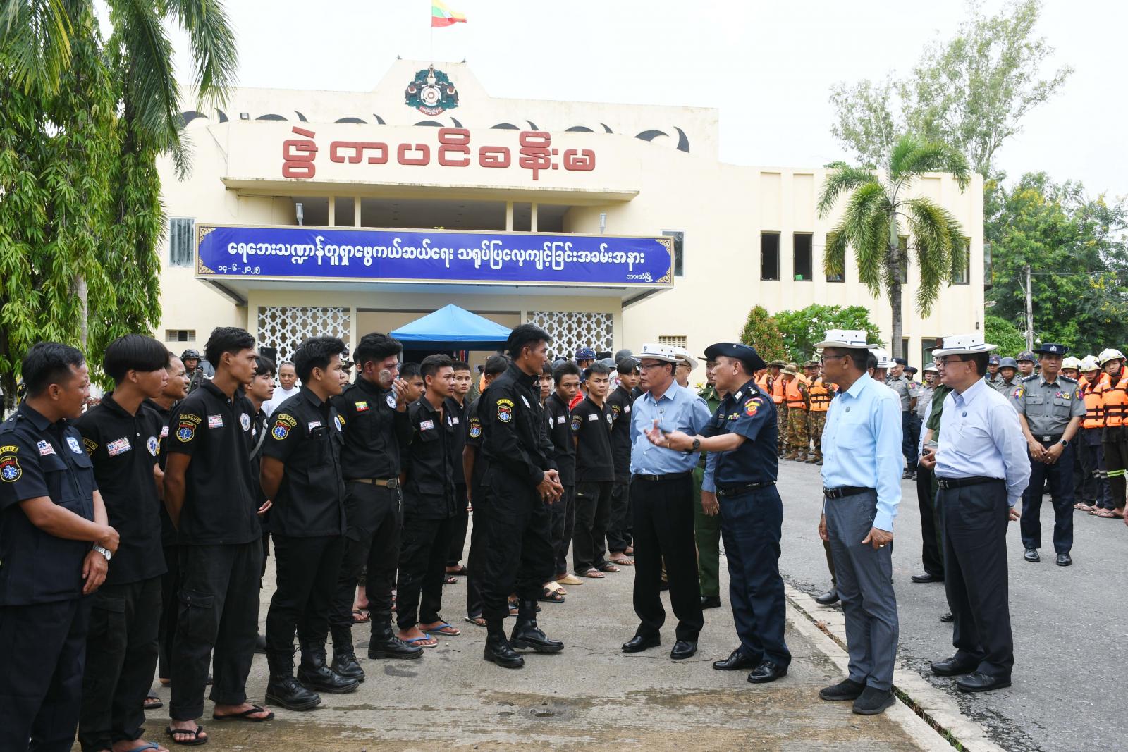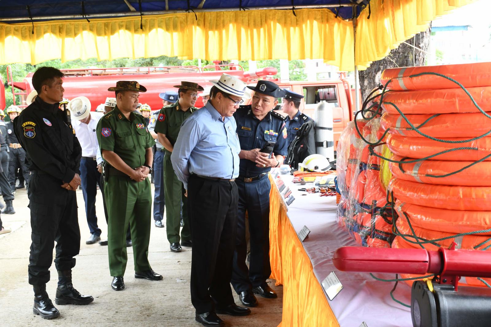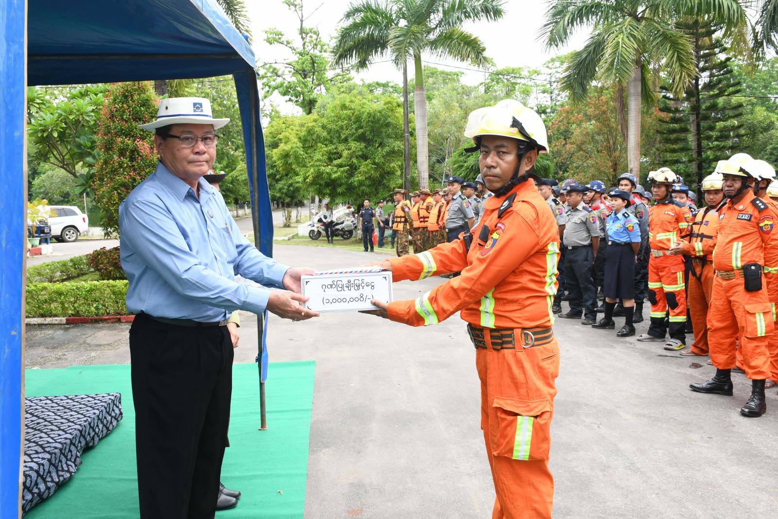 ယင်းနောက် ပြည်နယ်ဝန်ကြီးချုပ်နှင့်အဖွဲ့သည် သဘာဝဘေးအန္တရာယ်ဖြစ်ပွားလာပါက ချက်ချင်းတုံ့ပြန် ဆောင်ရွက်နိုင်ရေးအတွက် စုဖွဲ့ထားရှိသည့် တပ်မတော်သားများ၊ ရဲတပ်ဖွဲ့၊ မီးသတ်တပ်ဖွဲ့၊ ကြက်ခြေနီသူနာပြုတပ်ဖွဲ့၊ ဌာနဆိုင်ရာများ၊ လူမှုကယ်ဆယ်ရေးအဖွဲ့နှင့် လူမှုရေးအသင်းအဖွဲ့များအား ရင်းရင်းနှီးနှီးတွေ့ဆုံနှုတ်ဆက်ပြီး သဘာဝဘေးအန္တရာယ်ဖြစ်ပွားပါက ချက်ချင်းတုံ့ပြန်ဆောင်ရွက်နိုင်ရေးအတွက် စုဖွဲ့ထားရှိသည့် ရှာဖွေကယ်ဆယ်ရေး သုံးပစ္စည်းများ၊ ယာဉ်/ယန္တရားများနှင့် ဘေးအန္တရာယ်စီမံခန့်ခွဲမှုဦးစီးဌာနက ထောက်ပံ့ပေးမည့် ပစ္စည်းများကို လှည့်လည်ကြည့်ရှုစစ်ဆေးကာ ရေဘေးသဏ္ဍာန်တူရှာဖွေကယ်ဆယ်ရေး သရုပ်ပြလေ့ကျင့်မှုတွင် ပါဝင်သရုပ်ပြခဲ့သူ များနှင့်တွေ့ဆုံ၍ ယနေ့သဏ္ဍာန်တူသရုပ်ပြသမှုသည် အမှန်တကယ် ဖြစ်ပေါ်လာမည့်သဘာဝဘေးကို ရင်ဆိုင်တုံ့ပြန် နိုင်ရန် ကြိုတင်ဇာတ်တိုက်လေ့ကျင့်ခြင်းဖြစ်ပြီး မိမိတို့၏သက်ဆိုင်ရာ နယ်ပယ်အသီးသီးတွင် ကျွမ်းကျင်မှုရှိစေရန် အစဉ်တစ်စိုက်ကြိုးပမ်း လေ့ကျင့်ထားရမည်ဖြစ်ကြောင်း၊ သဘာဝဘေးကျရောက်နေစဉ်အတွင်း ပြည်သူတို့၏ အသက် အိုးအိမ်စည်းစိမ်ကို ကာကွယ်စောင့်ရှောက်နိုင်ရန် ကျန်းမာရေးကိုအထူးအလေးထား ကြစေလိုကြောင်း ပြောကြားကာ ဂုဏ်ပြုချီးမြှင့်ငွေကျပ်(၁၀)သိန်းကို ပေးအပ်ချီးမြှင့်သည်။
