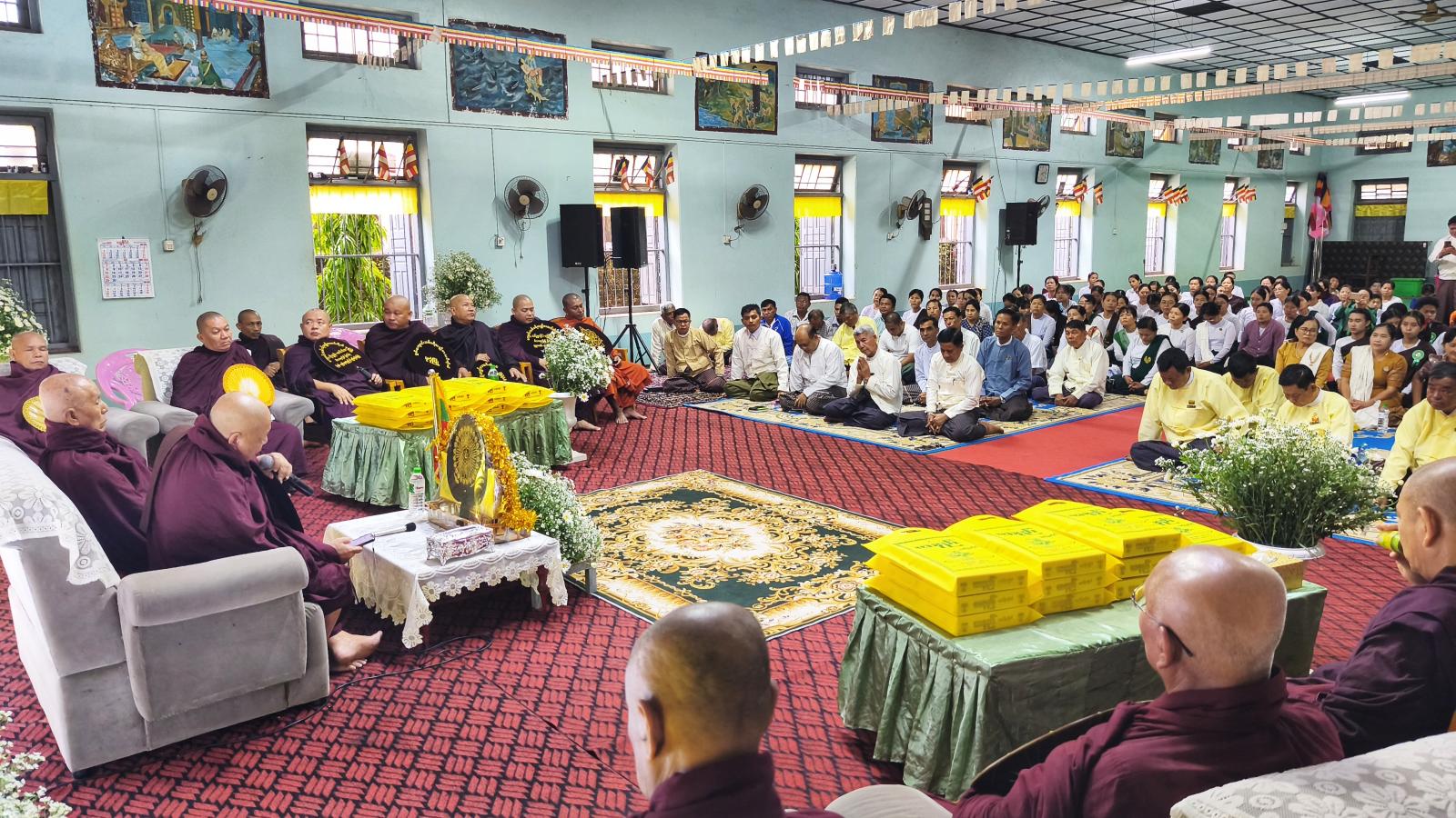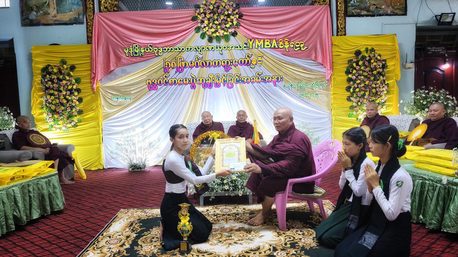 ဦးစွာ နမောတဿ သုံးကြိမ်ရွတ်ဆို ဘုရားကန်တော့၍ အခမ်းအနားအား စတင်ဖွင့်လှစ်ခဲ့ပြီး ဓမ္မရာဇိန်ကျောင်းဦးစီပဓာနနာယက ဆရာတော်ကြီးထံမှ ပြည်နယ်ဝိုင်အမ်ဘီအေအသင်းနာယက ဦးဝင်းနိုင်ဦး၊ မုဒုံမြို့နယ်တပ်နယ်မှူး၊ မုဒုံမြို့နယ်စီမံအုပ်ချုပ်ရေးအဖွဲ့၊ မြို့နယ်ဌာနဆိုင်ရာ တာဝန်ရှိသူများ၊ ပြည်နယ်/ မြို့နယ် (YMBA)အသင်း၊ ဆရာ/ဆရာမများနှင့် ကျောင်းသား/သူများက သီလတော်မြတ် ခံယူဆောက်တည်ကြ၍ သြဝါဒကထာ ချီးမြှင့်ခဲ့သည်။ ထို့နောက် သြဝါဒစရိယဆရာတော်ကြီးများအား တာဝန်ရှိသူများက ဝါဆိုသင်္ကန်းနှင့် လှူဖွယ်ဝတ္ထုပစ္စည်းများကို ဆပ်ကပ်လှူဒါန်းခဲ့သည်။ ထို့နောက် (၃၈) ဖြာမင်္ဂလာတရားတော်နှင့် ဗုဒ္ဓဝင်စာမေးပွဲတွင် ဗဟိုအဆင့်၊ ပြည်နယ်၊ မြို့နယ်တို့တွင် ထူချွန်းစွာအောင်မြင်ခဲ့ကြသည့် ကျောင်းသား/သူ (၈၂) ဦးအား အောင်လက်မှတ်နှင့် ဆုများကို အသီးသီး ပေးအပ်ချီးမြှင့်ခဲ့သည်။