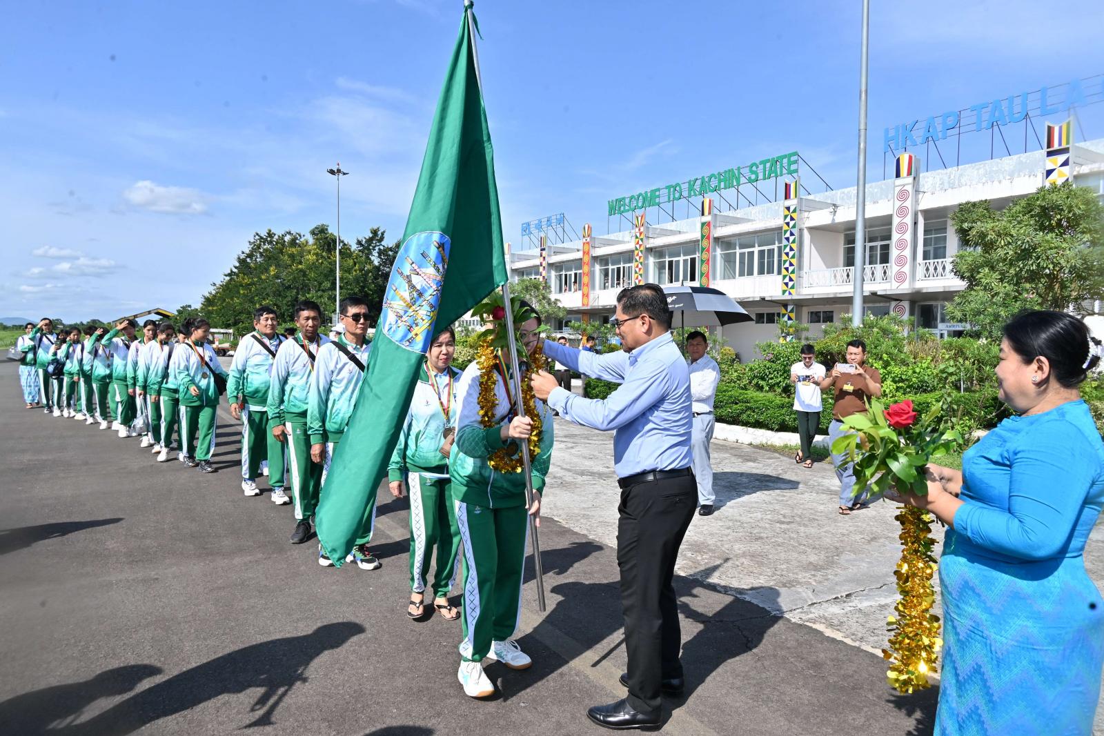 ကချင်ပြည်နယ်ဝန်ကြီးချုပ် မူးယစ်ကင်းစင်သင်တန်းကျောင်းများ စုပေါင်းမိတ်သဟာယအဖွဲ့တို့က ပူးပေါင်းကျင်းပသော အမျိုးသားဘောလုံးပြိုင်ပွဲ ဖွင့်ပွဲနှင့် ပြည်နယ်နှင့်တိုင်းဒေသကြီး အောင်ပွဲရ ပြည်နယ်ဘောလီဘောအသင်းအား လေဆိပ်၌ ကြိုဆိုဂုဏ်ပြု
